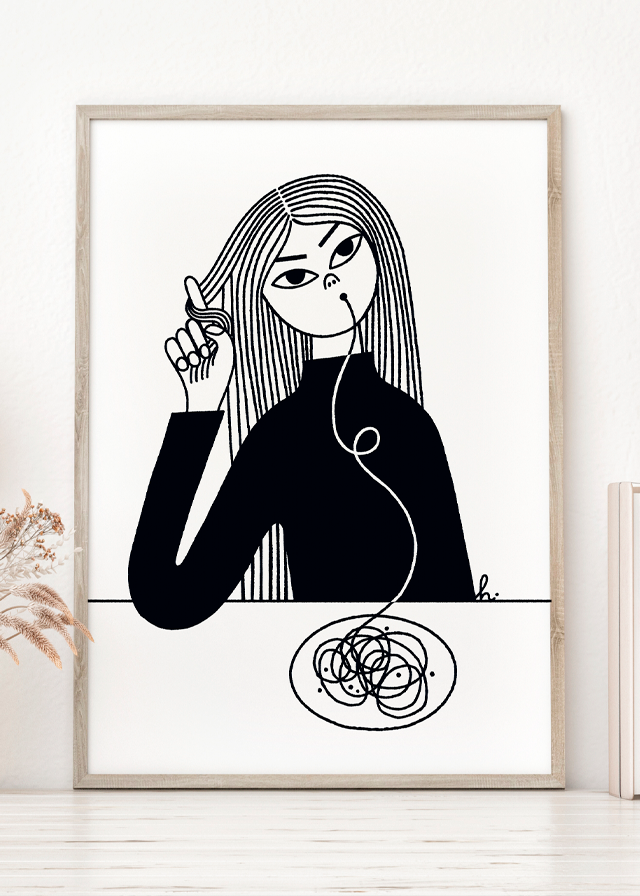 Spaghetti ist Teil meiner Illustrationsserie „Du bist, was du isst“. Ein junges Mädchen schlürft eine Spaghetti-Kette, die ihr Haar widerspiegelt. Ganz einfach.