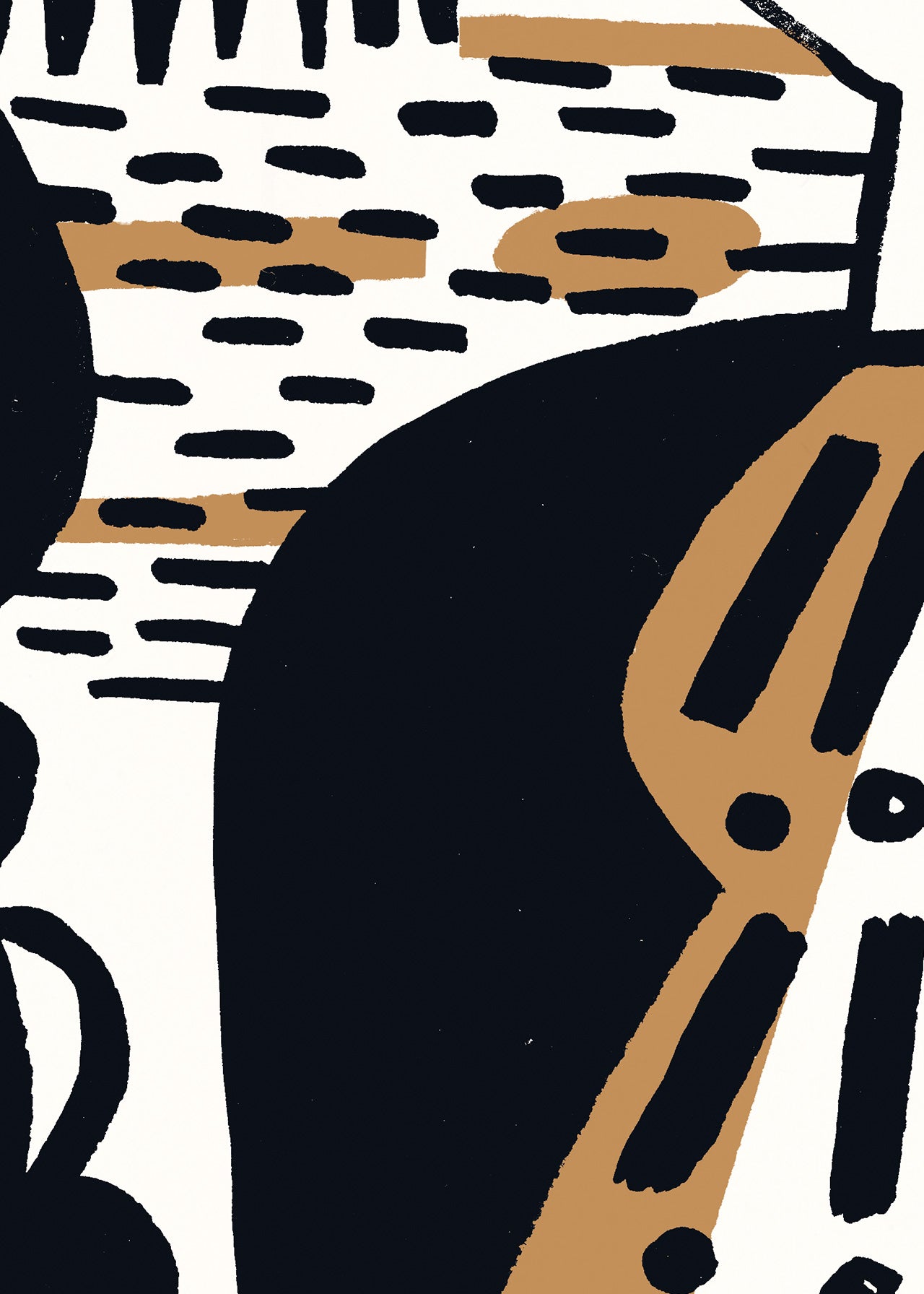 Aus meinem Skizzenbuch, Tinte auf Papier und digitale Zeichnung. Supper spielt mit der Verschmelzung von Stillleben und Porträt und verwandelt einen Esstisch in einen kubistischen Rhythmus aus Formen und Farben.