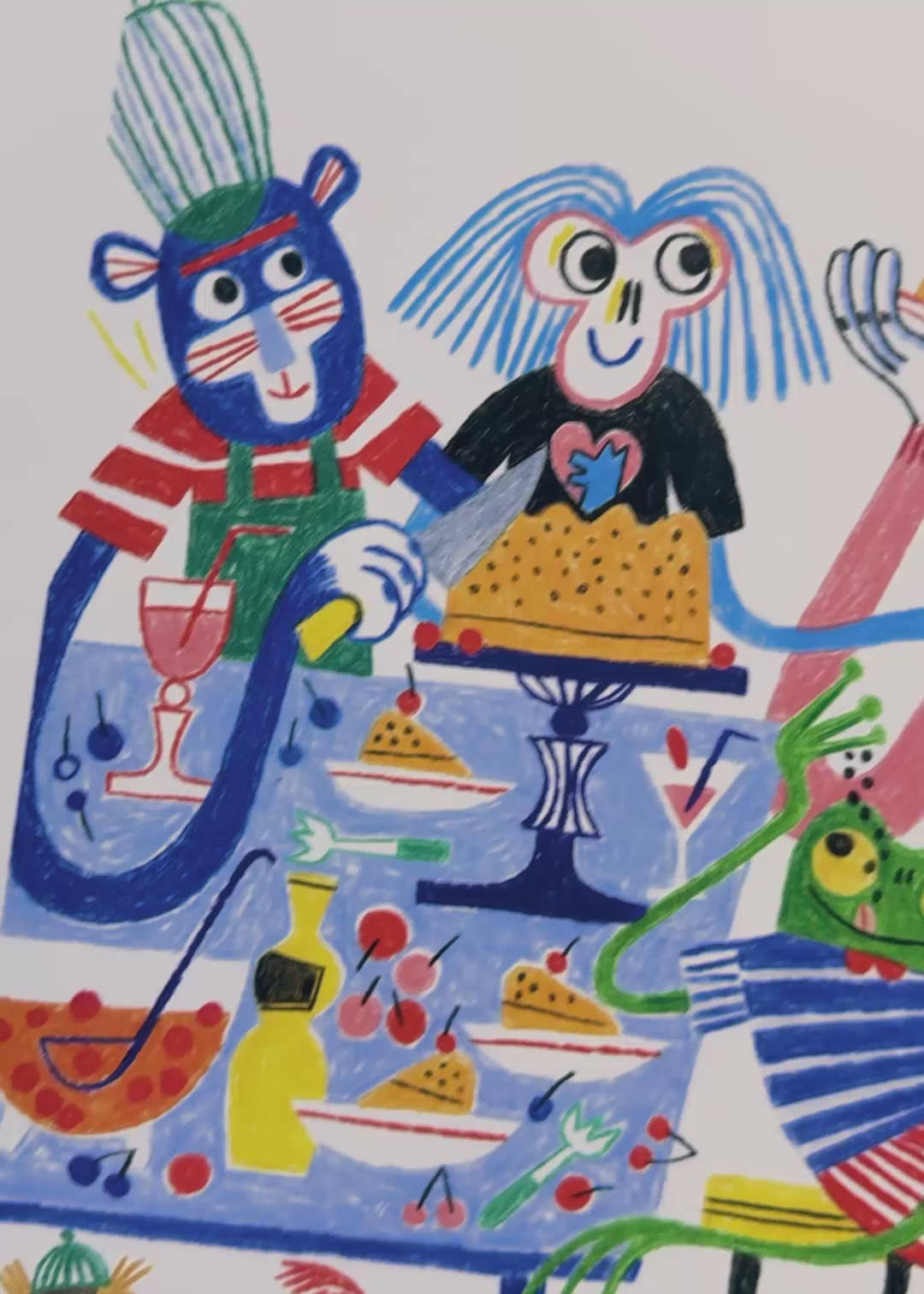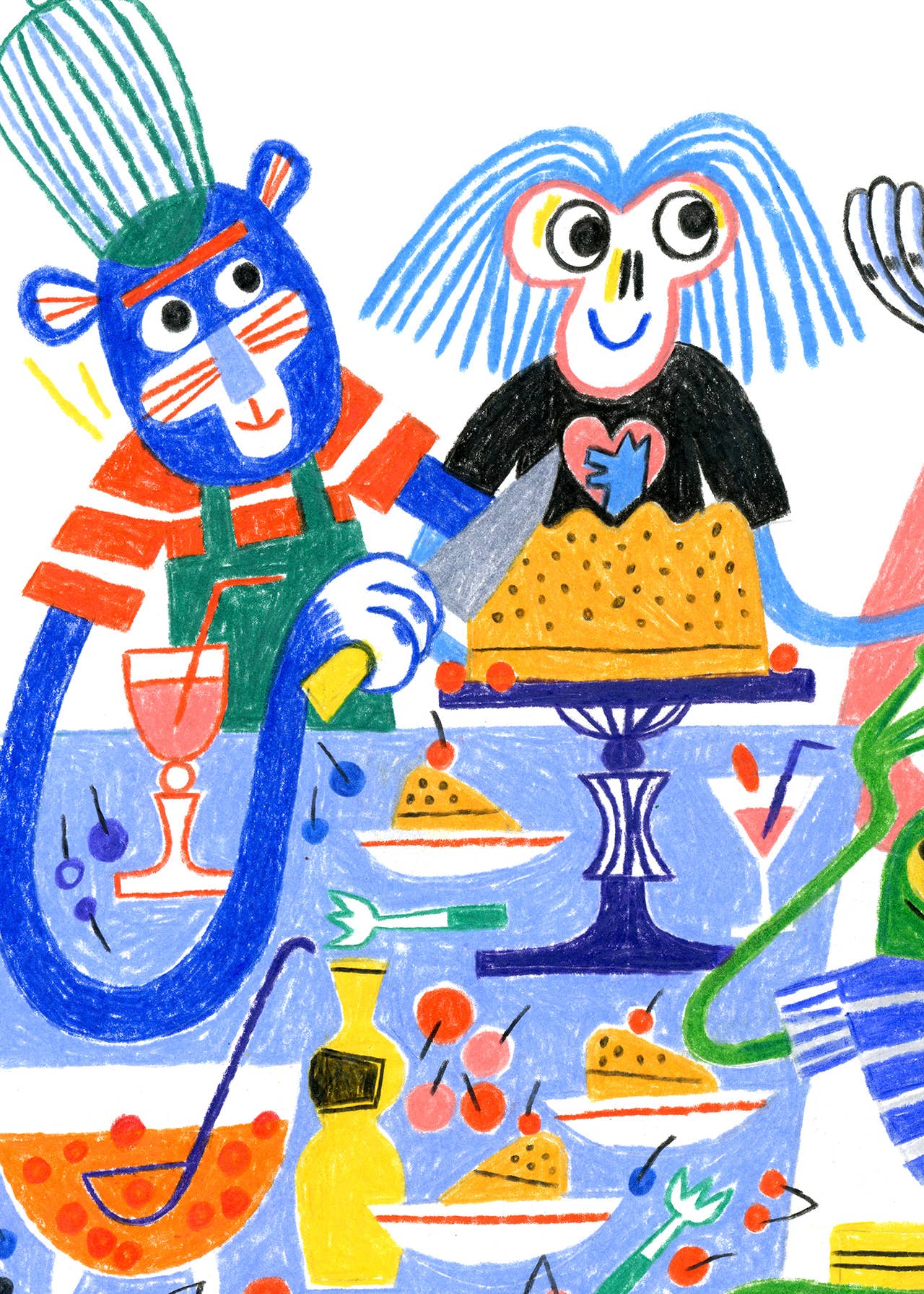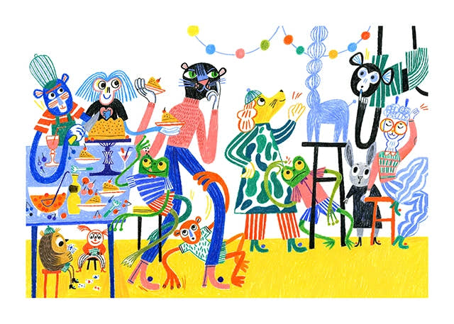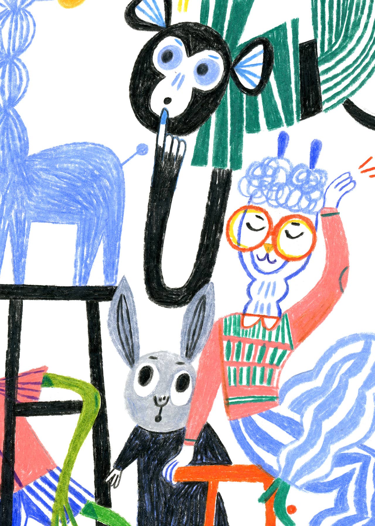 Animal party illustration from the book "Bubblegum Street no.5." At 5 p.m. bunch of animals meet on the rooftop to party! They rap, they play instruments, they dance!
