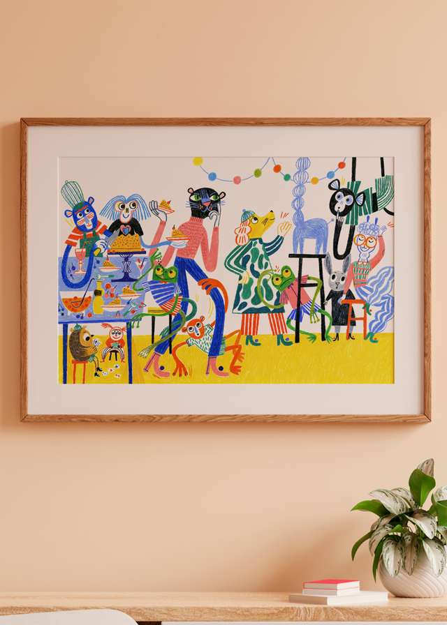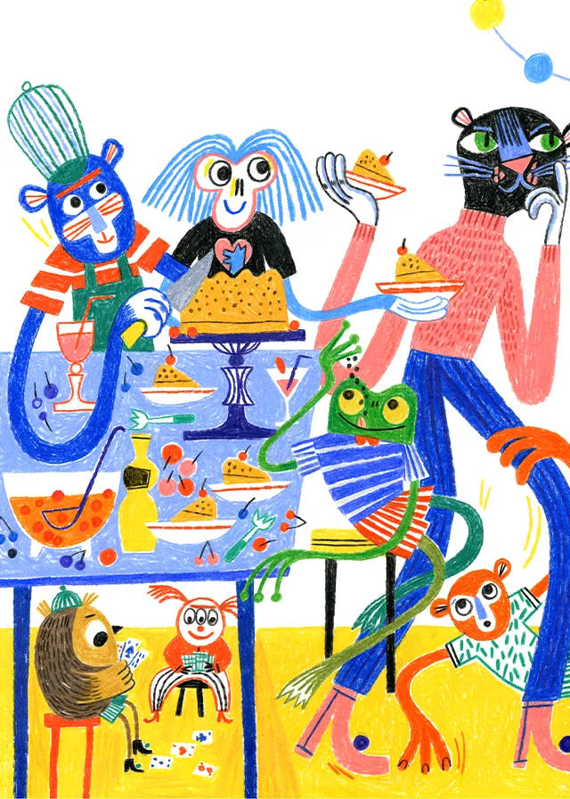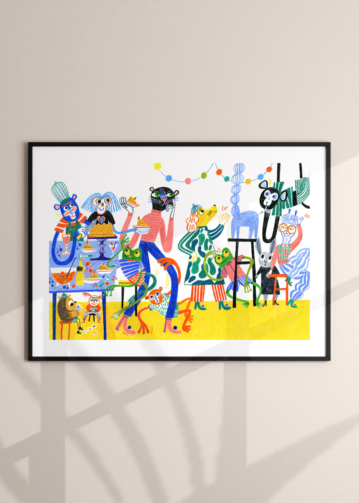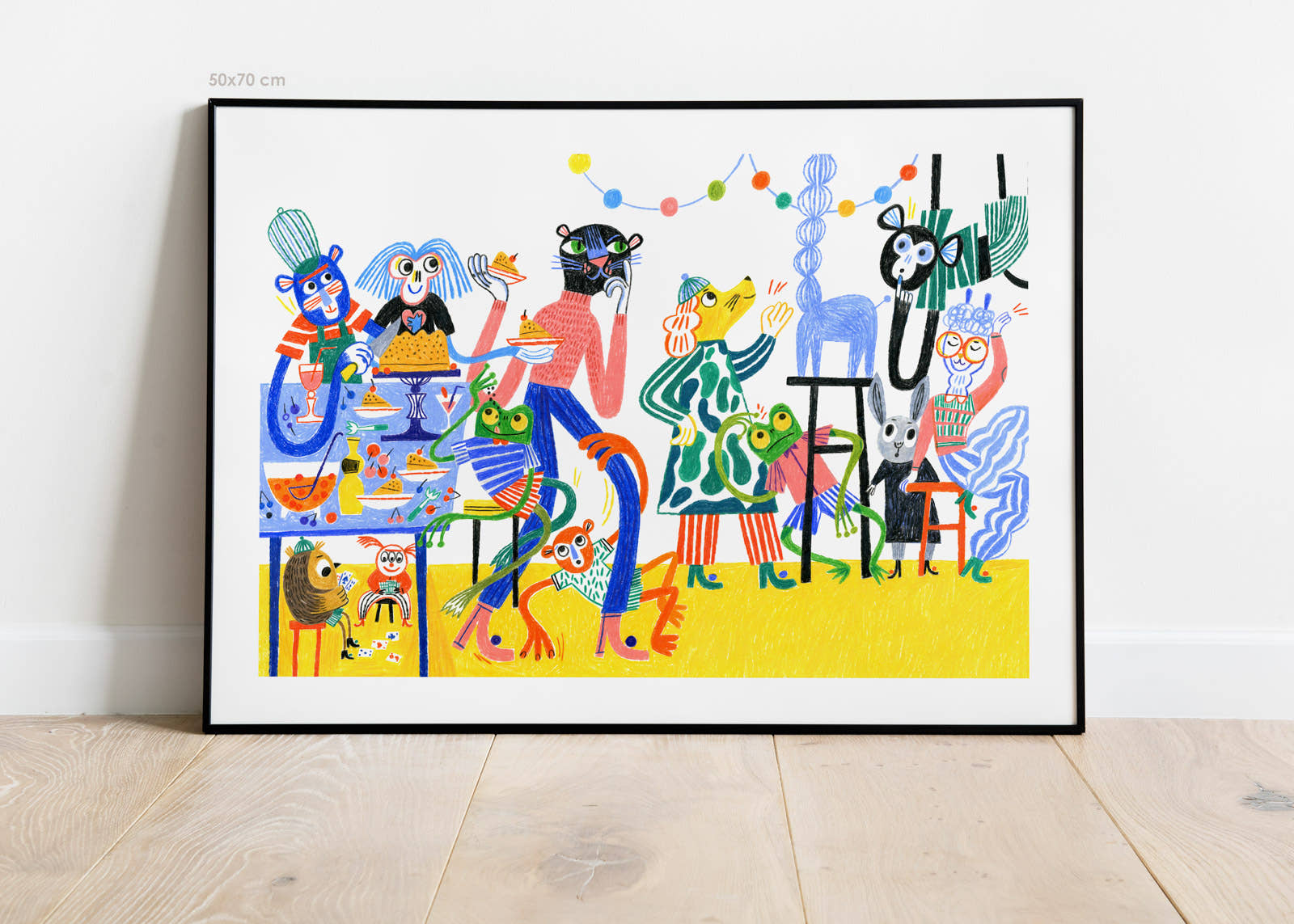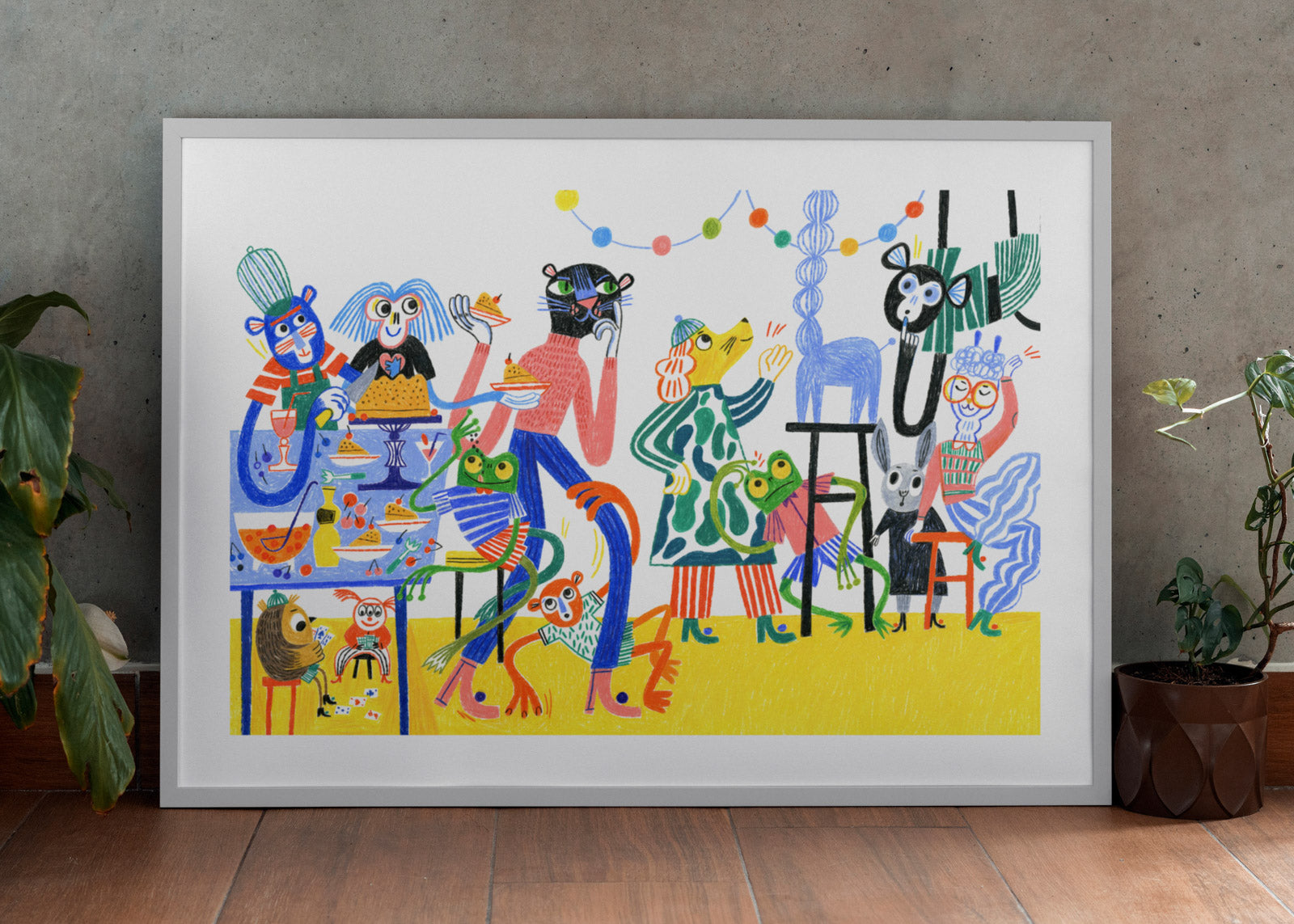 Animal party illustration from the book "Bubblegum Street no.5." At 5 p.m. bunch of animals meet on the rooftop to party! They rap, they play instruments, they dance!