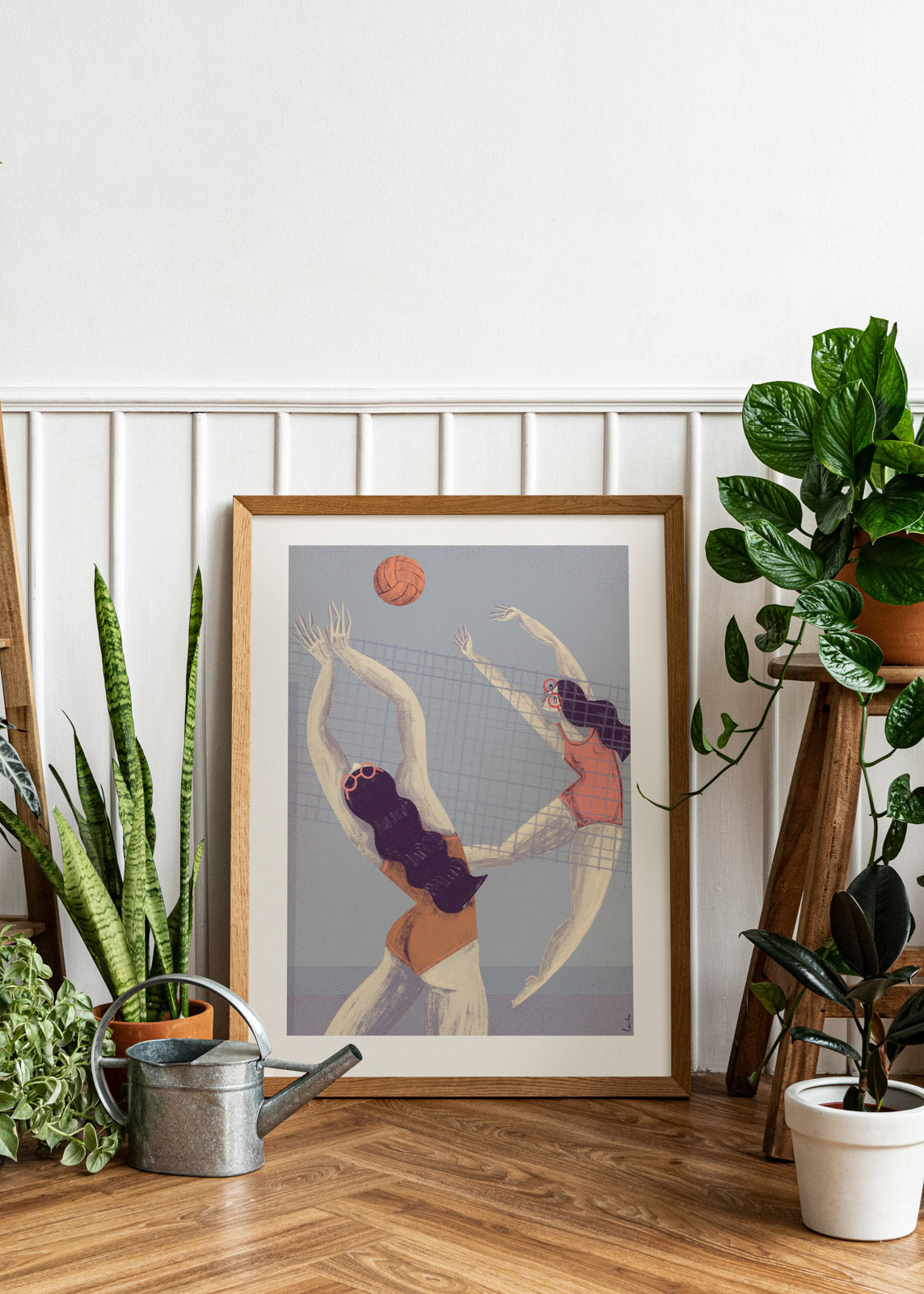 In Beach volleyball, two sun-kissed players leap in perfect sync, frozen mid-air against a hazy seaside sky. The textured strokes and dusty pastels capture the lazy heat and joyful energy.