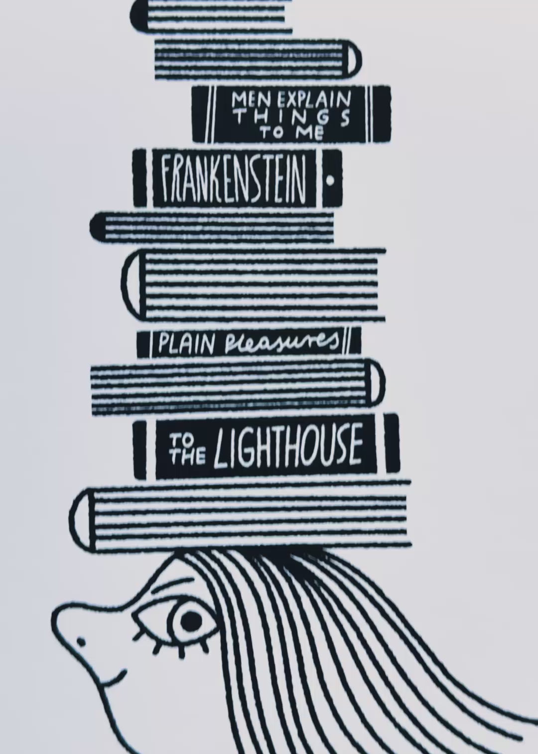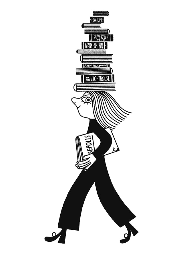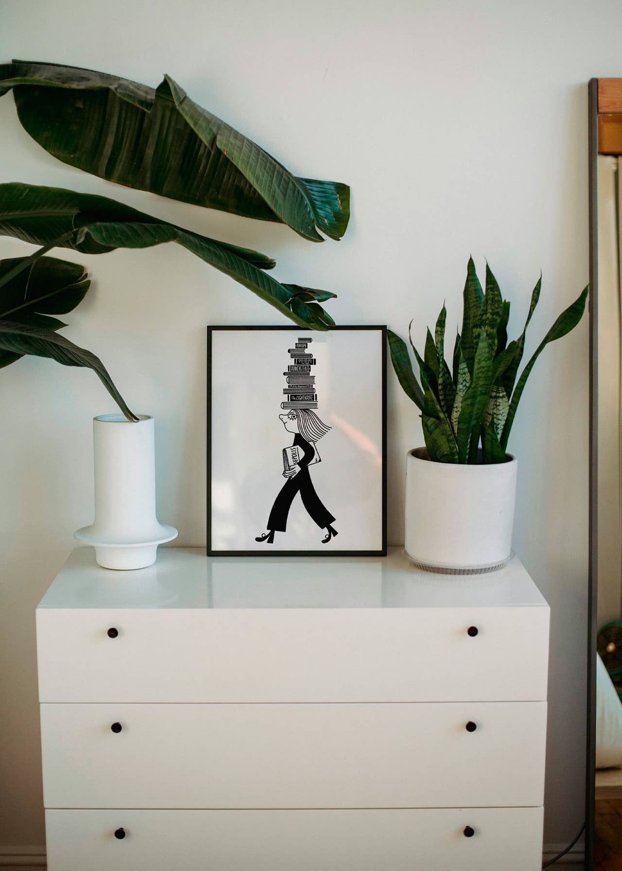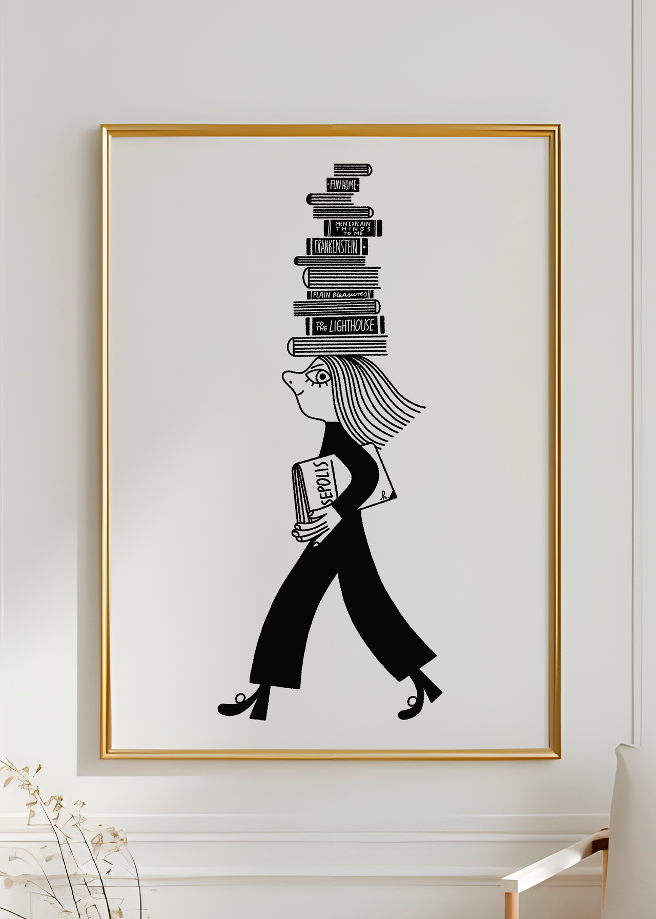 Bibliophilia, a digital illustration for all fellow book lovers: a girl carrying a stack of some of my favourite books on her head. A digital piece from my “Book Lovers” series.