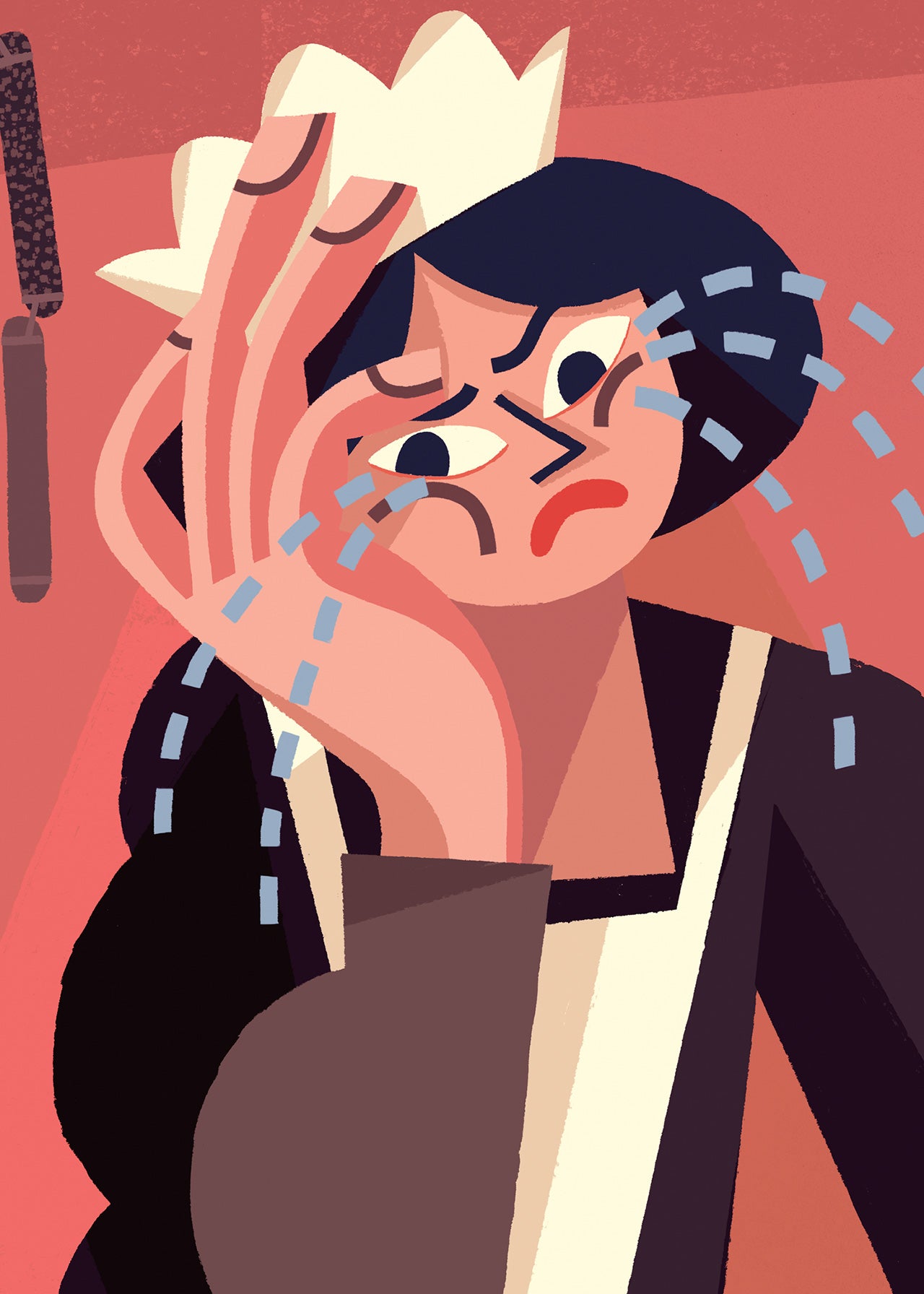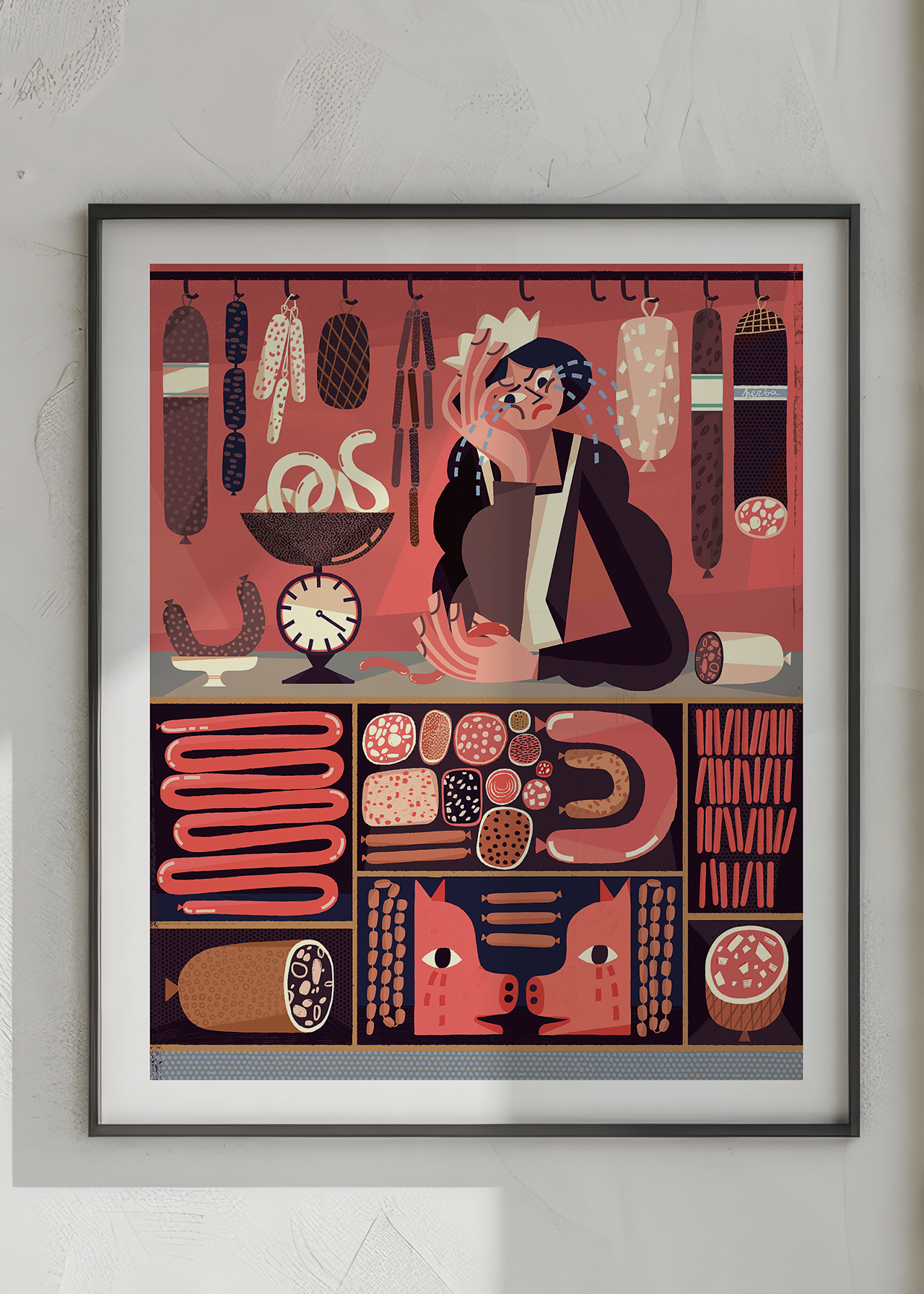 Butcher shop, a digital illustration about a butcher’s shop assistant, suddenly overcome with sadness at work.