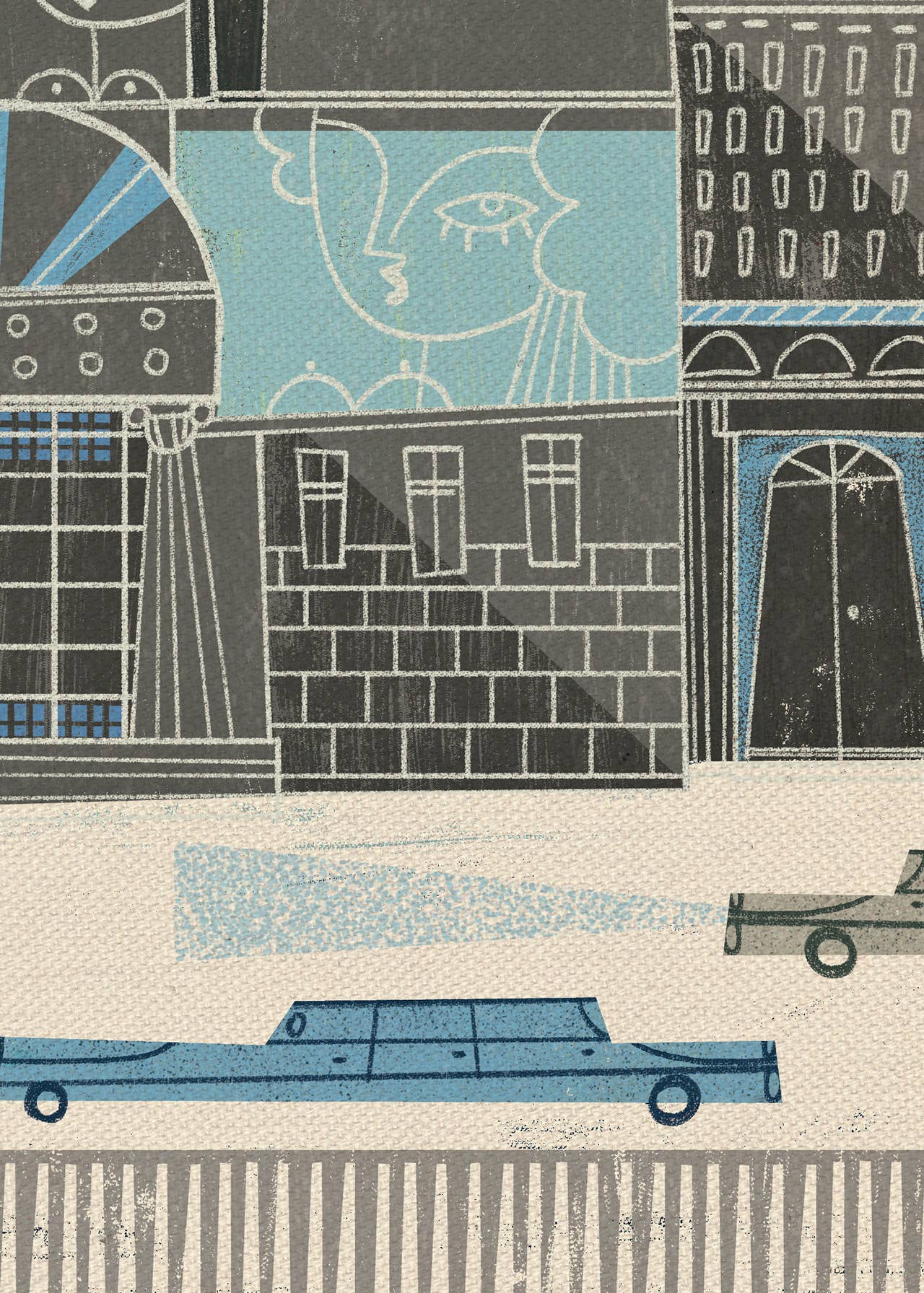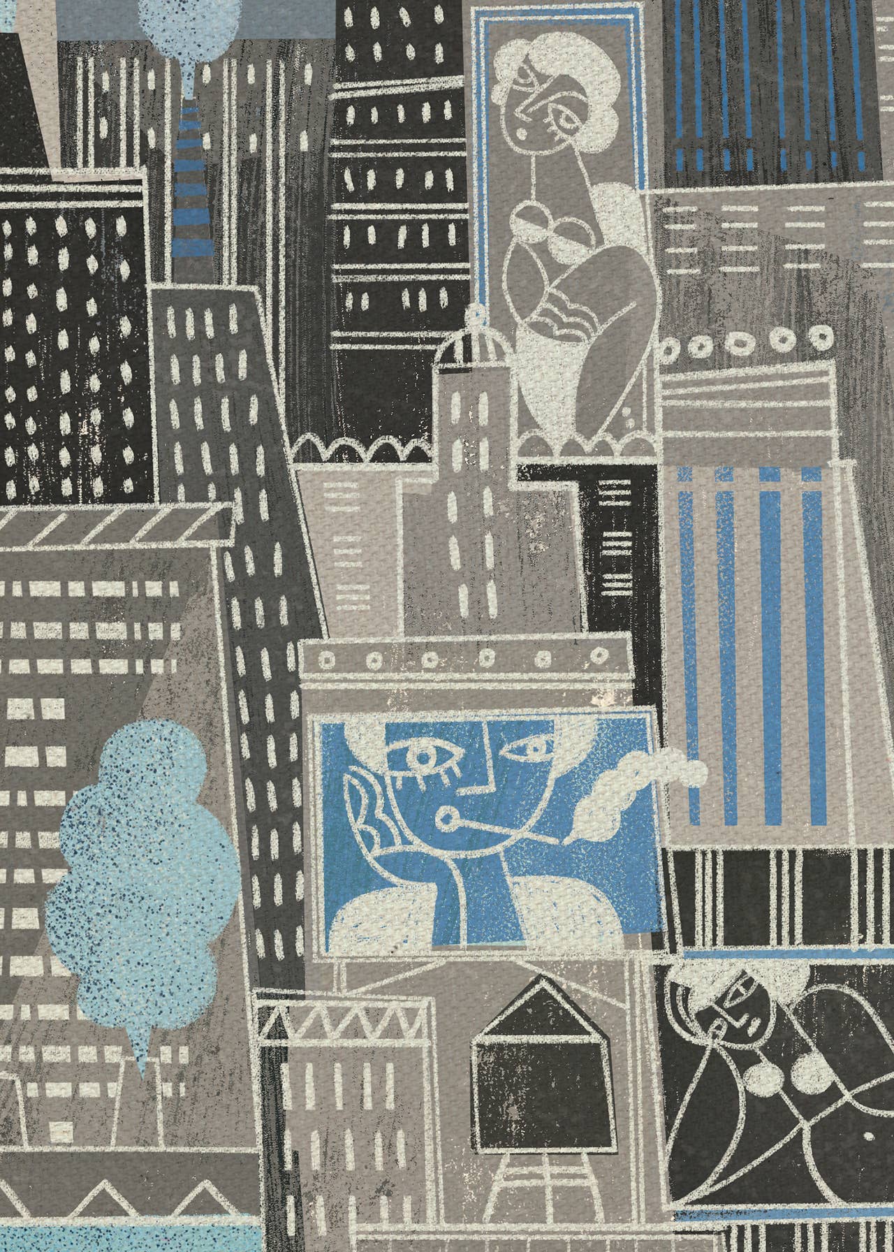 City of women, La città delle donne. There was a time when I couldn’t stop drawing city skylines. Here, in a retro digital style, I hid women’s figures inside the outlines of the buildings.