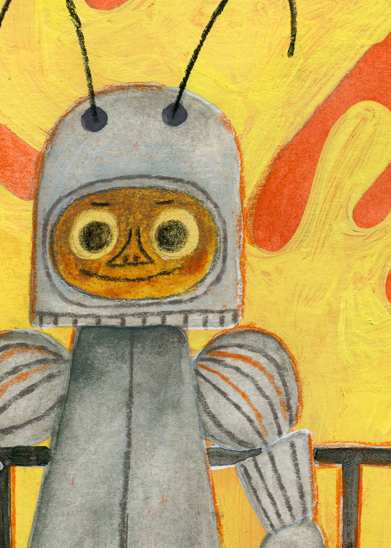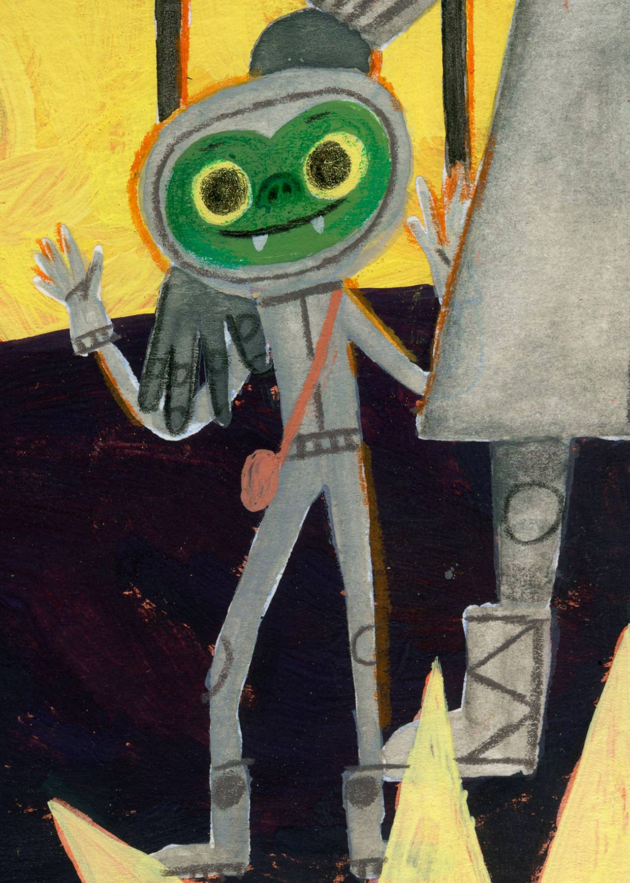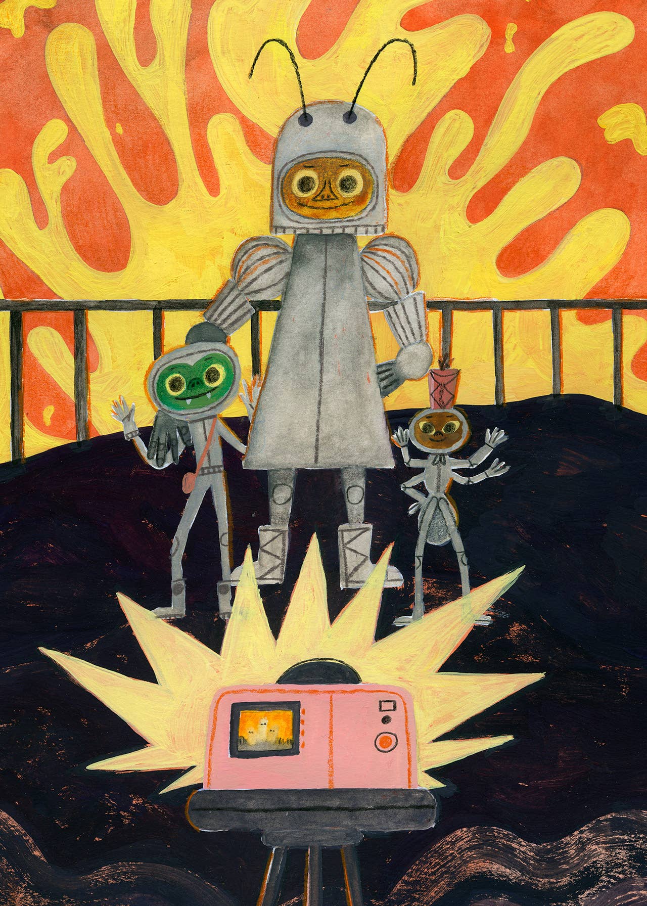 Rene, Beatrice, and the guard are taking a selfie at the Earth's core. Illustration from my book, The Underground Adventure of the Brave Frog Rene.