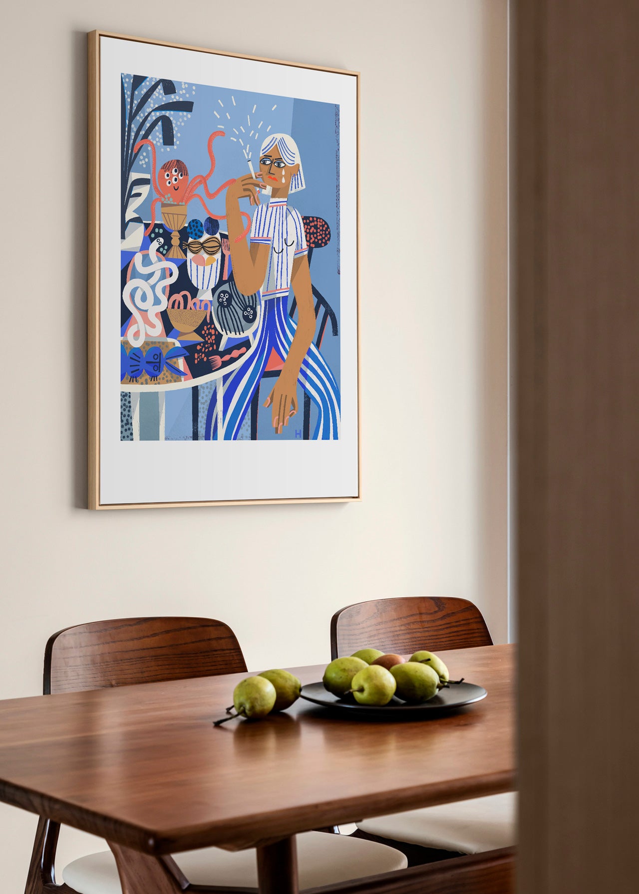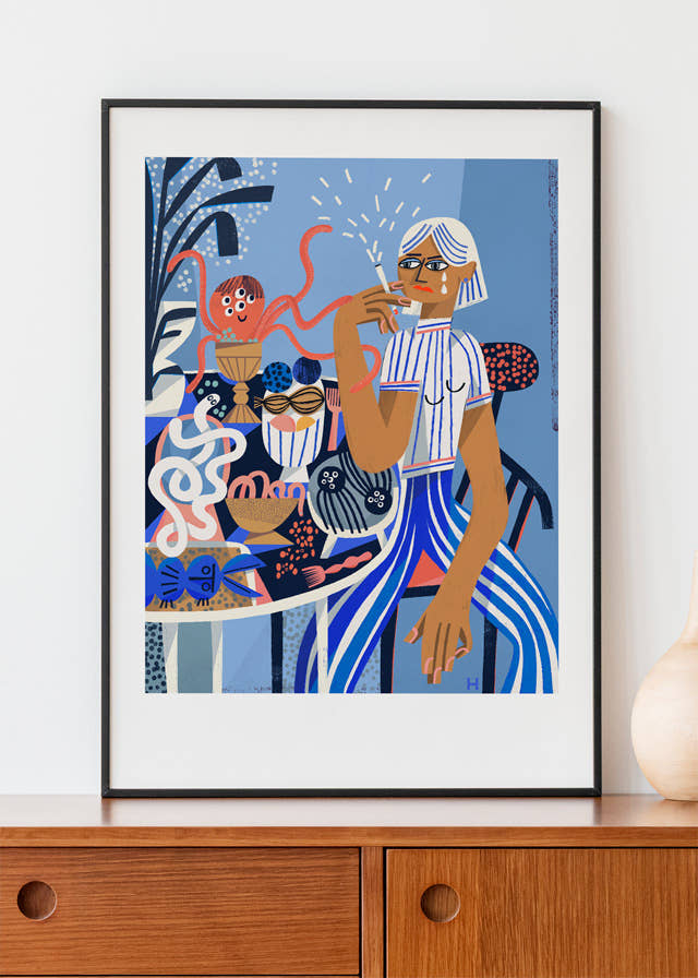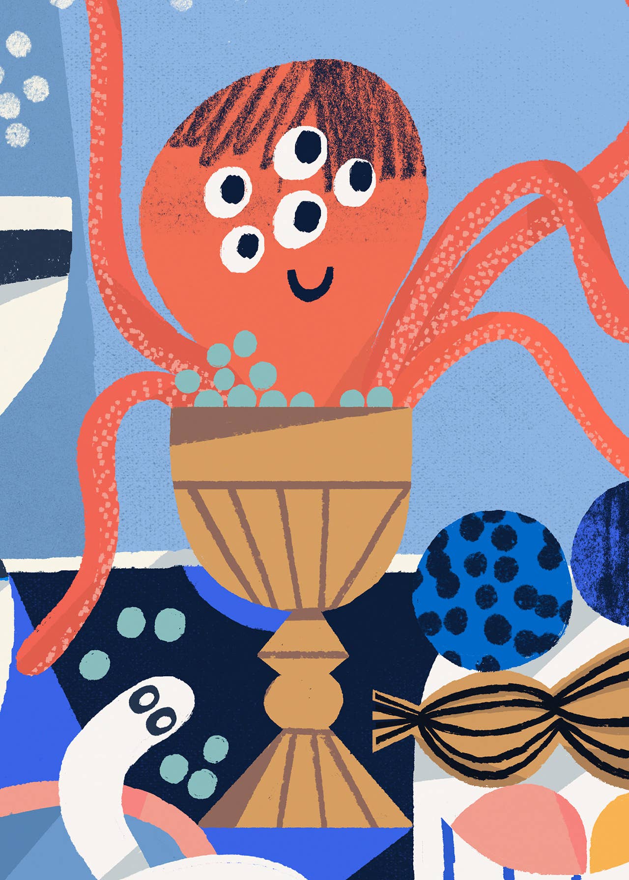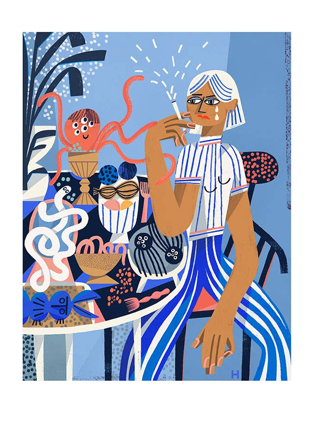Crying – two of my recurring themes meet in this image: seafood and the solitary girl. A lone diner sheds a single tear as an octopus waves hello from the salad bowl. Seaside blues and playful table details make this deliciously surreal scene.