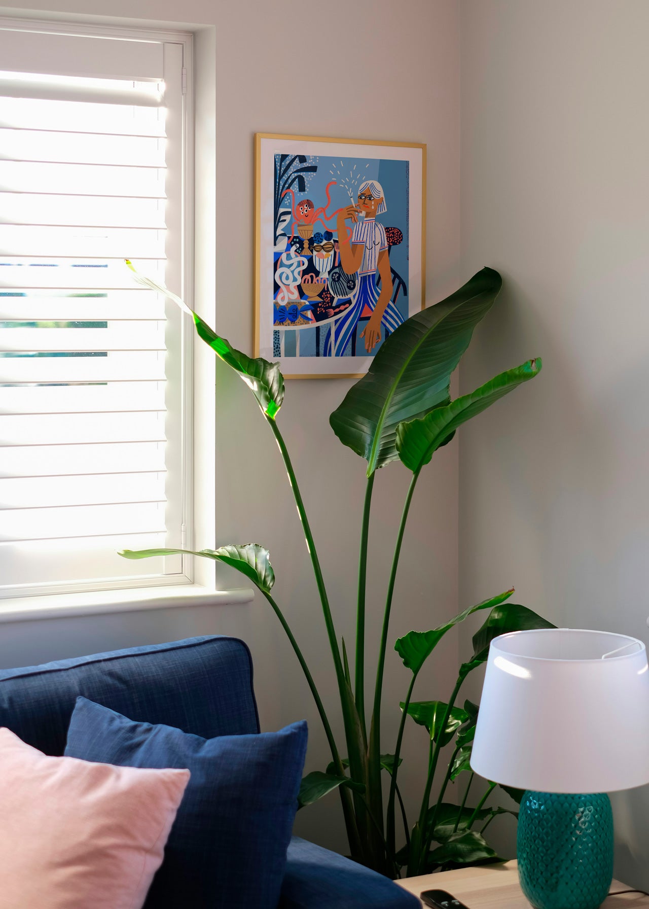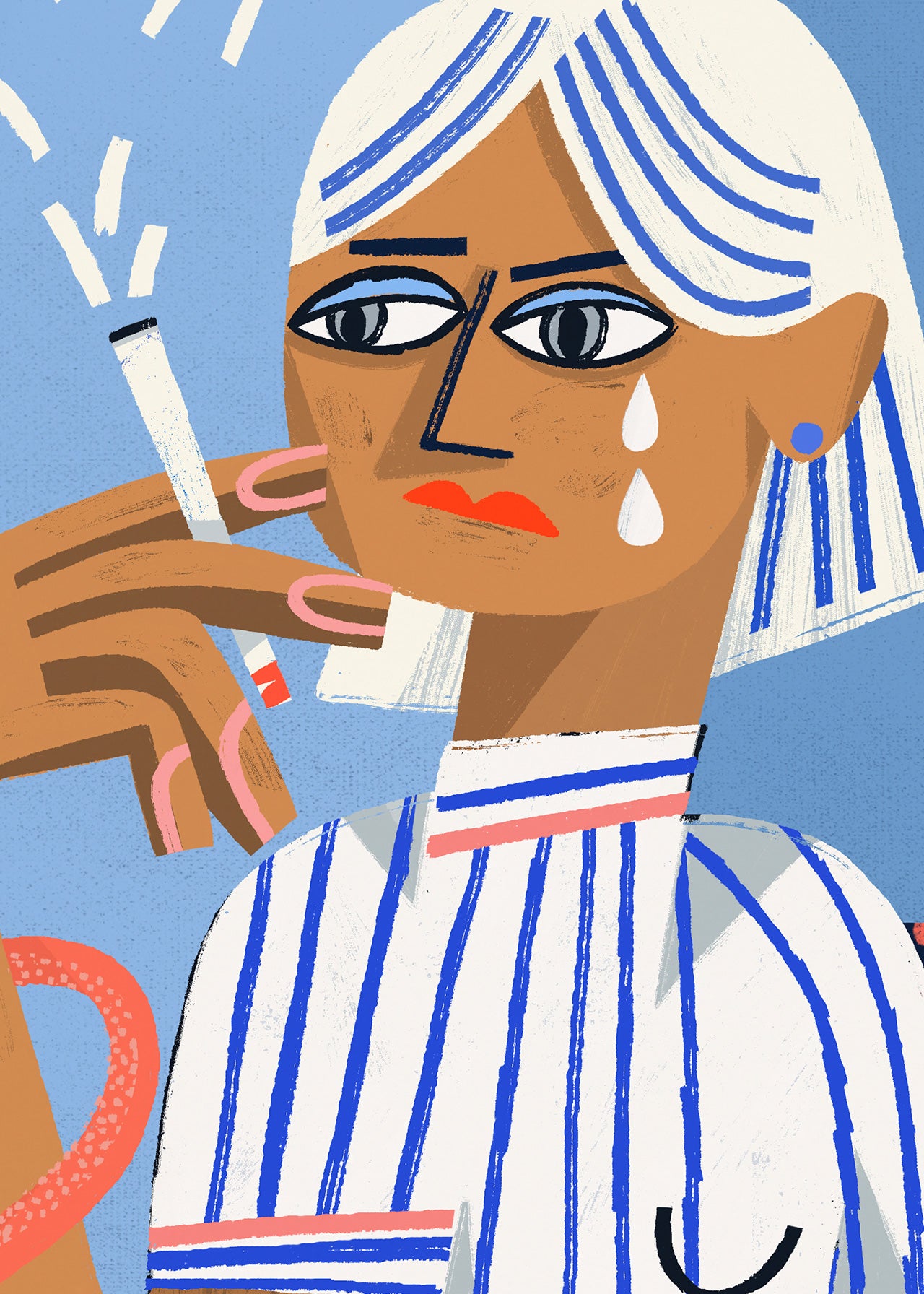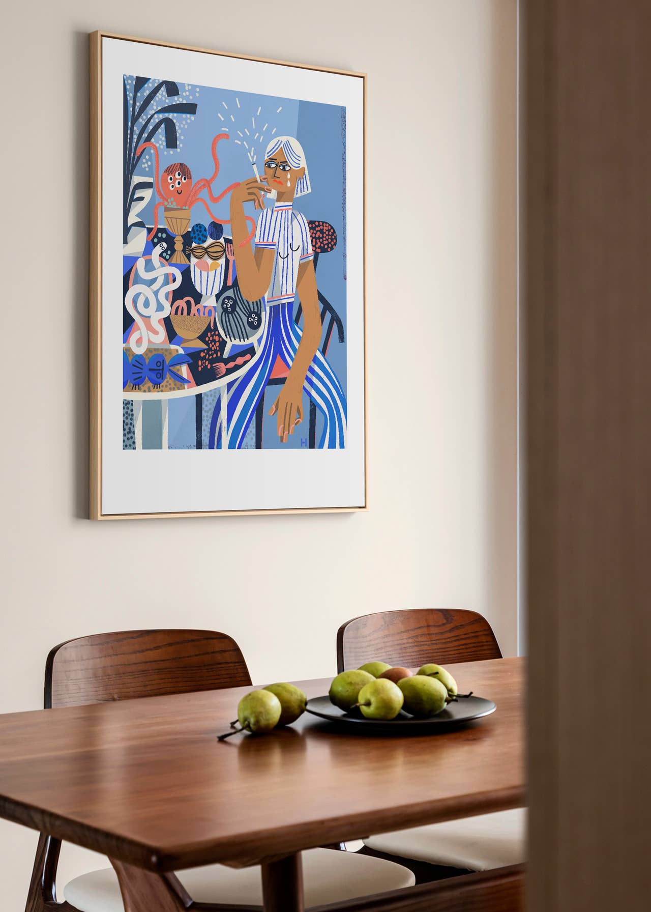 Crying – two of my recurring themes meet in this image: seafood and the solitary girl. A lone diner sheds a single tear as an octopus waves hello from the salad bowl. Seaside blues and playful table details make this deliciously surreal scene.