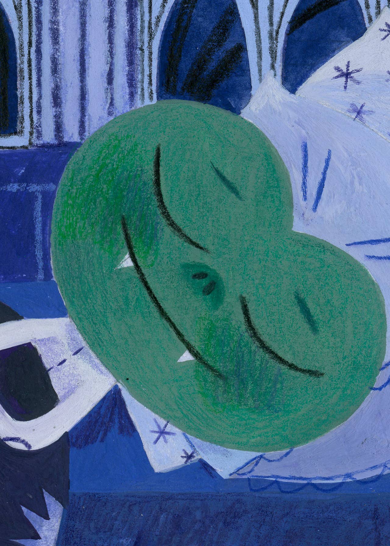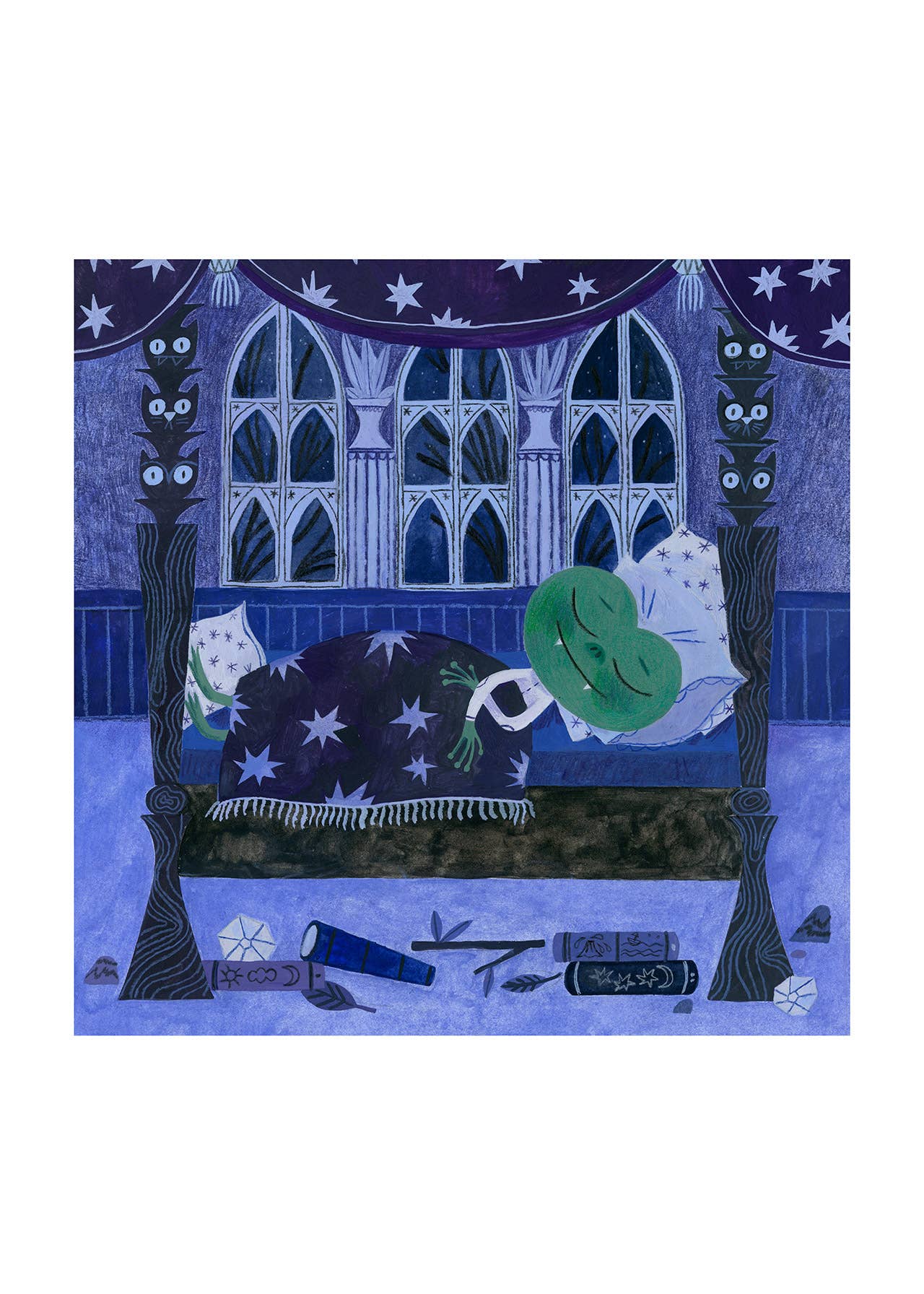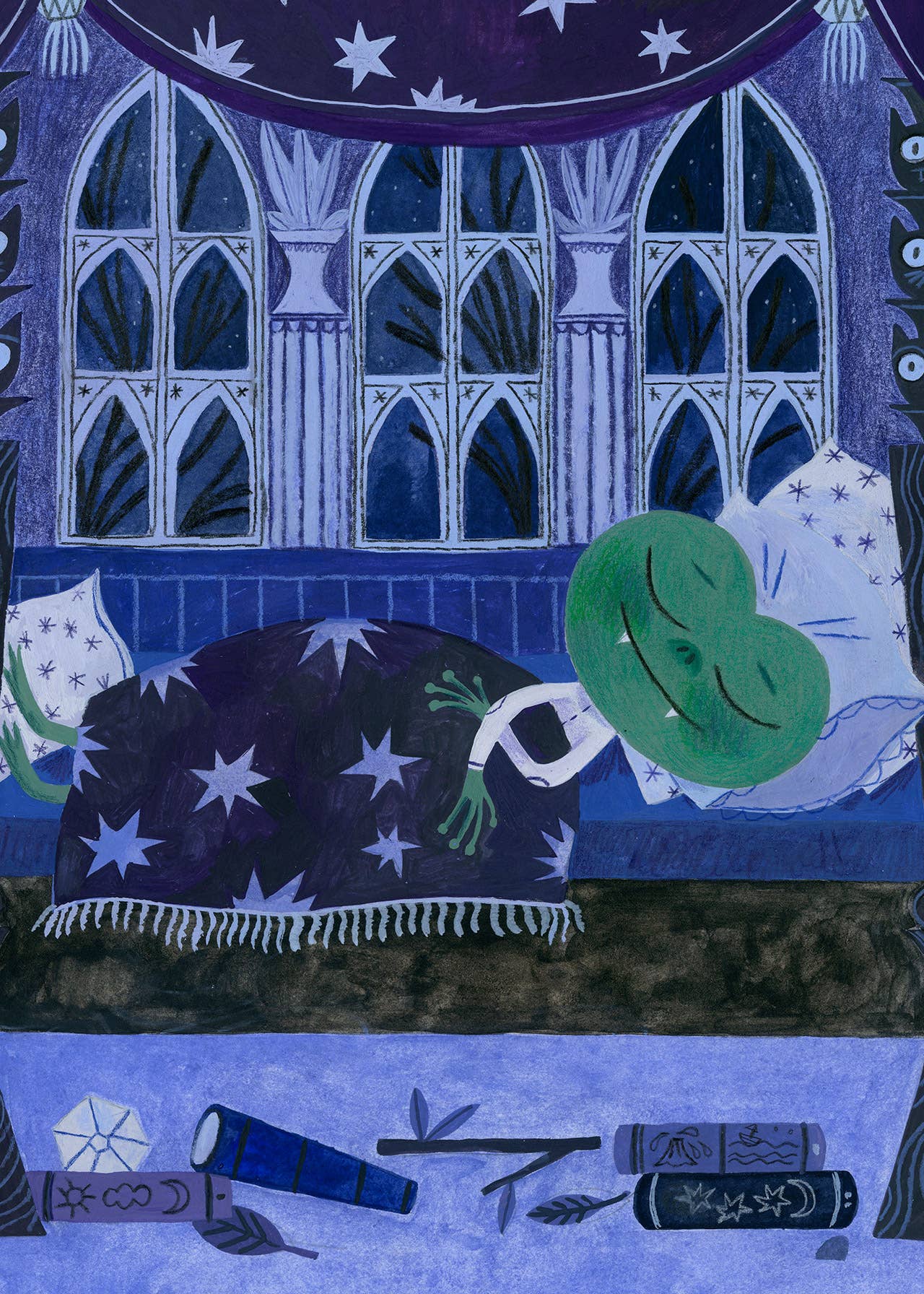 Rene is falling asleep. Illustration from my book, The Underground Adventure of the Brave Frog Rene.