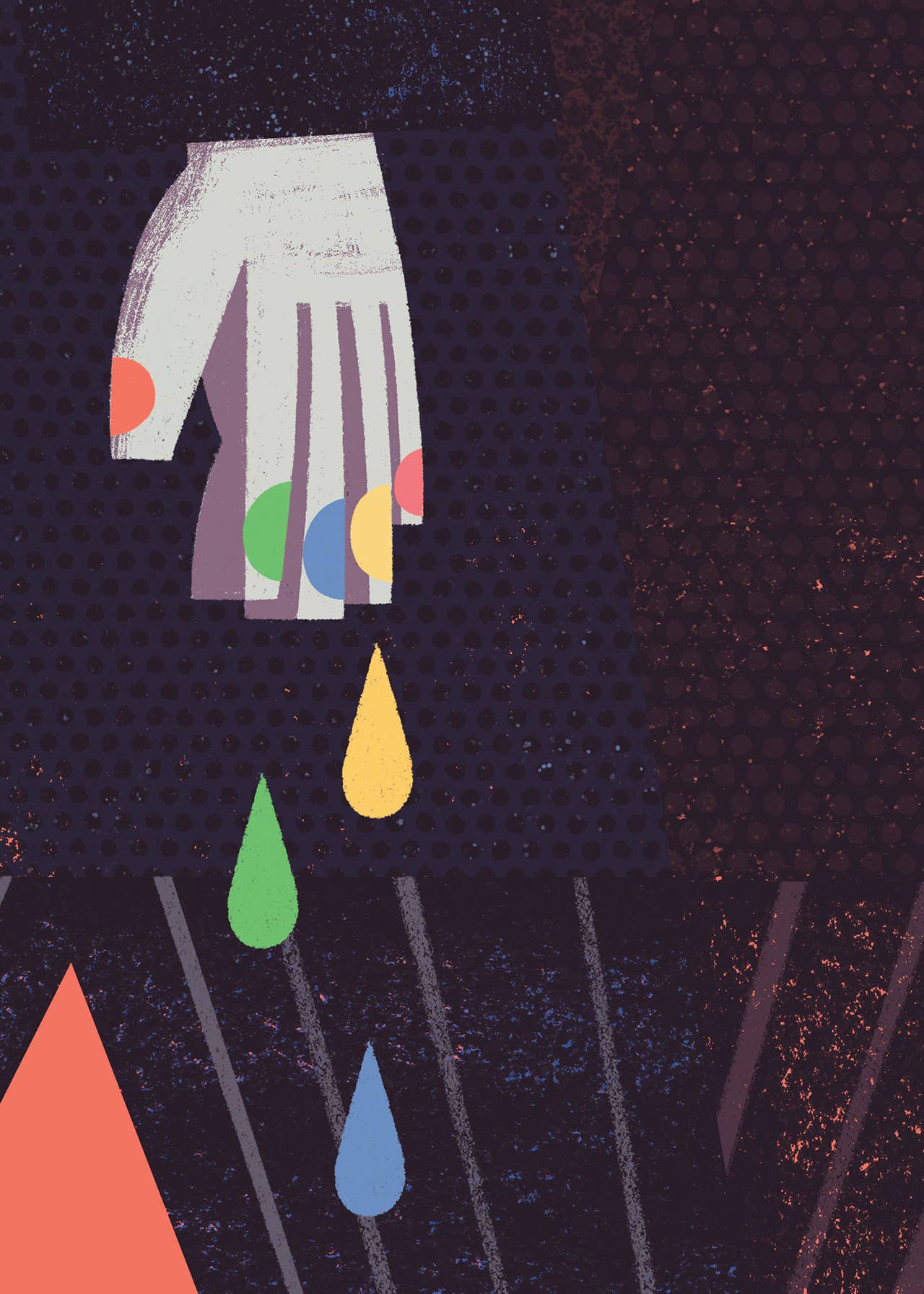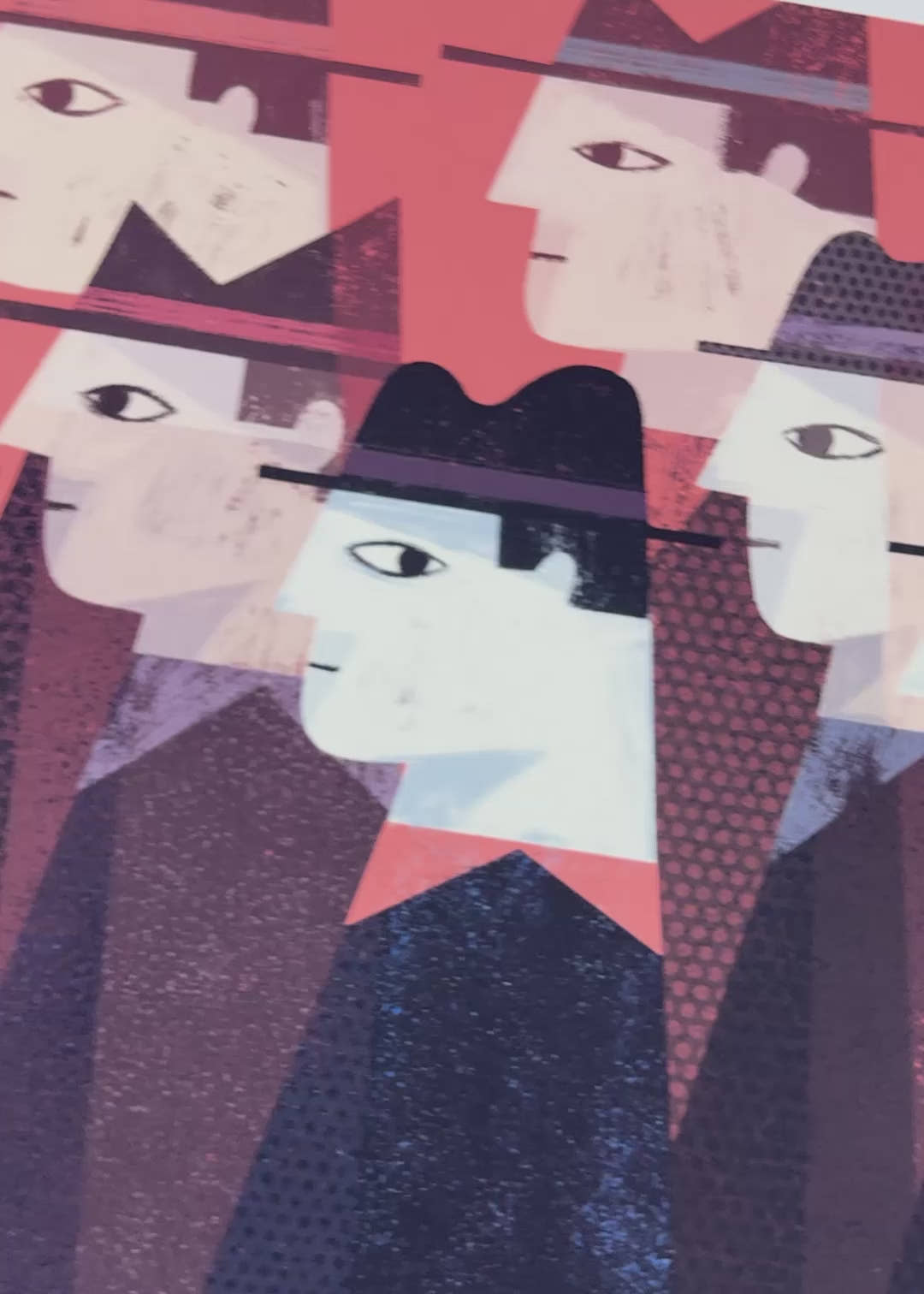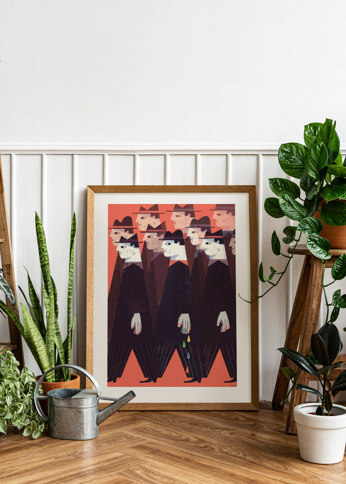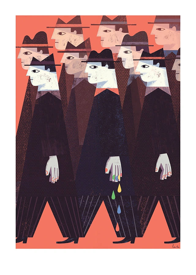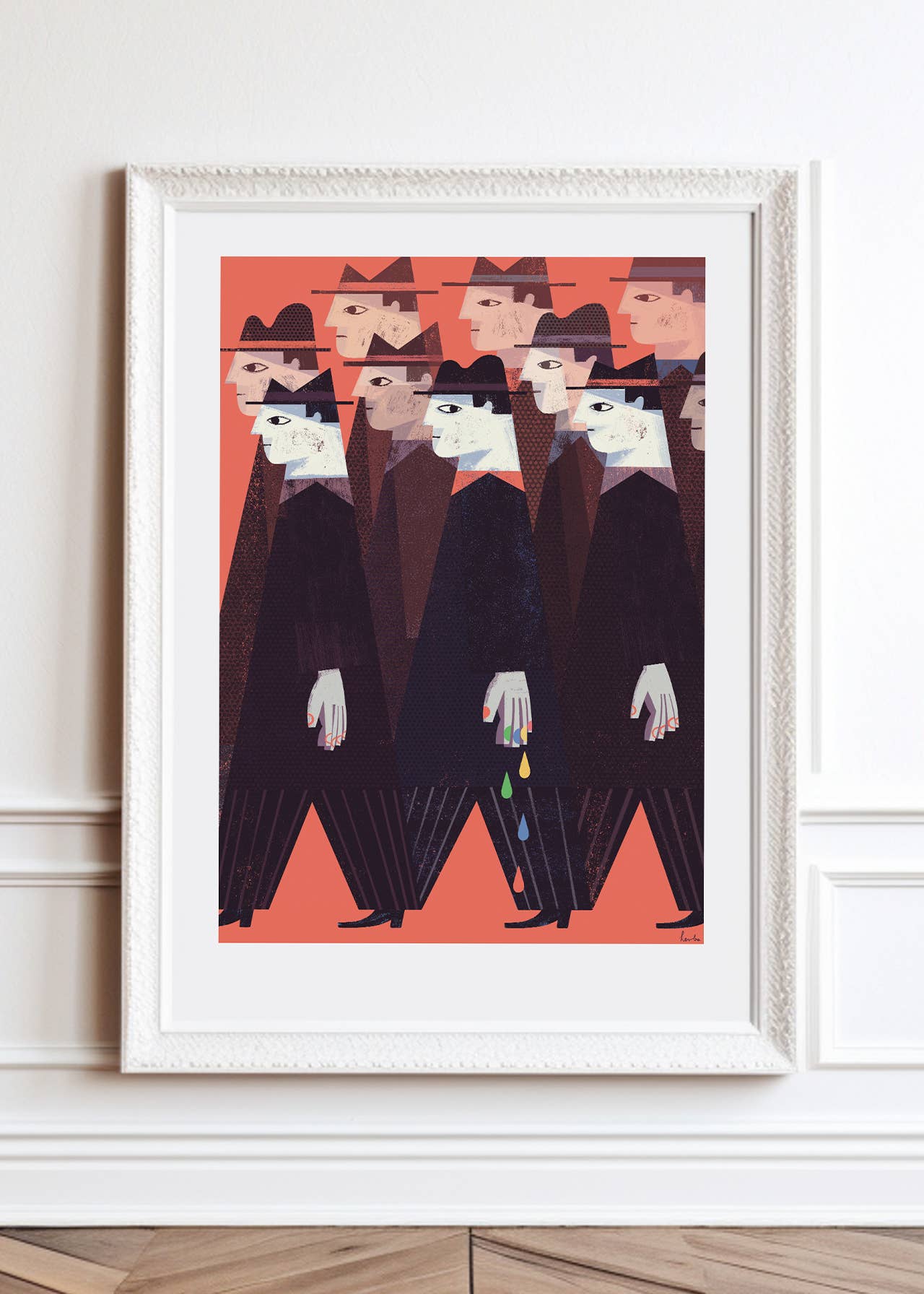In Friday, identical commuters march in numbing lockstep—except one hand leaks rainbow-coloured tears.