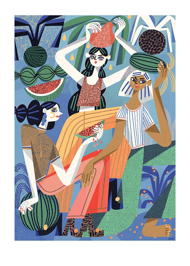 Girls with watermelons is a part of a series inspired by paintings of Azerbaijani artist Maral Rahmanzadeh. A celebration of warmth, sisterhood, and everyday rituals.