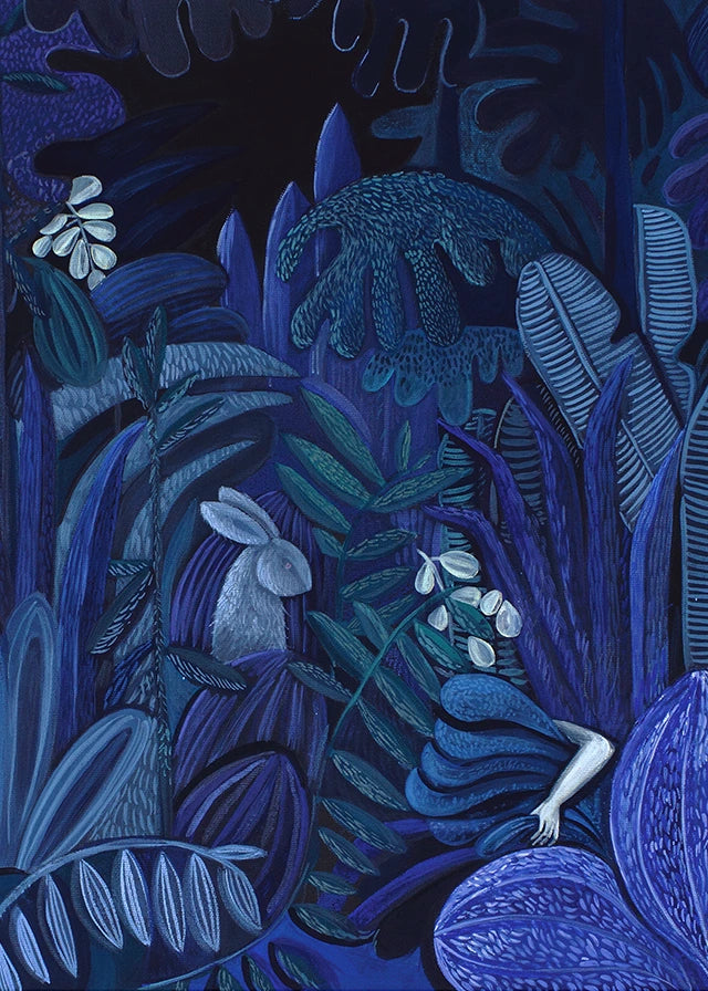 In a forest dark and deep is a painting from my “Fairy Tales” series. Part fairy tale, part horror. Originally gouache on black canvas, this piece also became the cover of my comic Fertility.