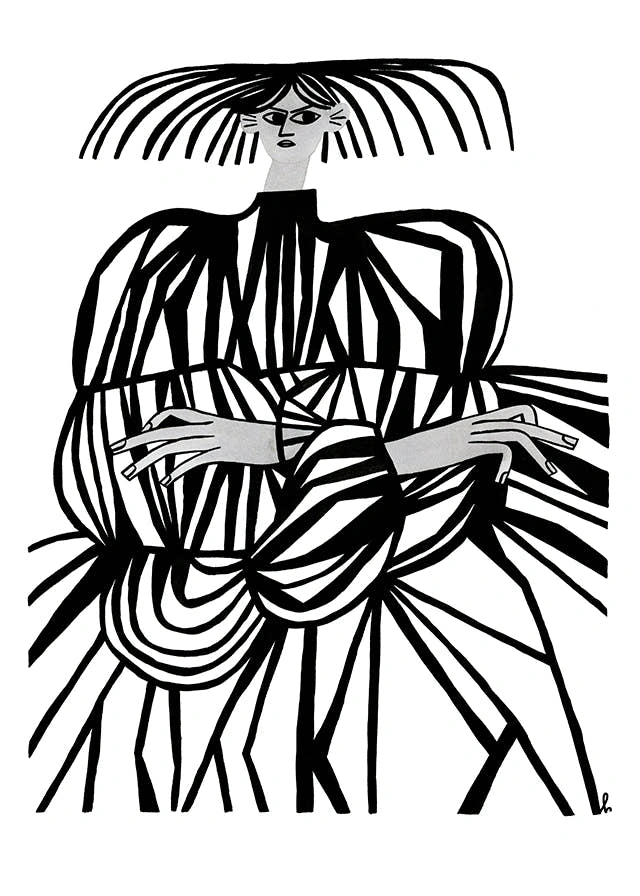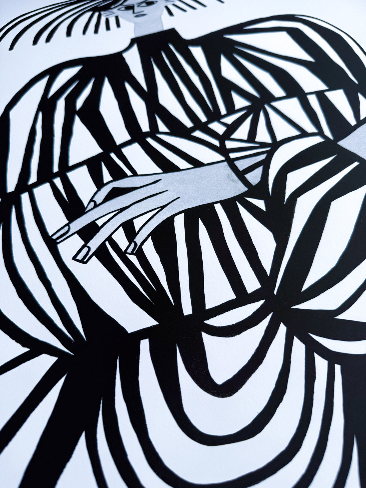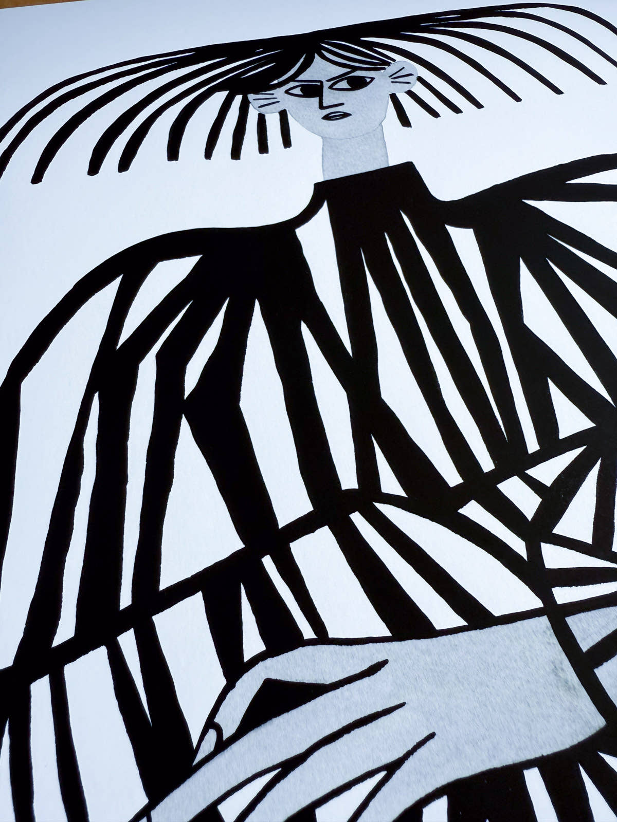 In Diego Velázquez’s Infanta portraits, the hairstyles and dresses are incredible. In my version, they turn into an abstract, geometric arrangement. This print comes from my original ink and Ecoline painting on paper.