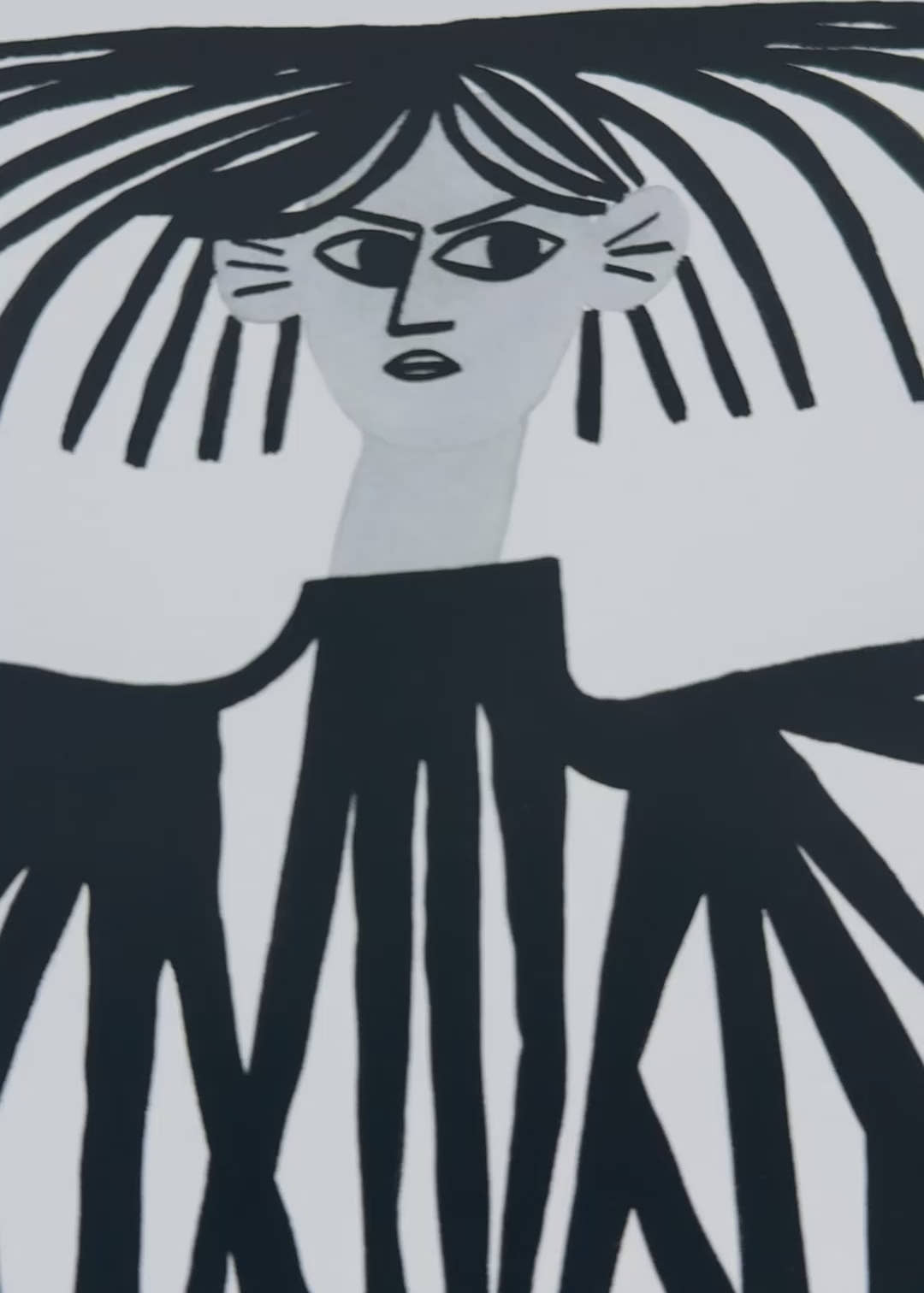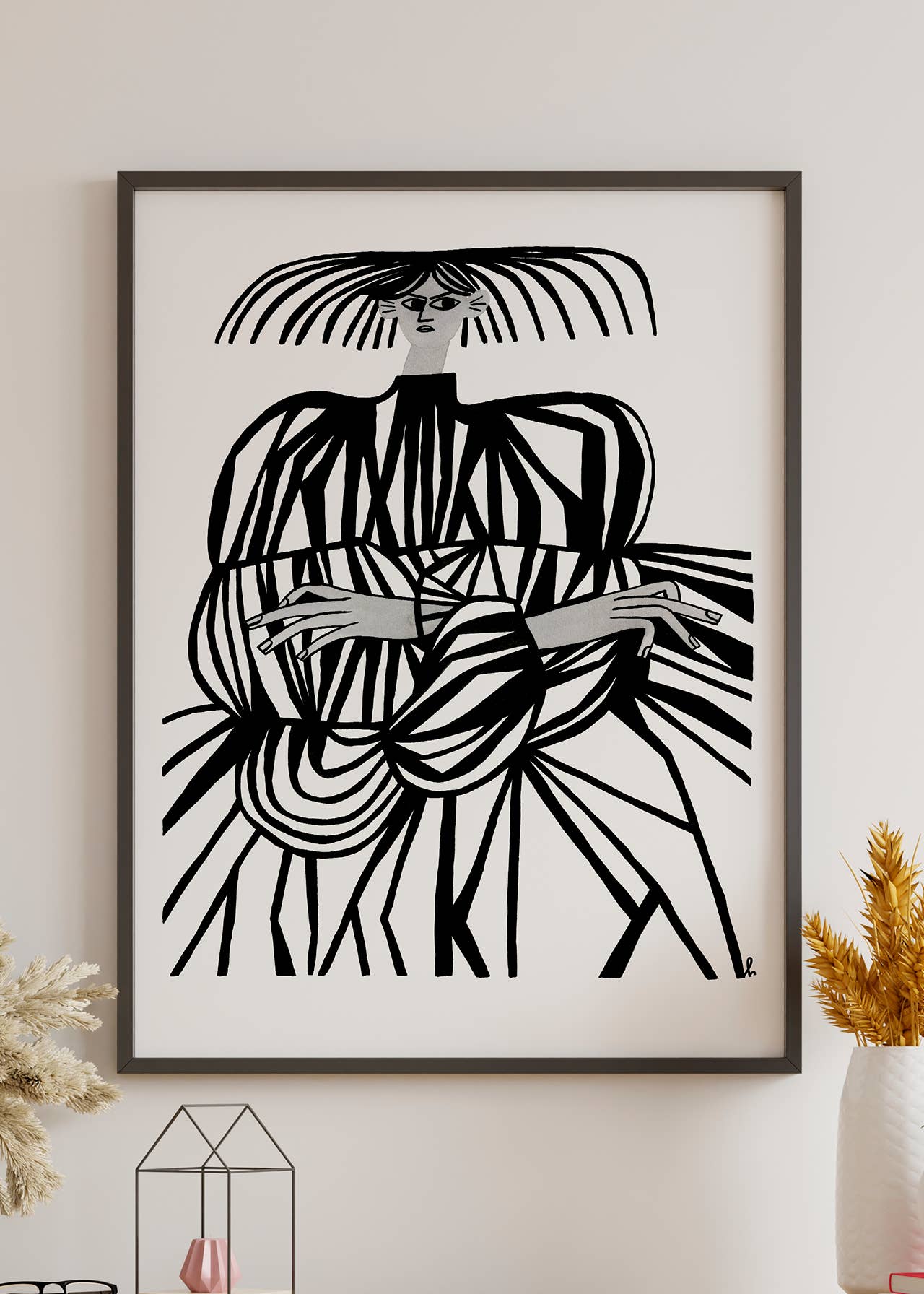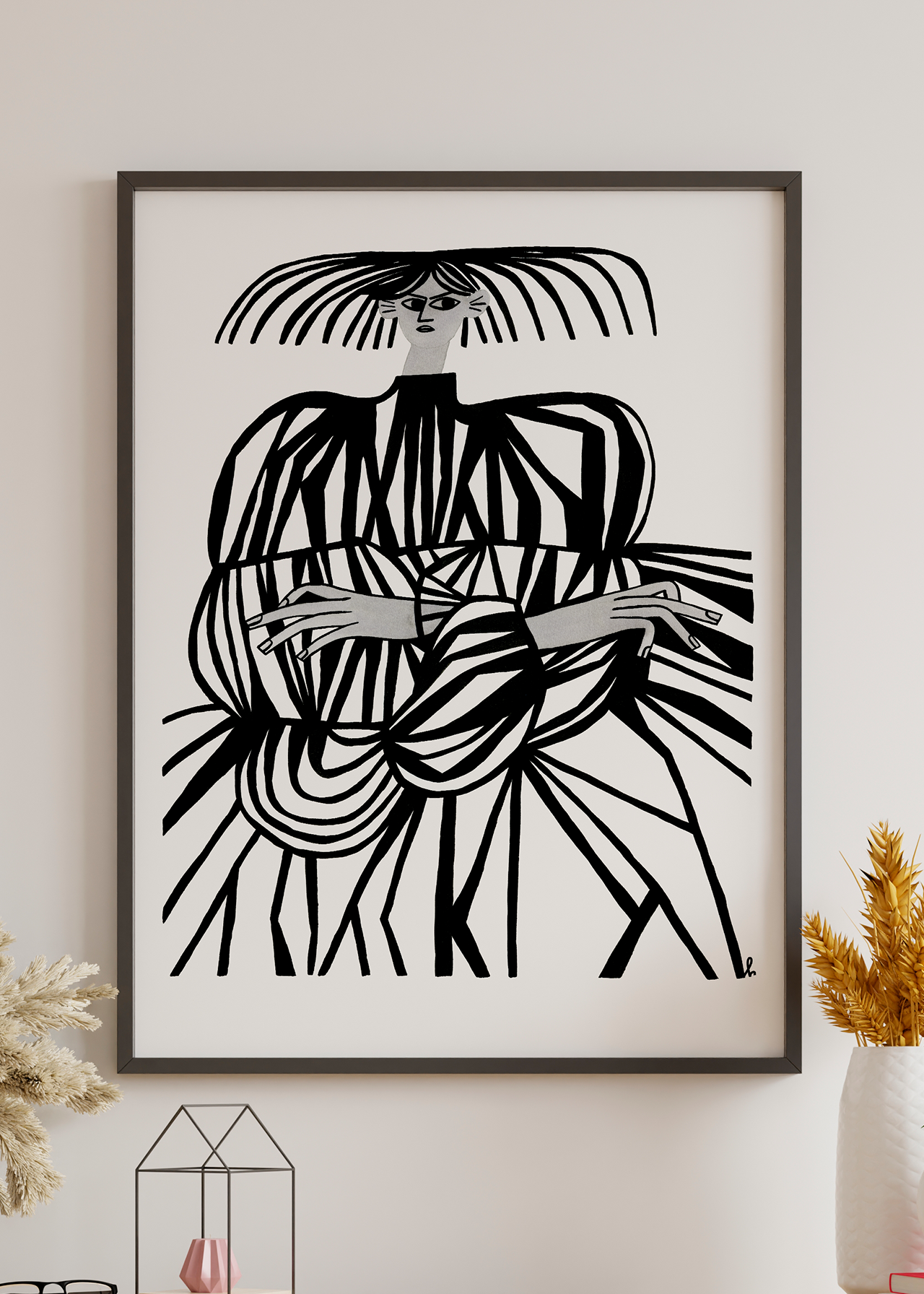 In Diego Velázquez’s Infanta portraits, the hairstyles and dresses are incredible. In my version, they turn into an abstract, geometric arrangement. This print comes from my original ink and Ecoline painting on paper.