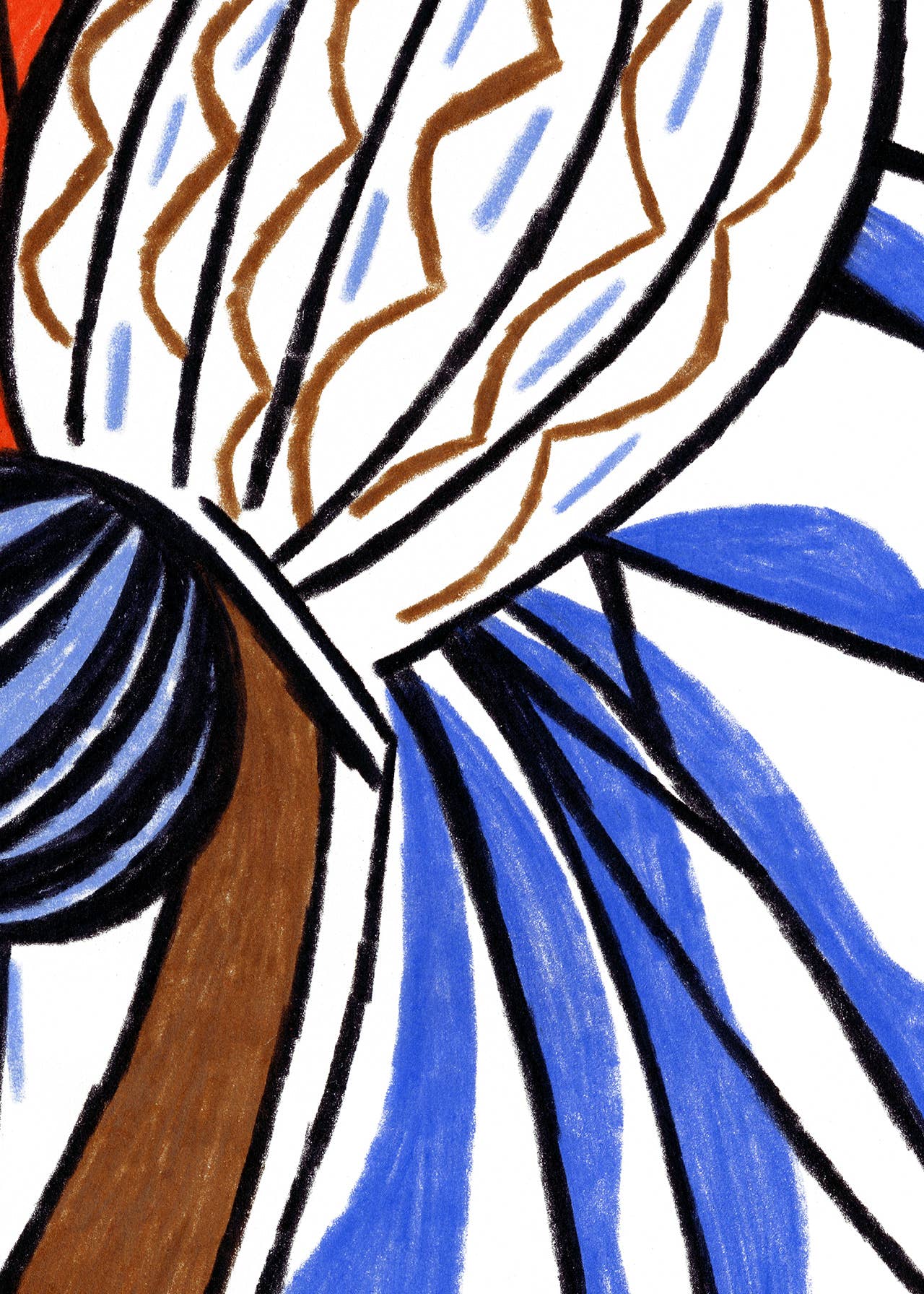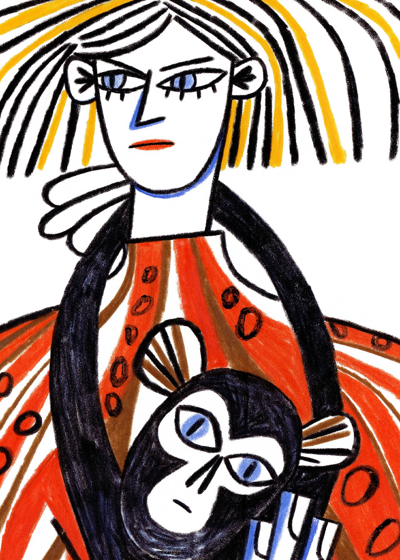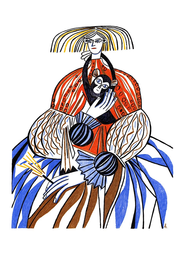 Infanta II, drawn with colored pencils on paper. Part of my series of encounters with Diego Velázquez’s paintings. Here, my reinterpretation of his Infanta portrait, with a monkey around her neck.