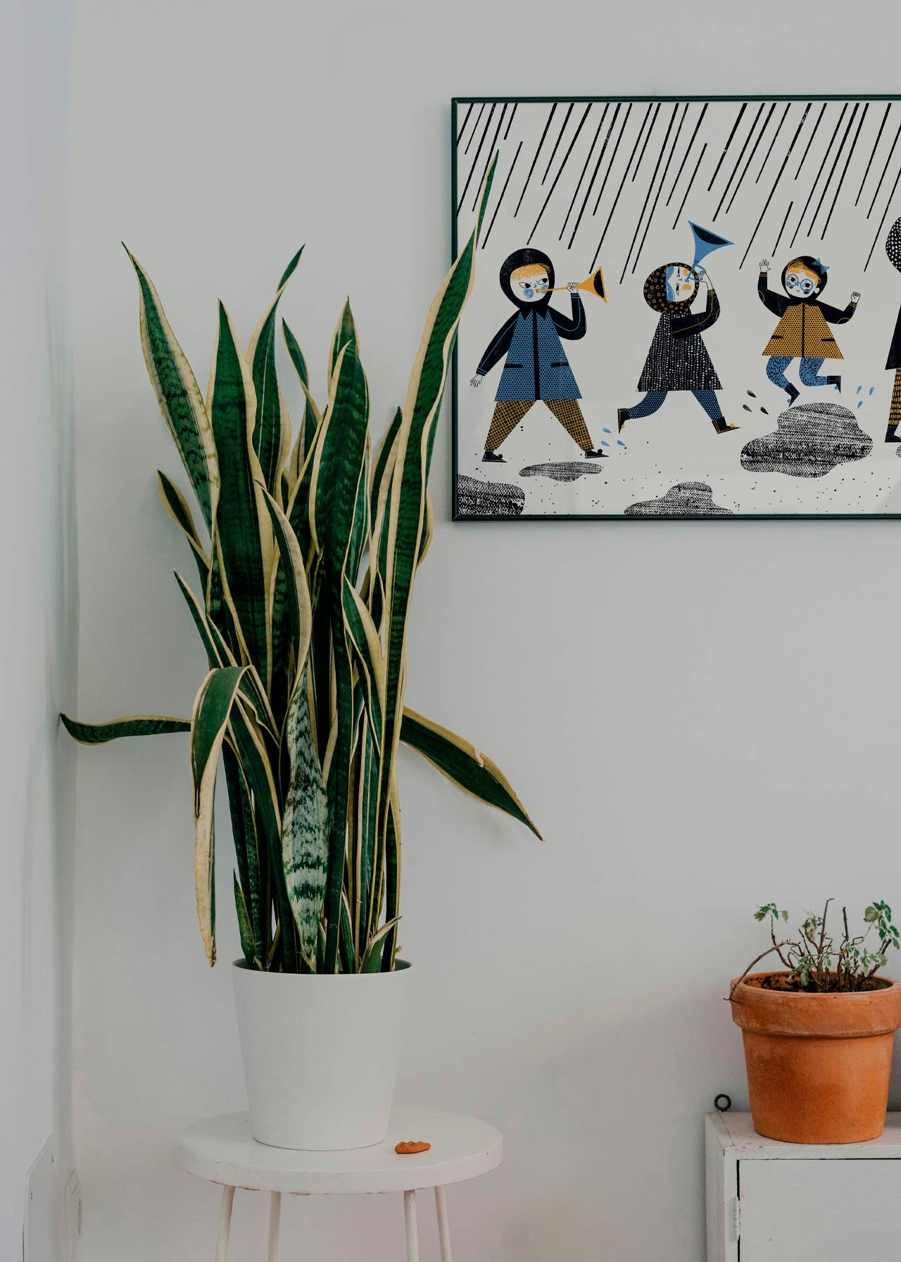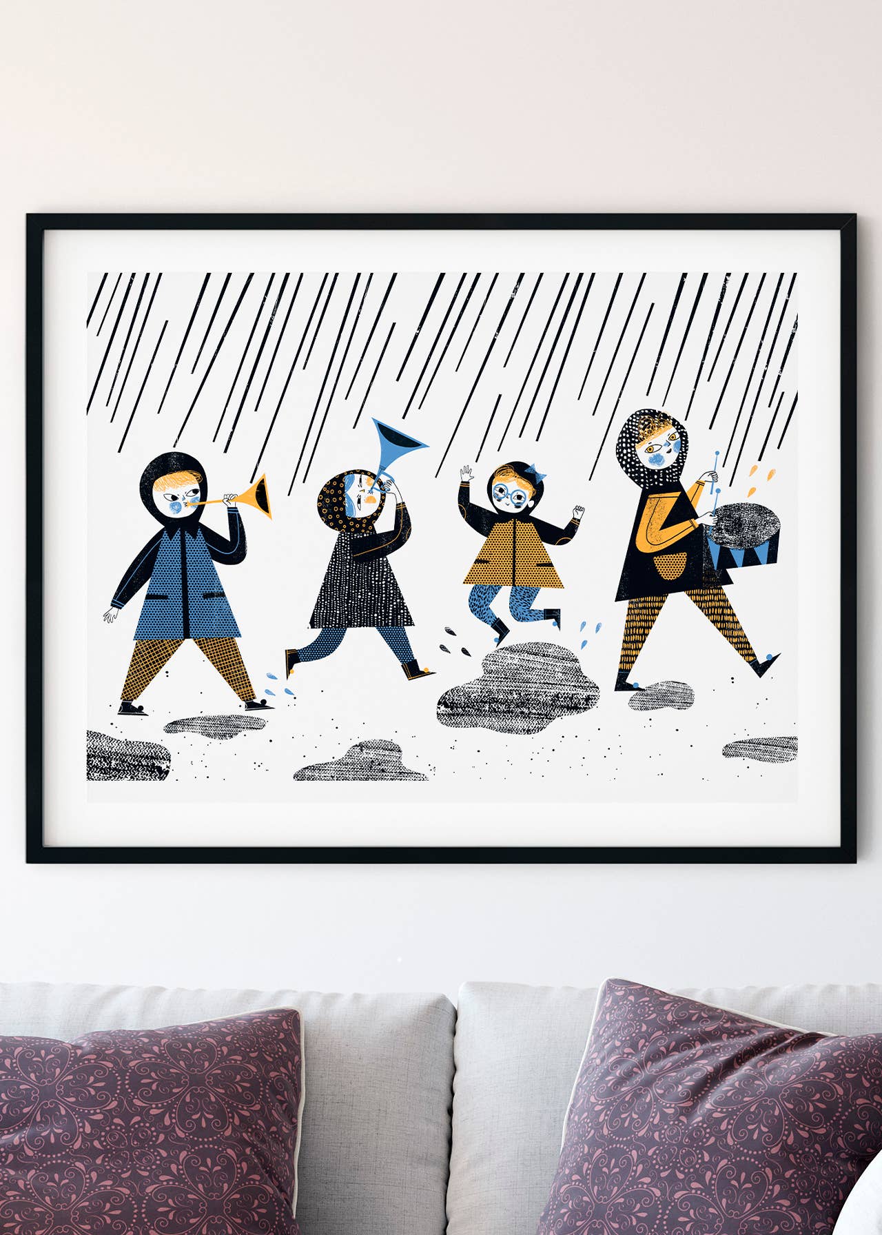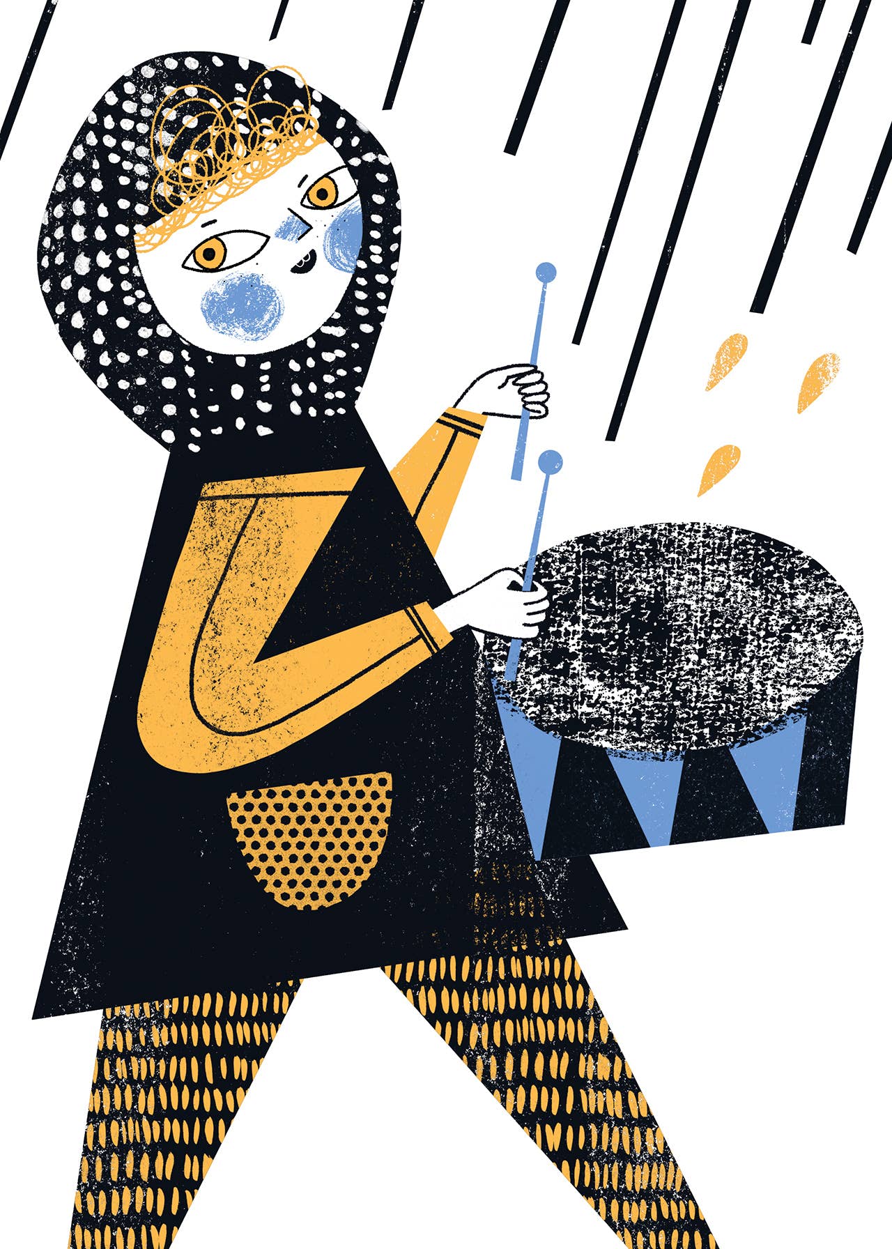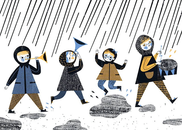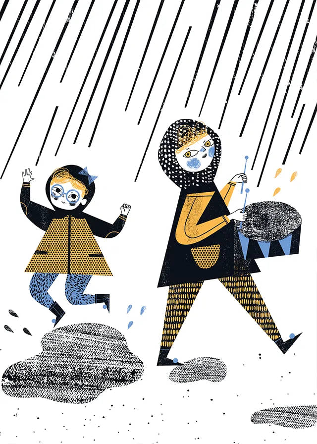 It's raining is one of my illustrations for Jerzy Ficowski’s poems for children: four kids turn a downpour into a brass-band march. When I was little, after every big rain, I’d run outside in boots to splash in puddles. This poem feels especially close to me.