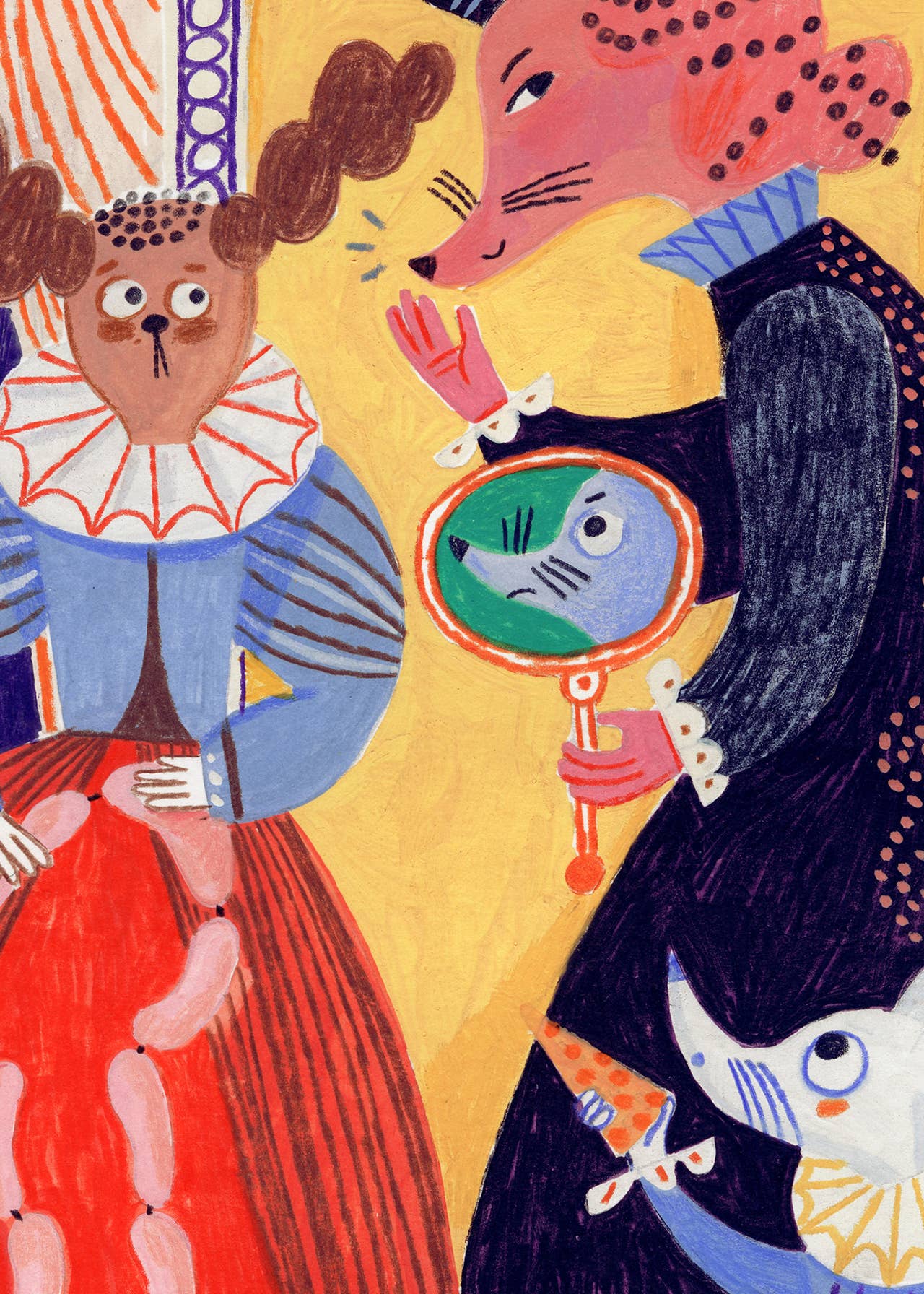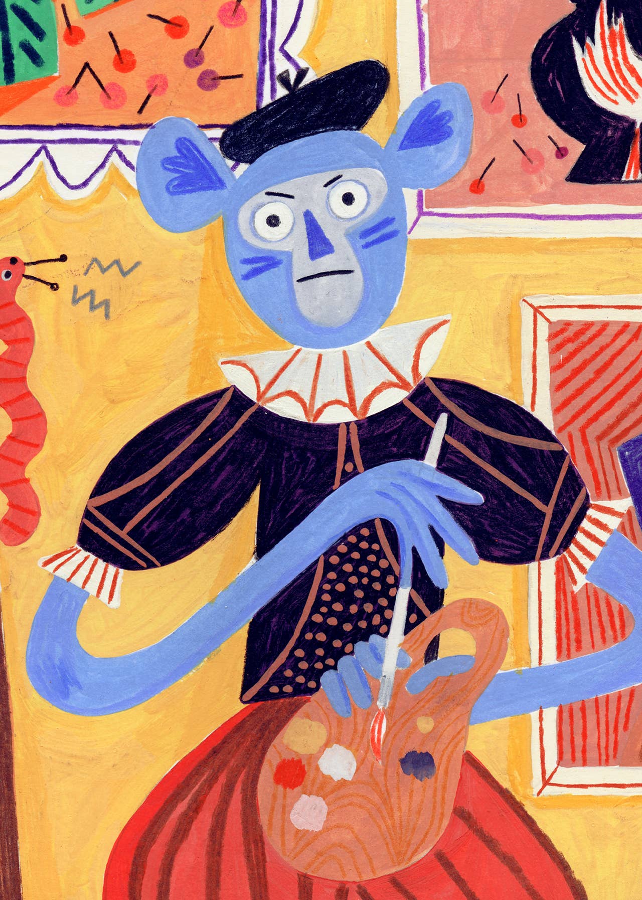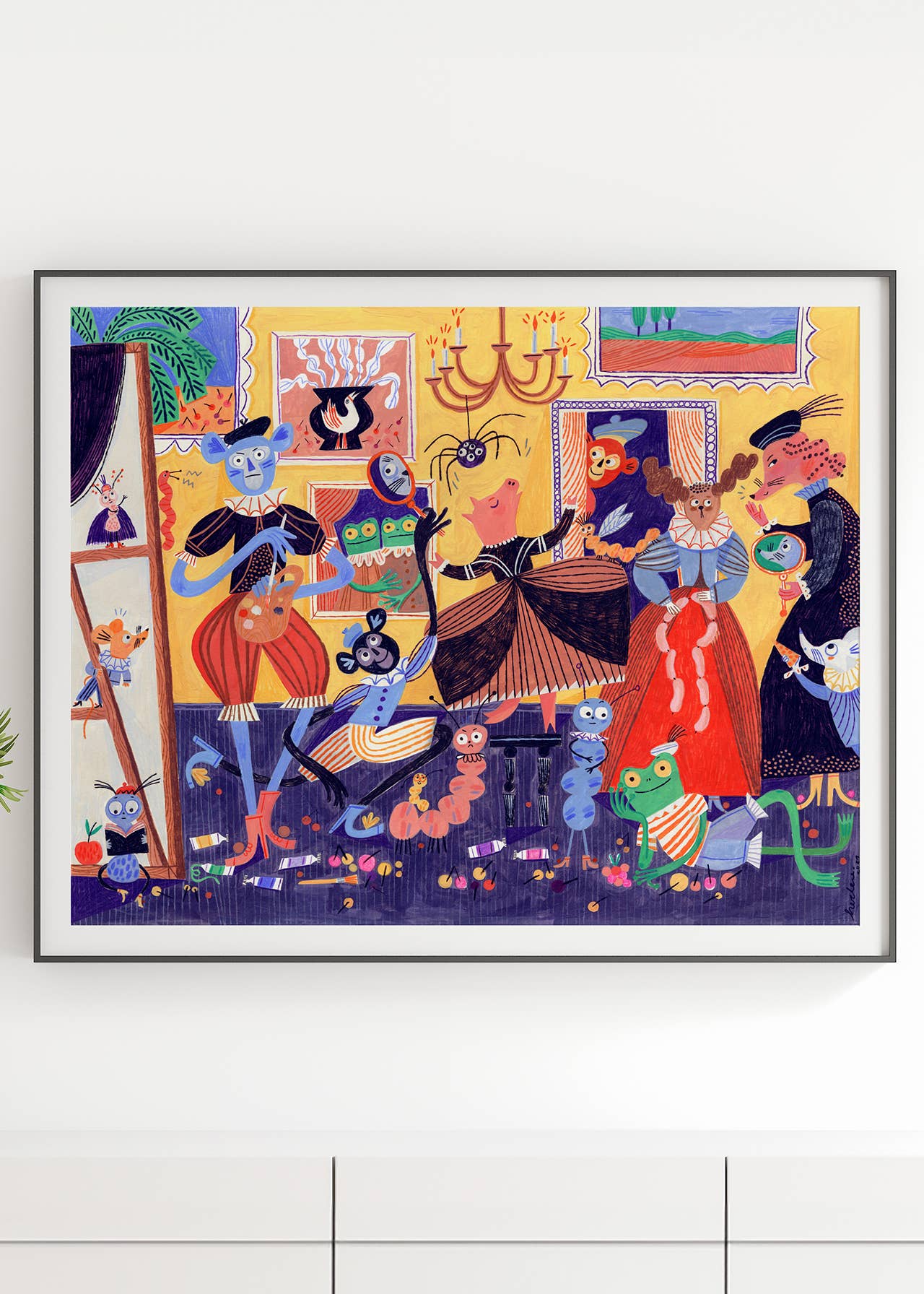 My interpretation of Diego Velázquez’s Las meninas, reimagined for children. All the characters are animals! A funny, light-hearted gouache painting on paper.