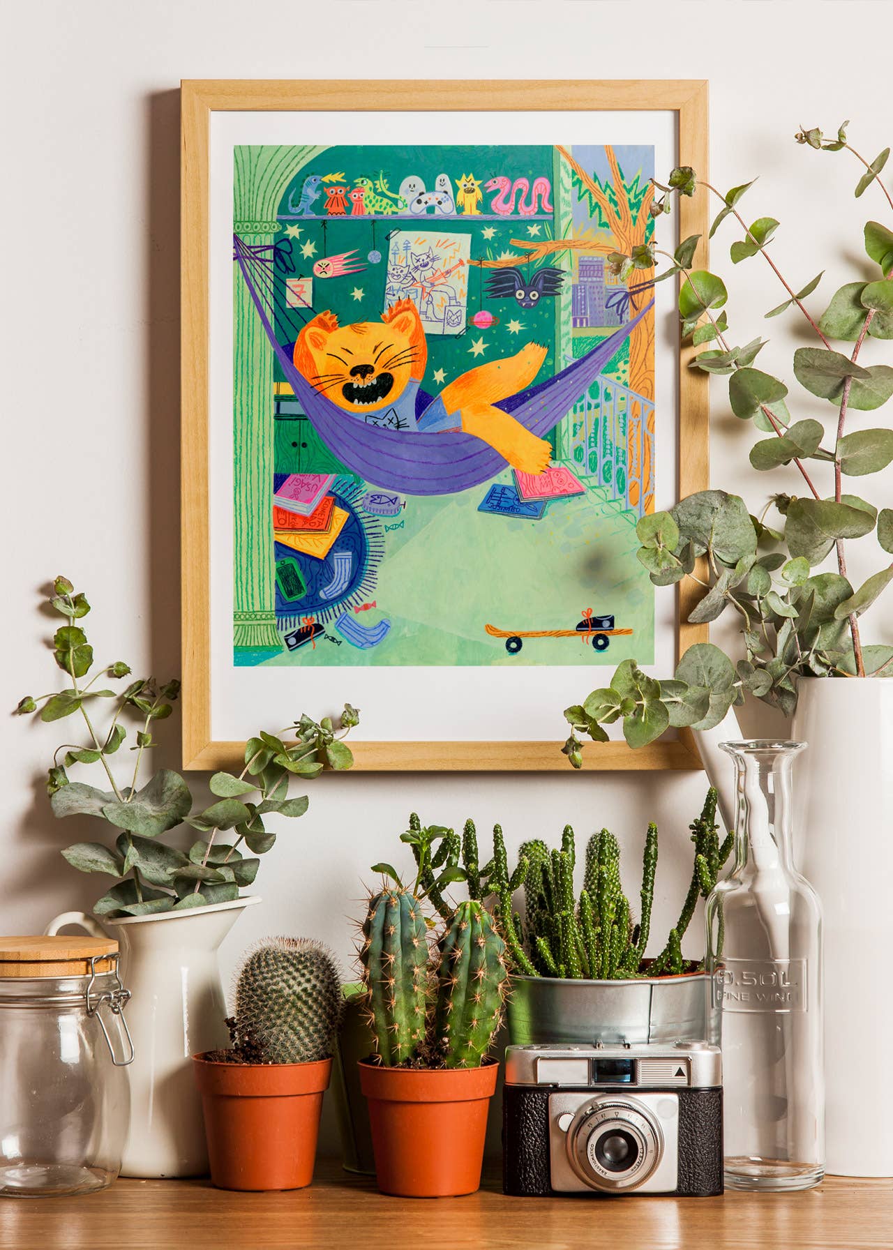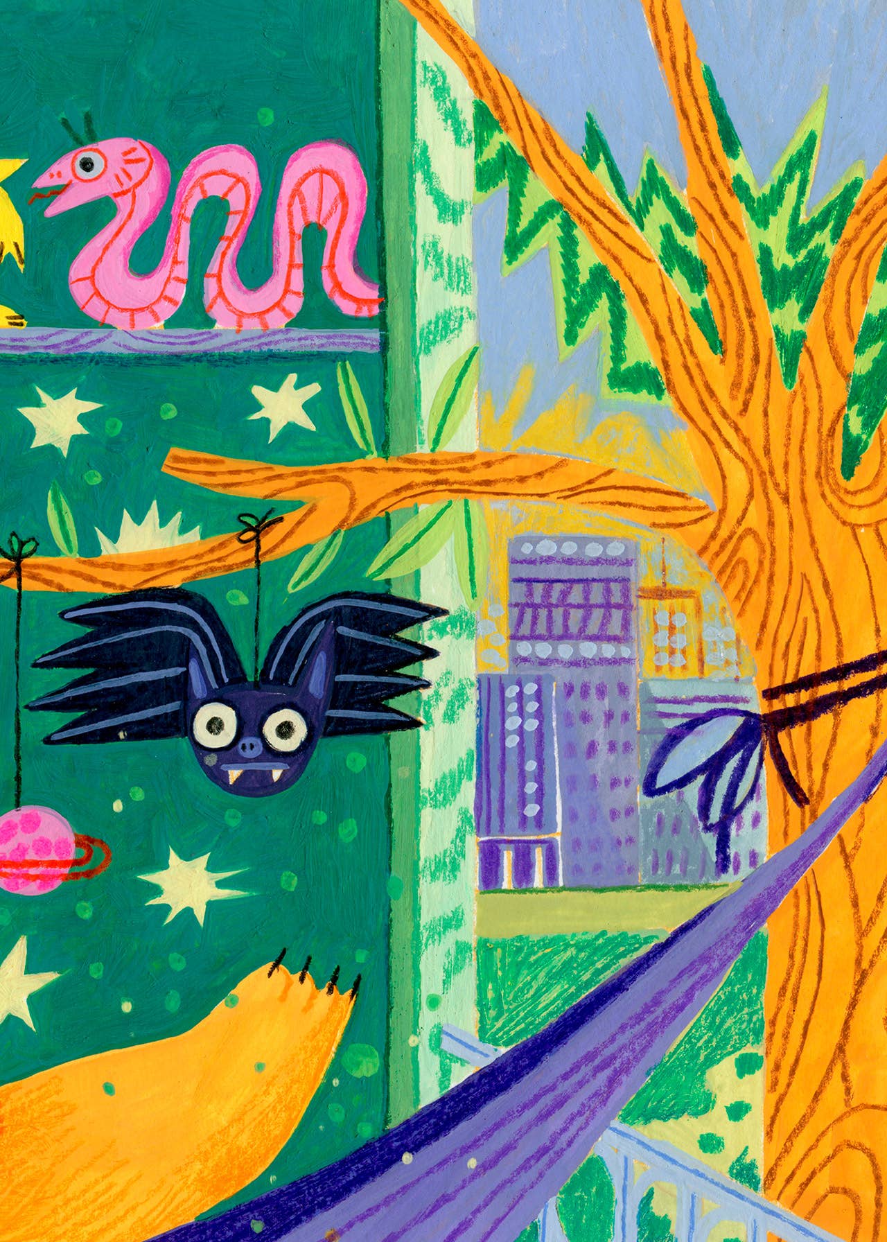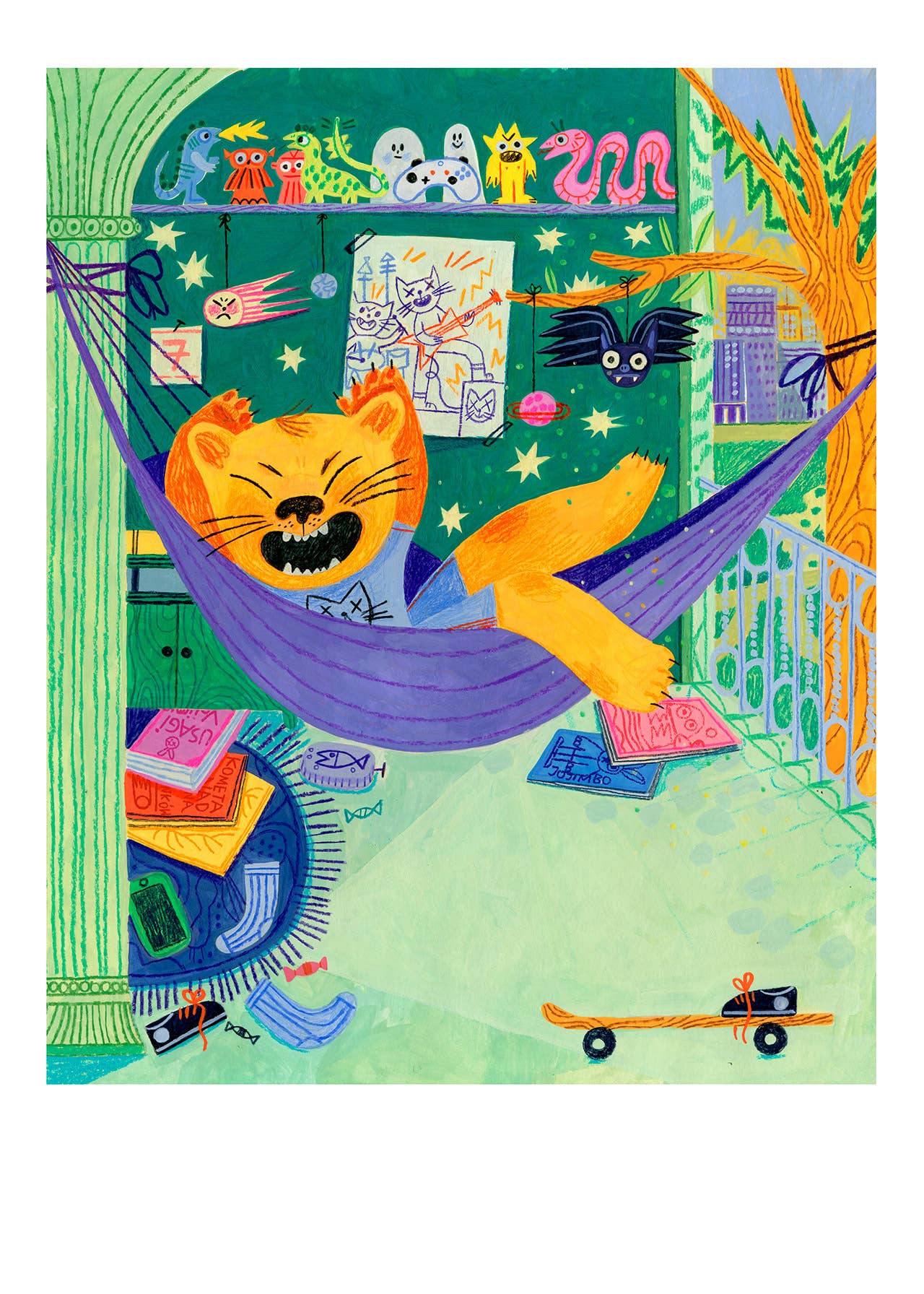 Leo's room from my book "No One Is Home". Leo's just woken up; she's in his room, lying on her hammock, stretching. It's her birthday today!
