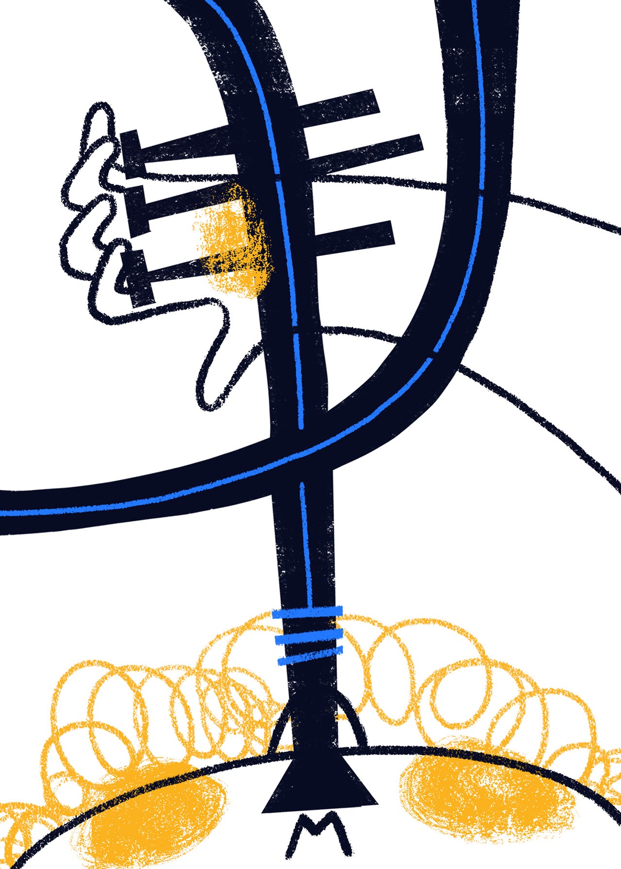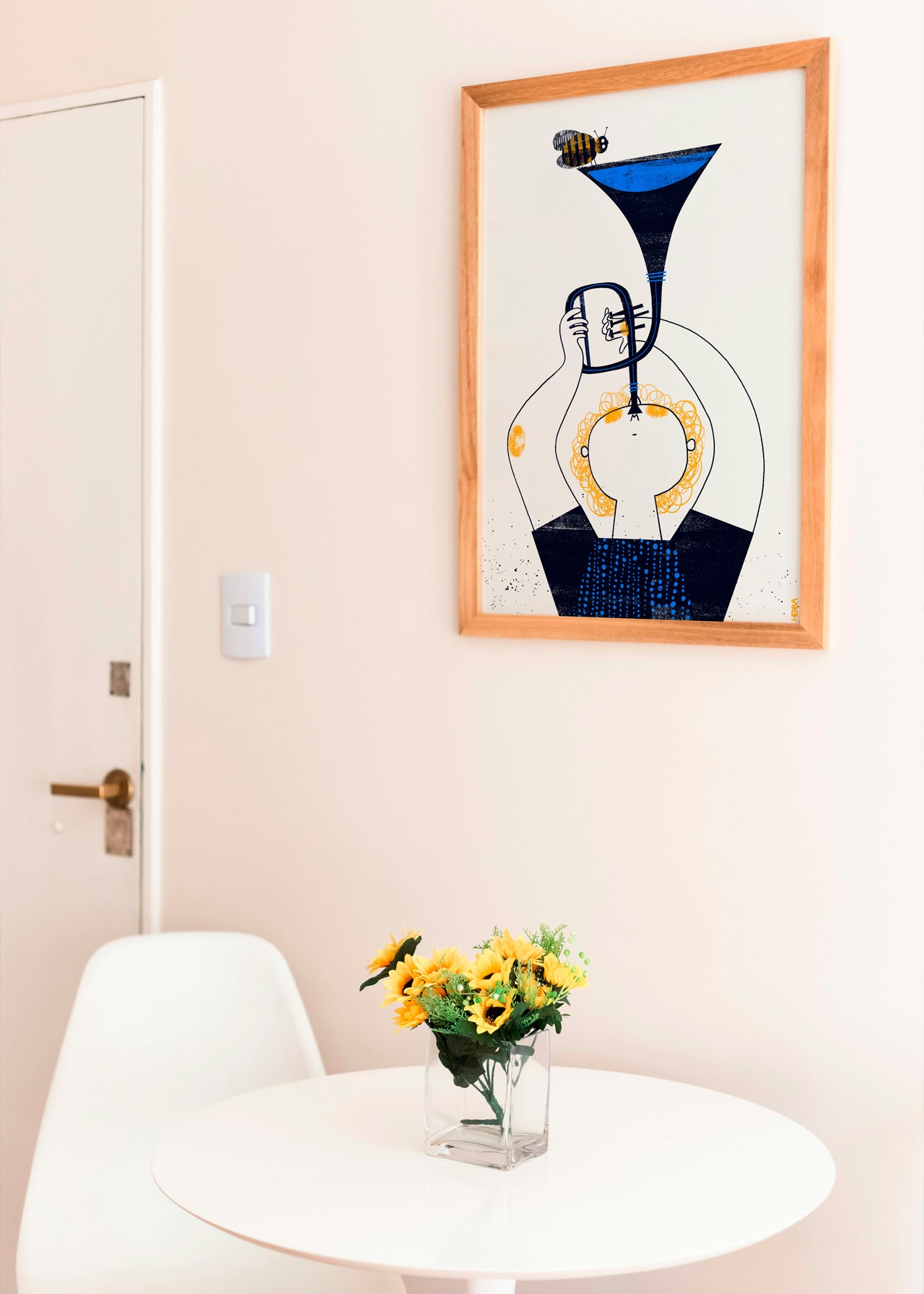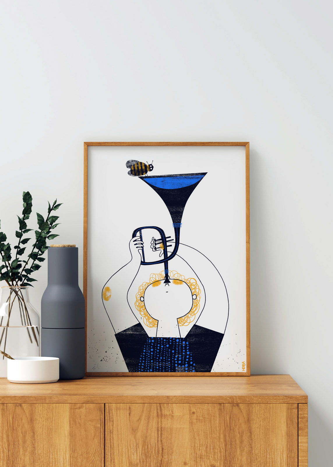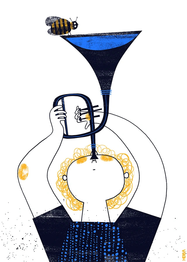 Little trumpeter, an illustration for a Jerzy Ficowski poem: a tiny trumpeter plays while a bumblebee rests on the horn. Minimalist, charming, and perfect for a child’s room.