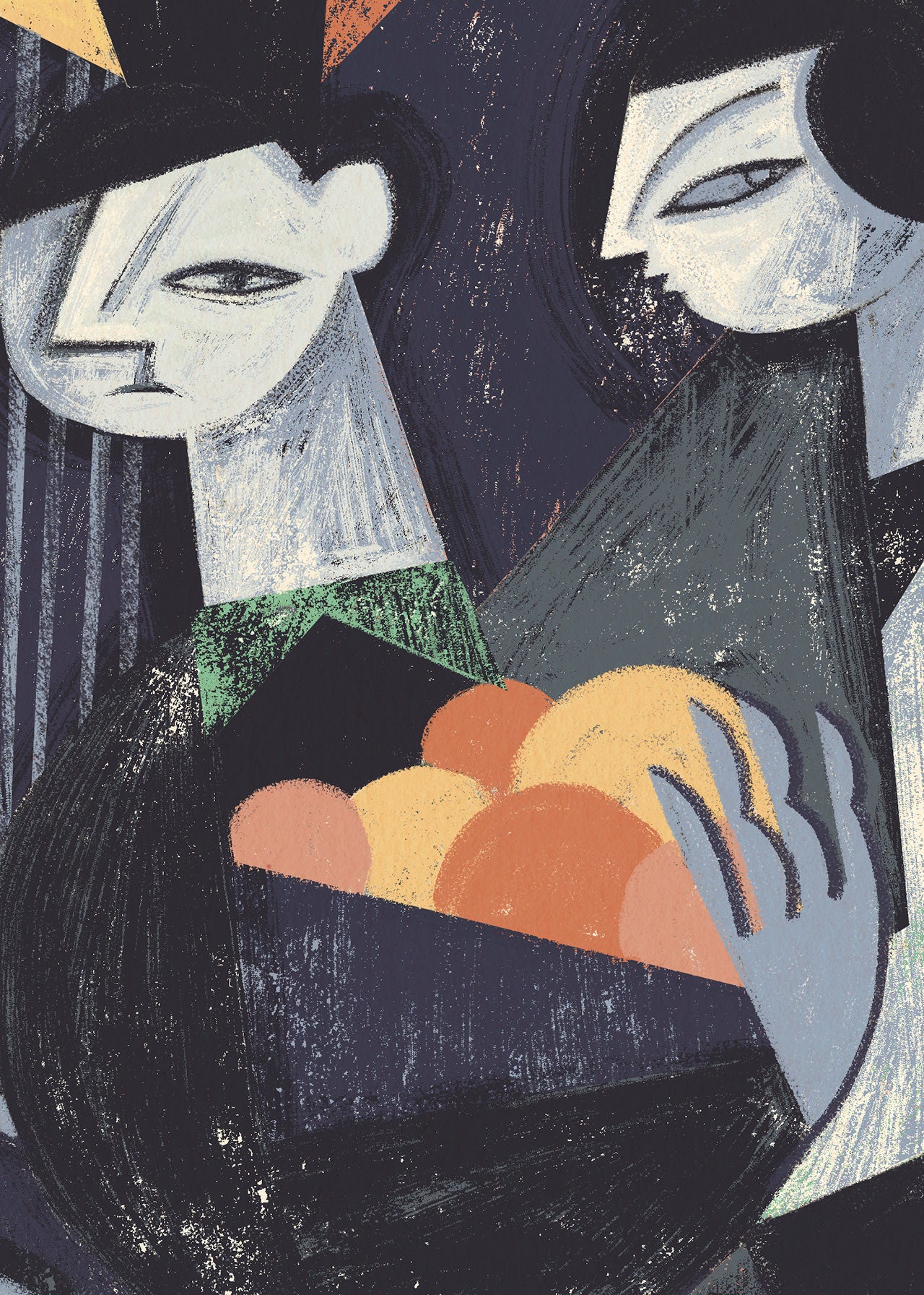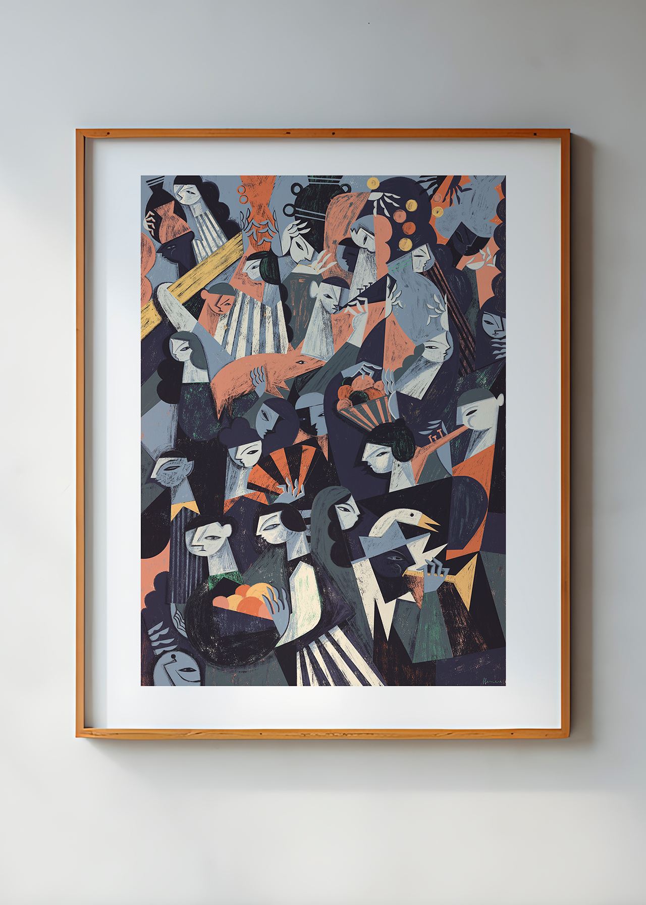 Marketplace is one of my older works, showing my love for Cubism and Italian Futurism. A lively market scene full of fruit, instruments, and people.
