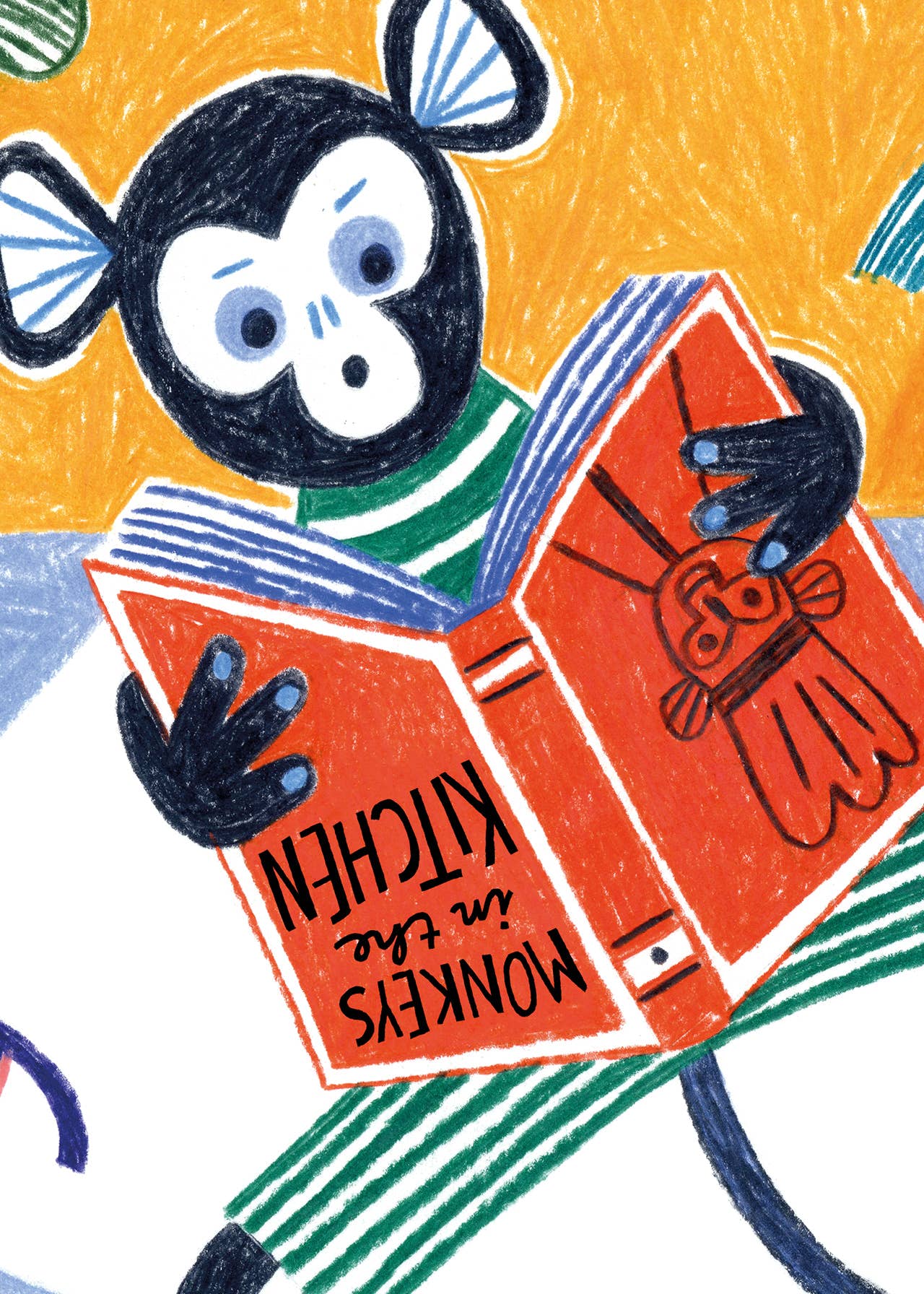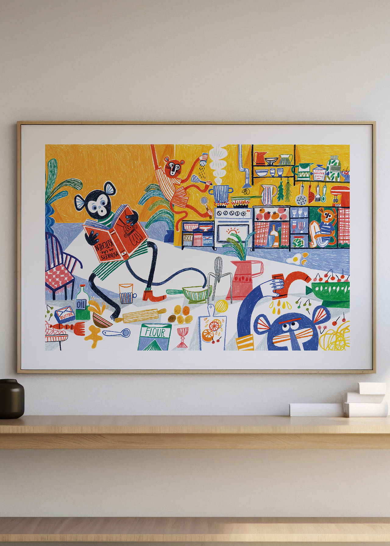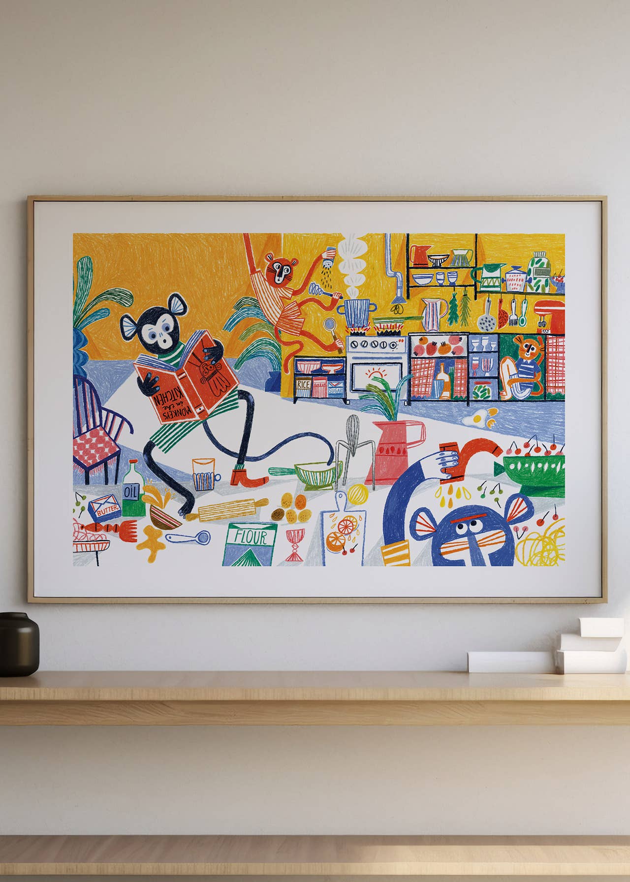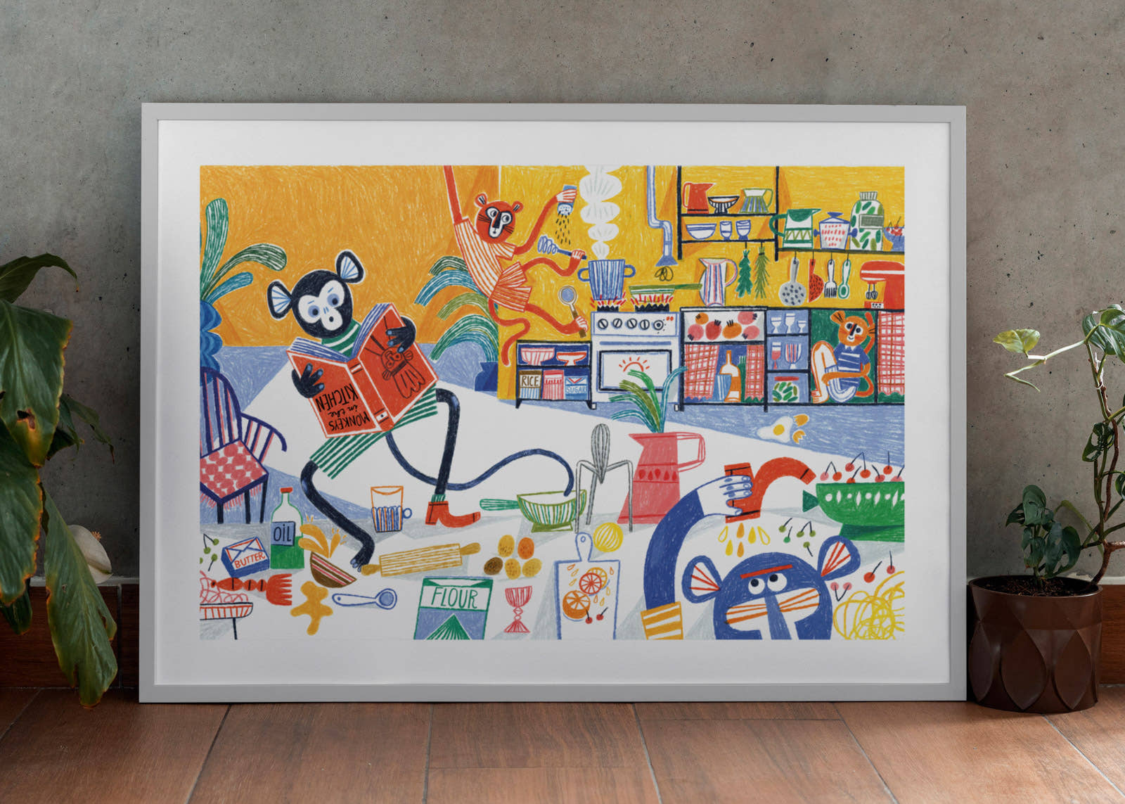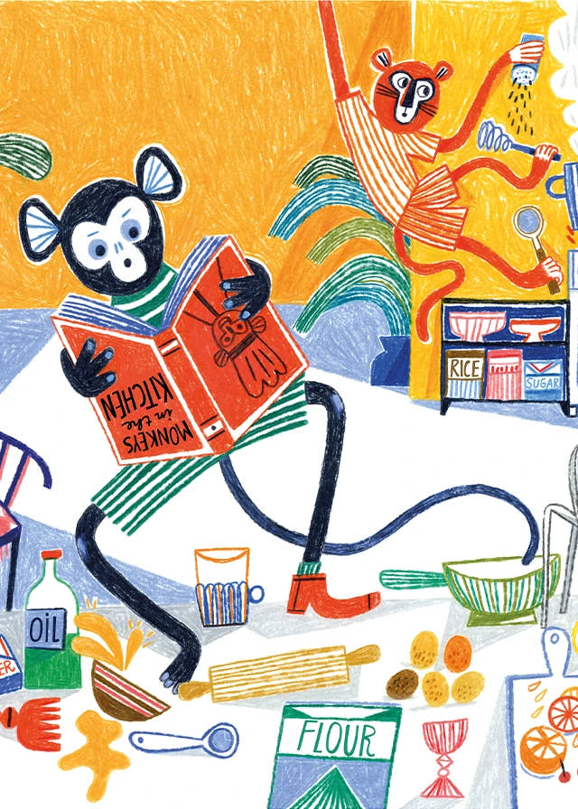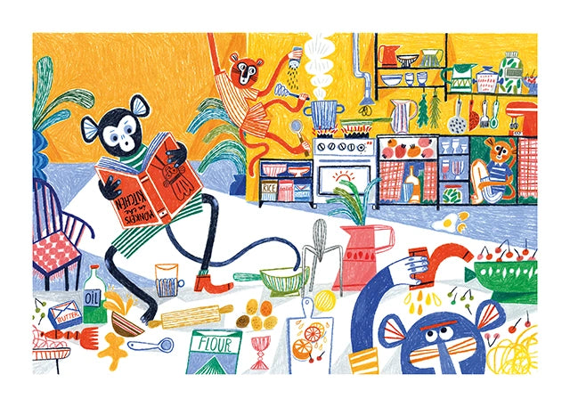 Monkeys in the kitchen, from 5 Bubblegum Street: monkeys making joyous chaos while baking in a lively kitchen.