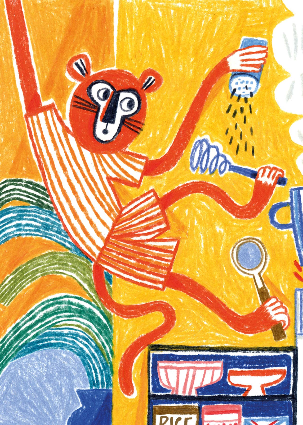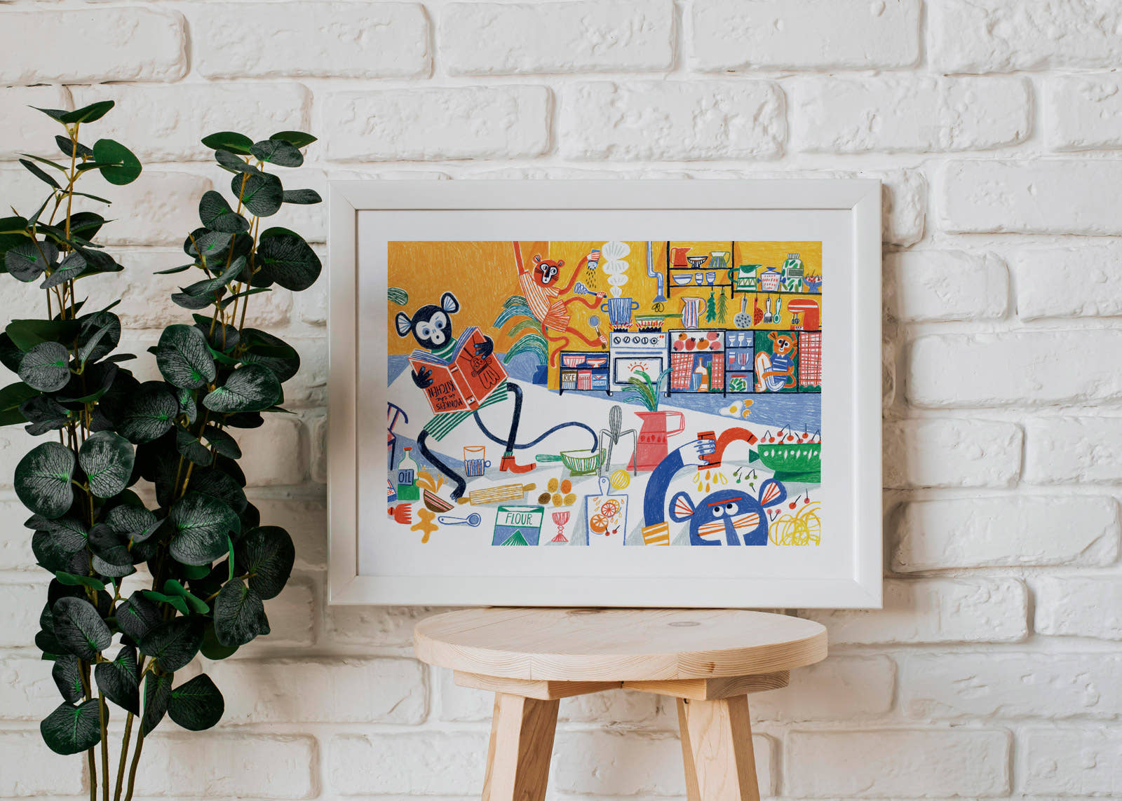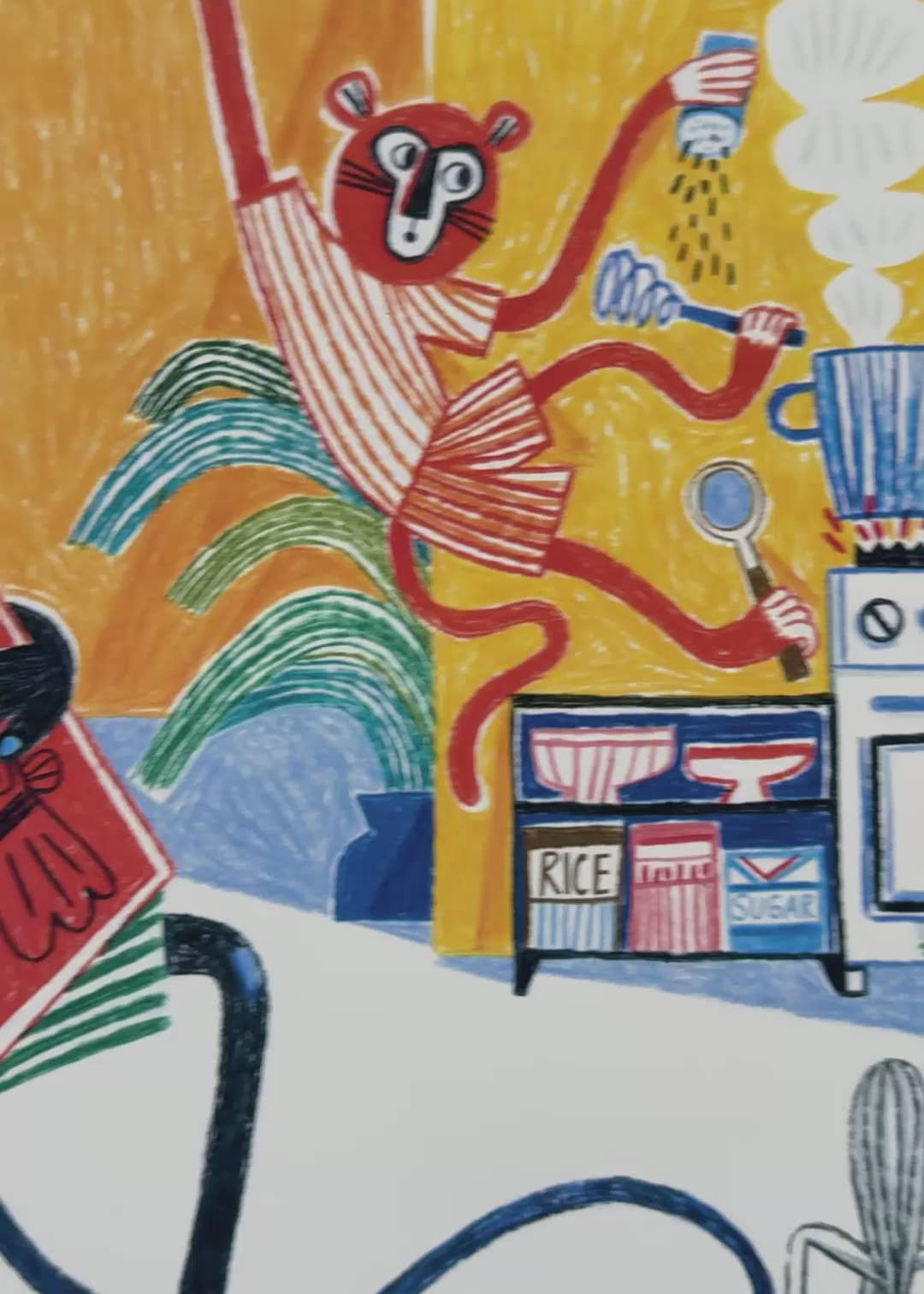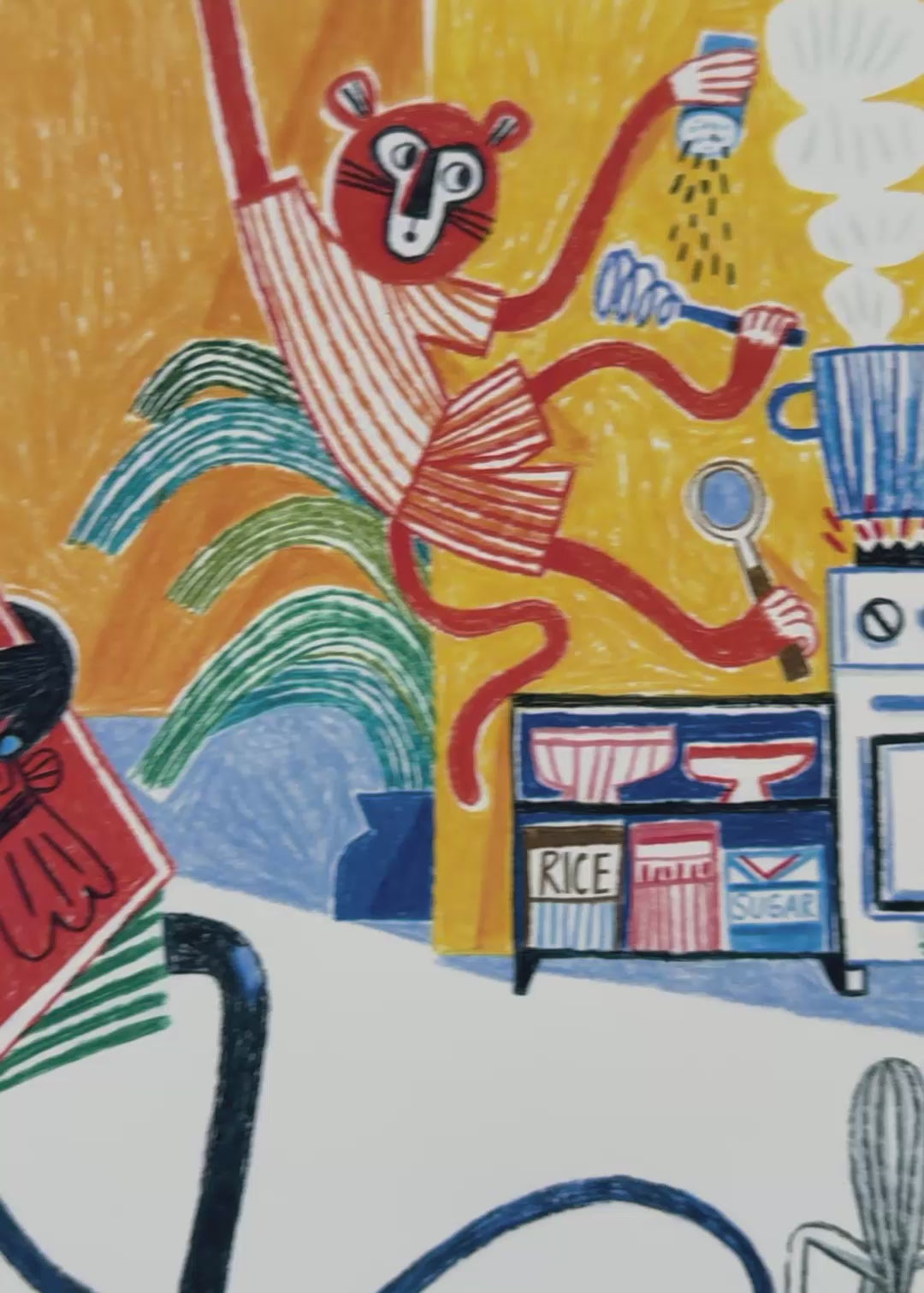 Monkeys in the kitchen, from 5 Bubblegum Street: monkeys making joyous chaos while baking in a lively kitchen.