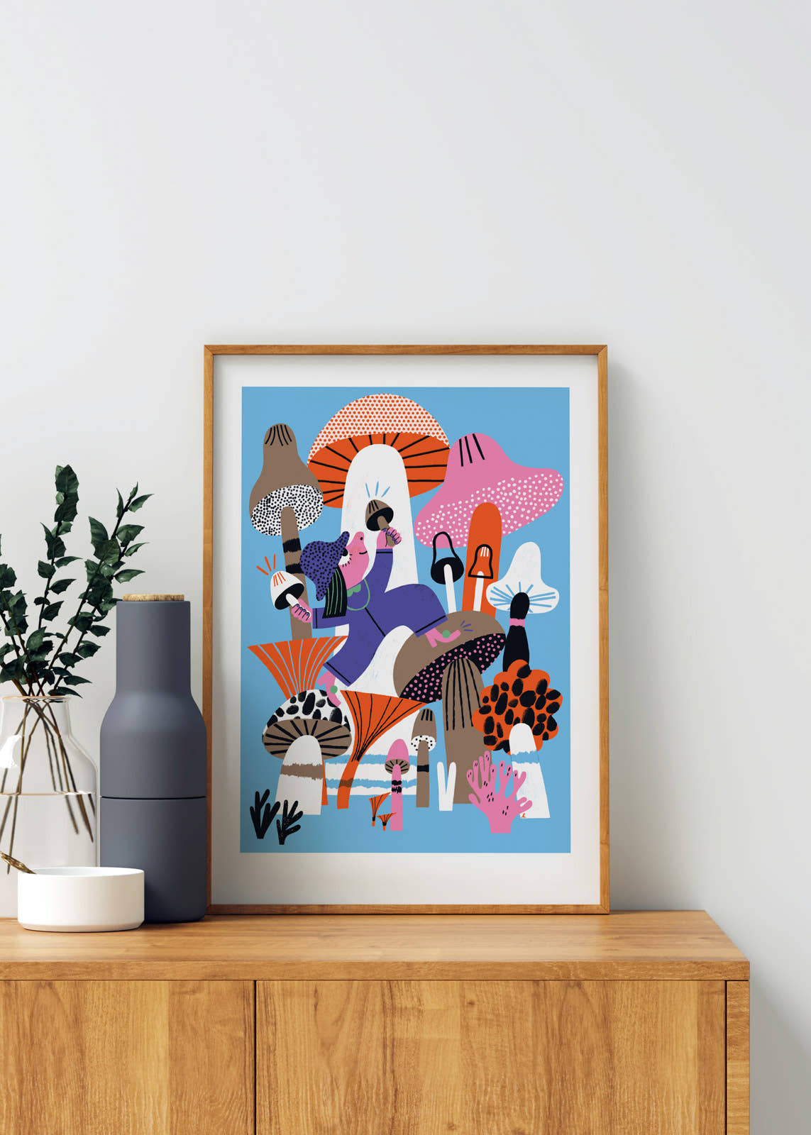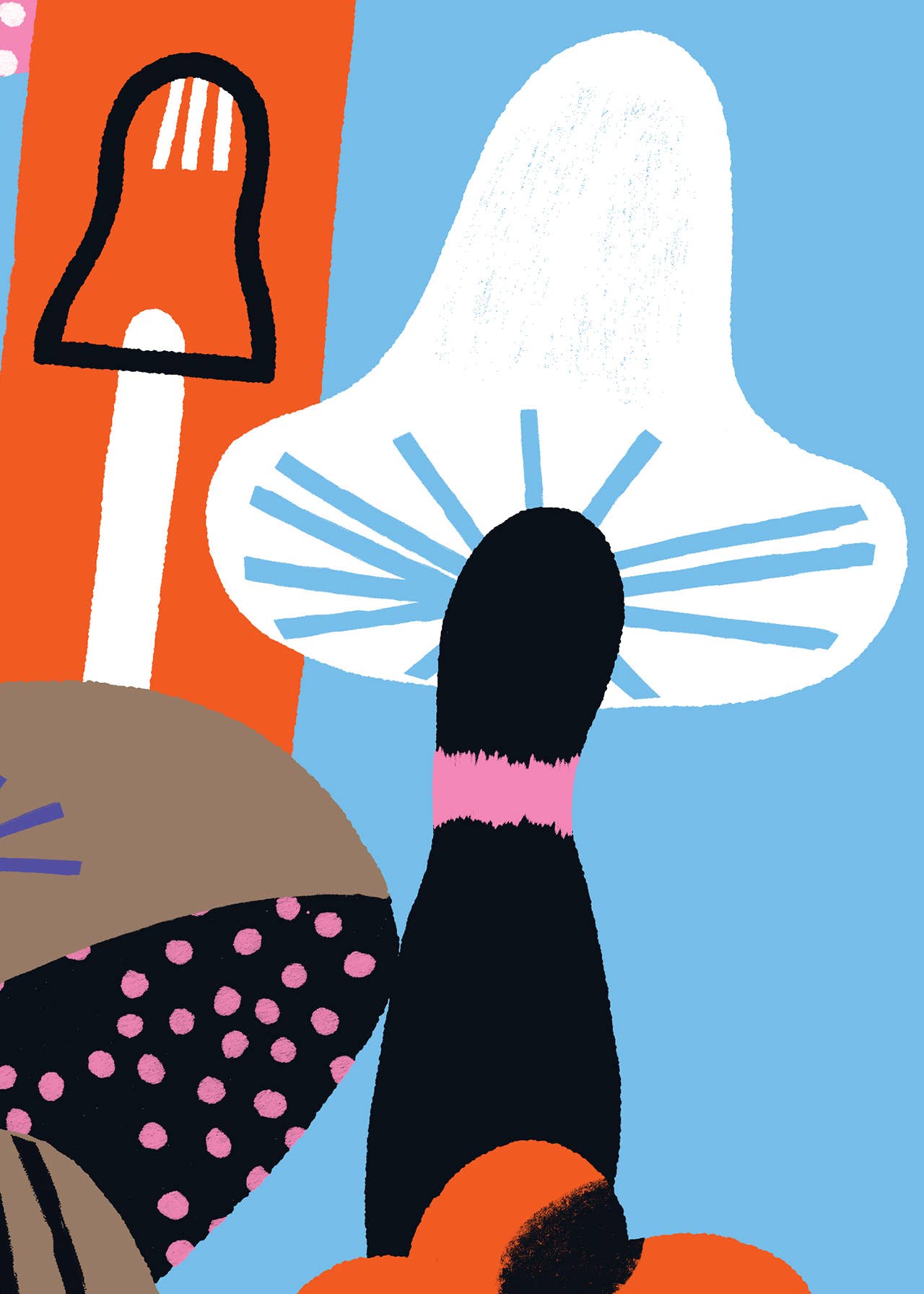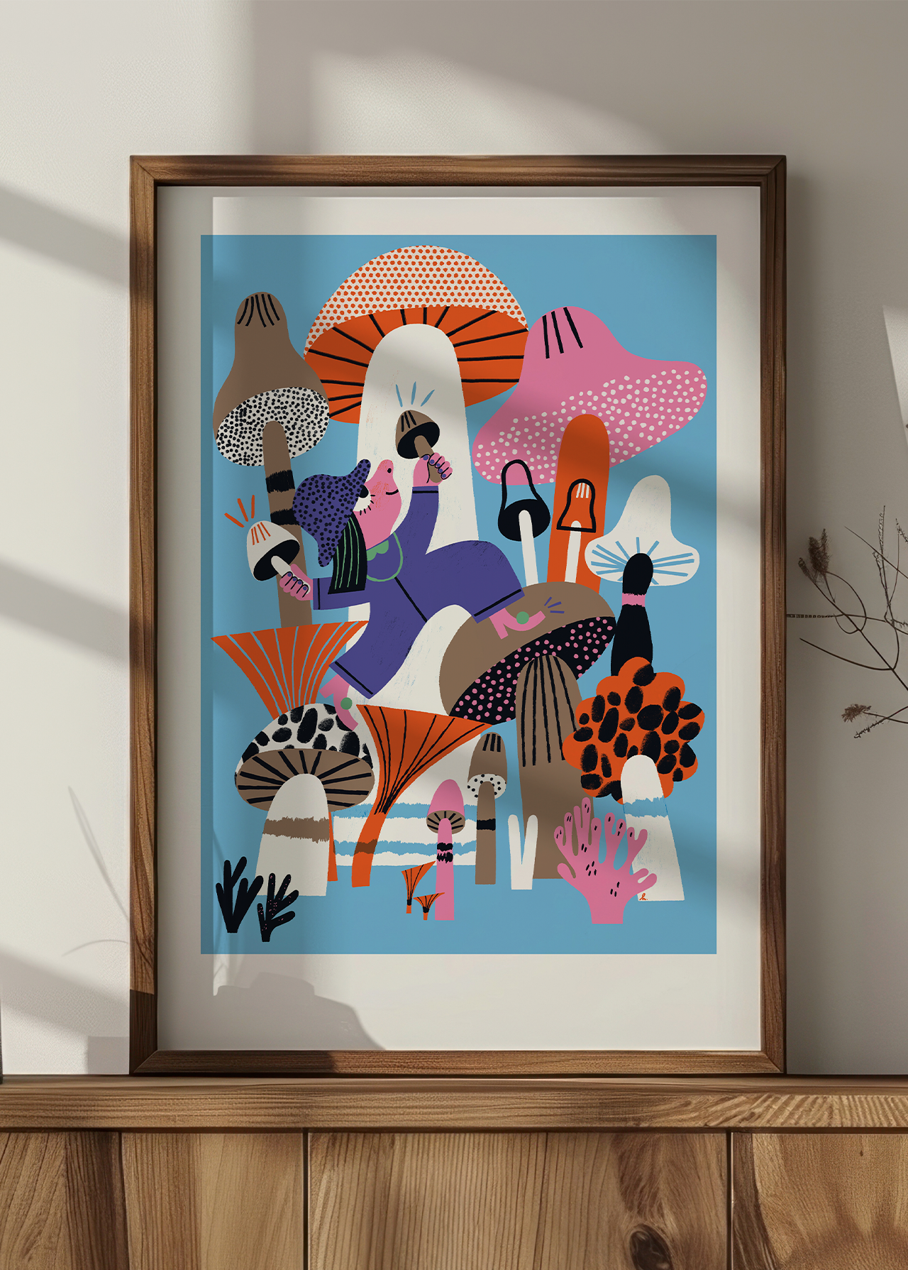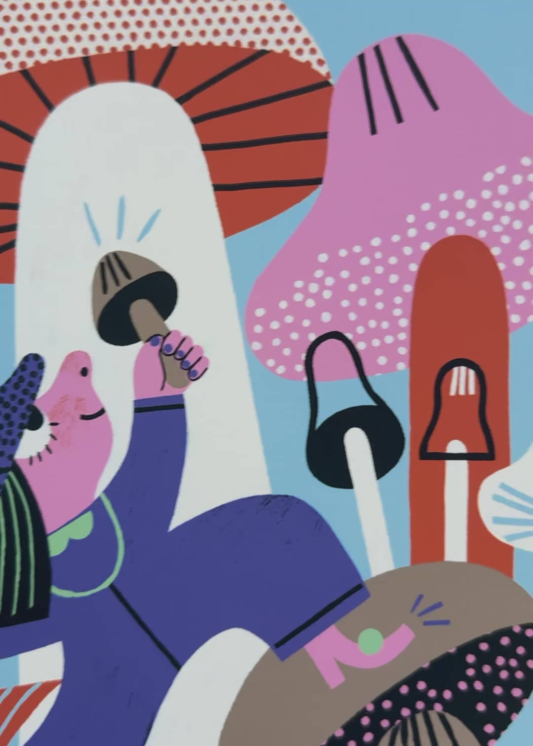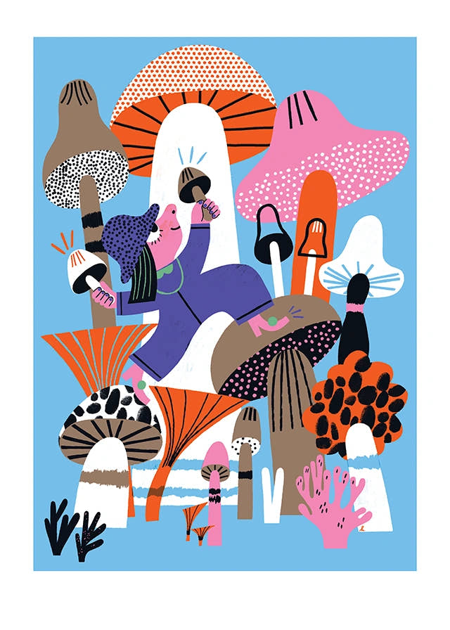 Mushroom picking, commissioned by Kulturaustausch: a tiny forager dances through towering fungi in candy-shop colours. Dotted caps and spotted stems turn the forest floor into a playful pattern parade.