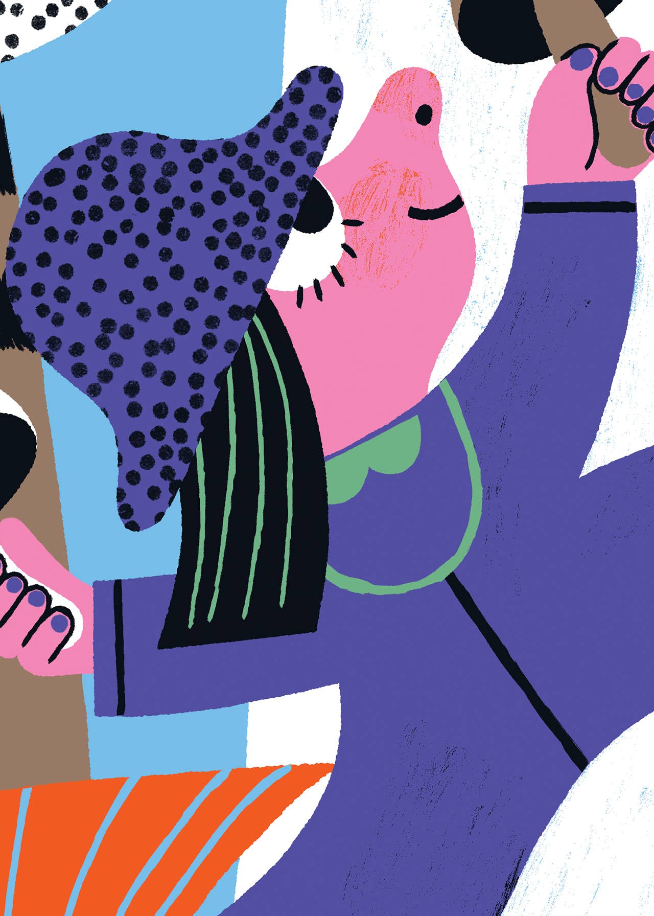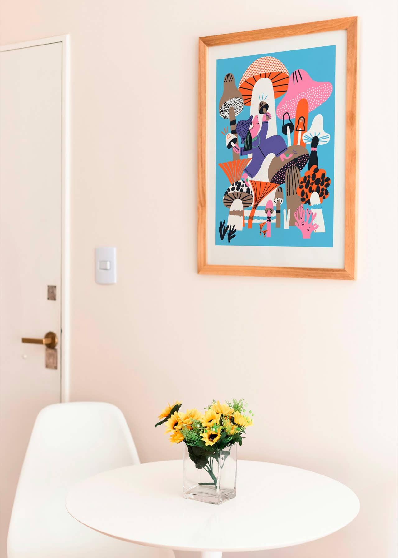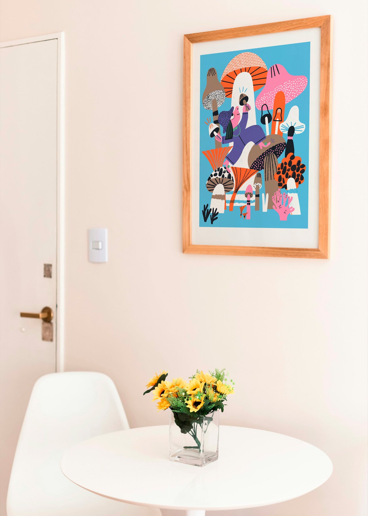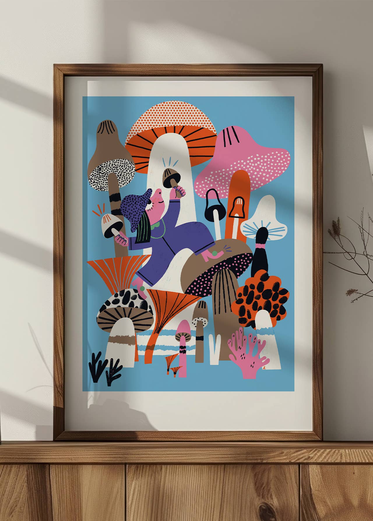 Mushroom picking, commissioned by Kulturaustausch: a tiny forager dances through towering fungi in candy-shop colours. Dotted caps and spotted stems turn the forest floor into a playful pattern parade.