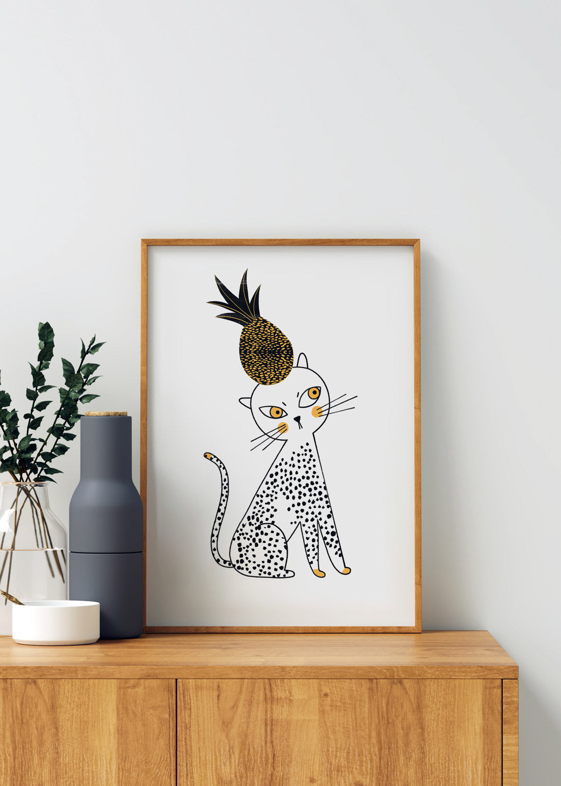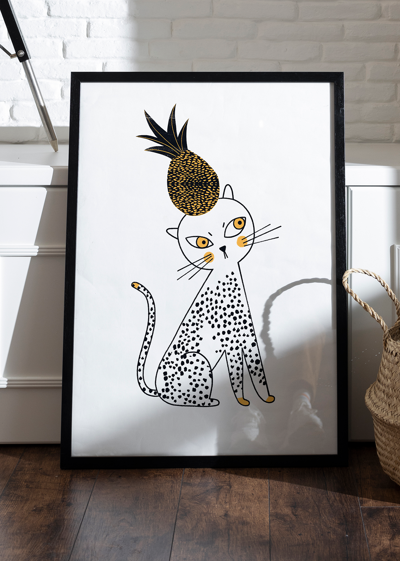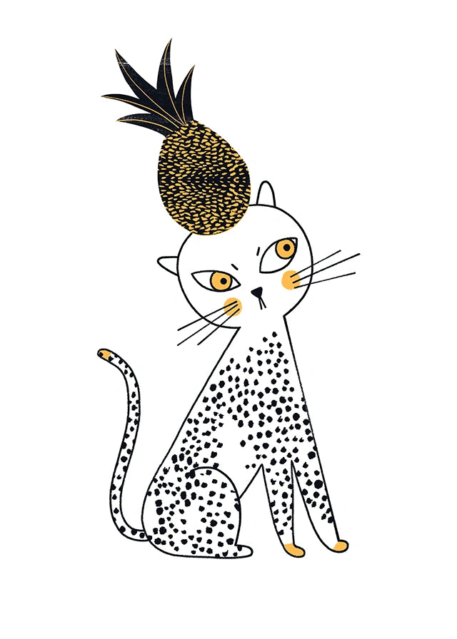 A playful cartoon shows a Mysterious cat balancing a pineapple on its head. Bold black lines and bright yellow accents create a cheerful, light-hearted mood.