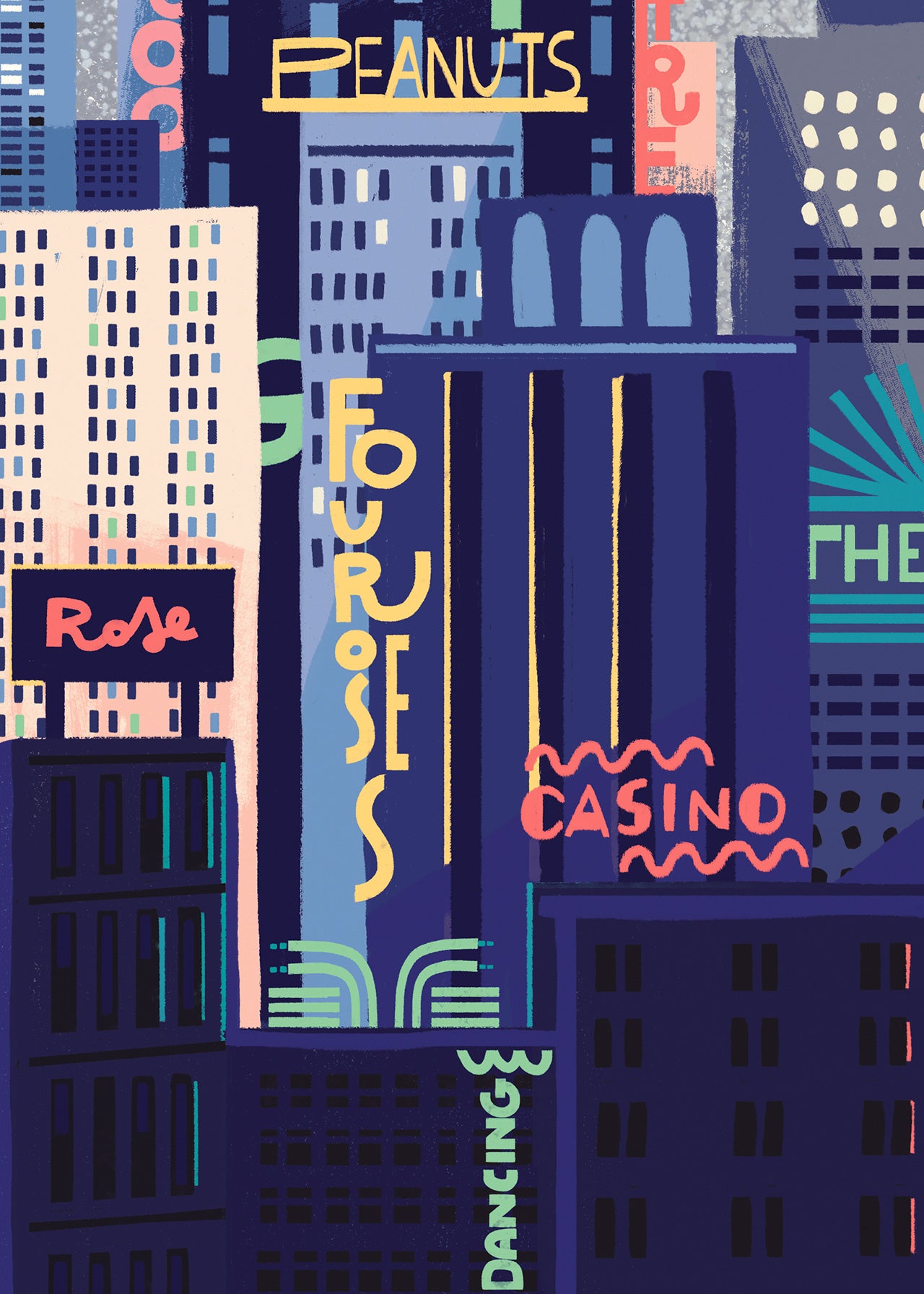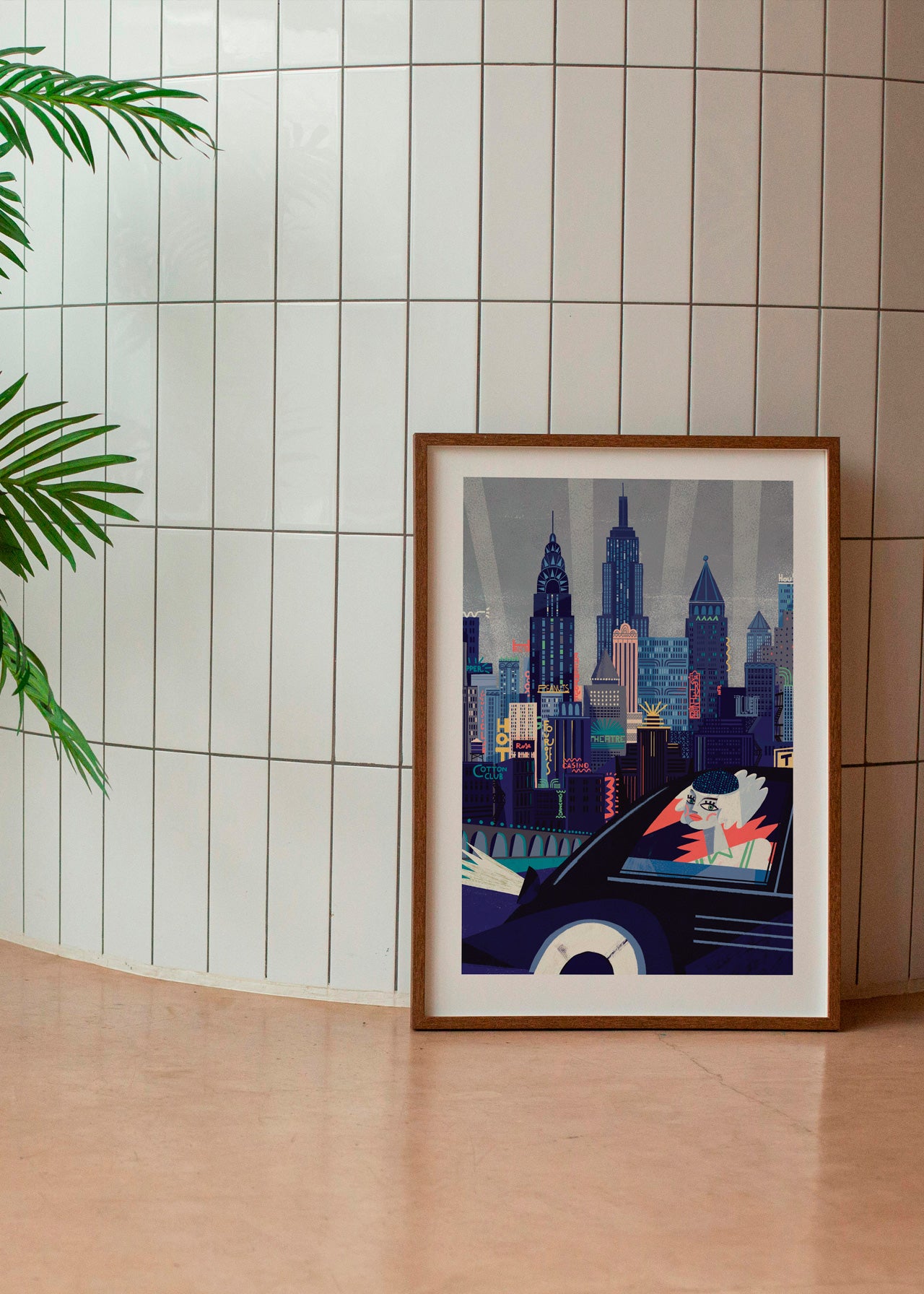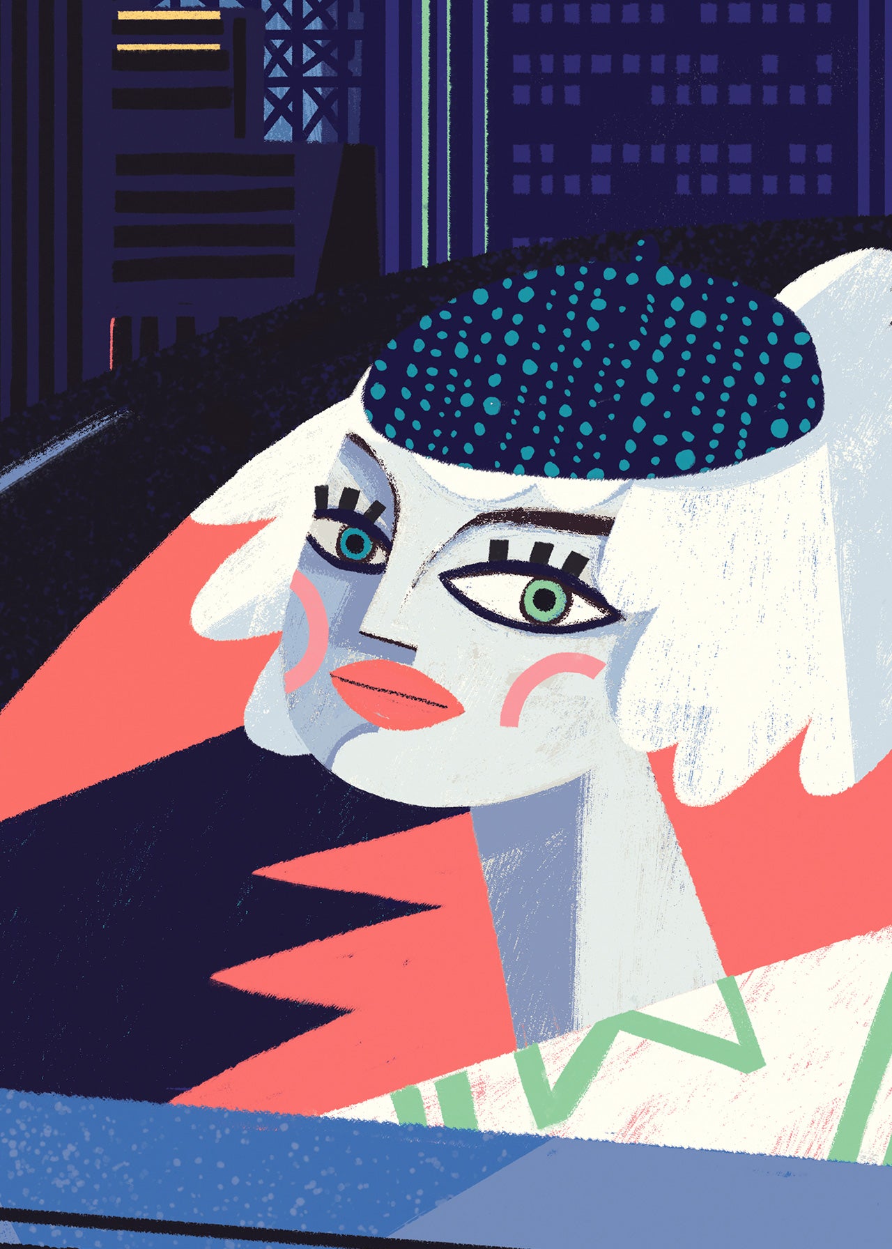 New York City, an Illustration for F. Scott Fitzgerald’s “The Pearl and the Fur” shows a sweeping 1930s New York skyline. A stylish woman rides past in a taxi beneath the towering buildings.
