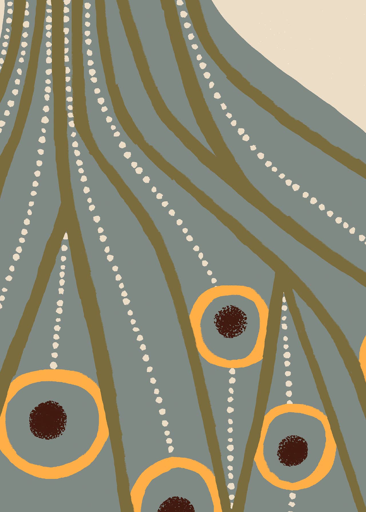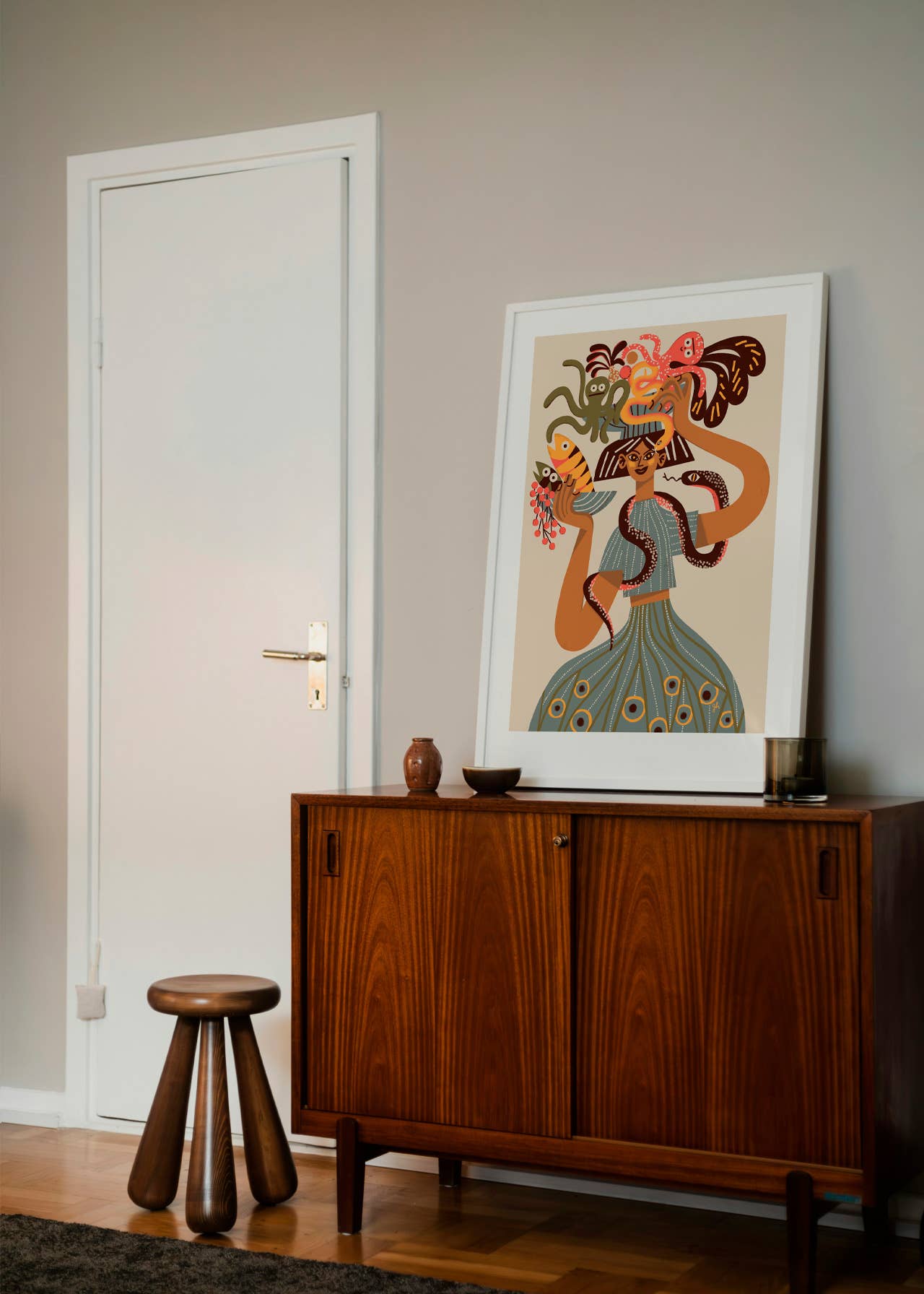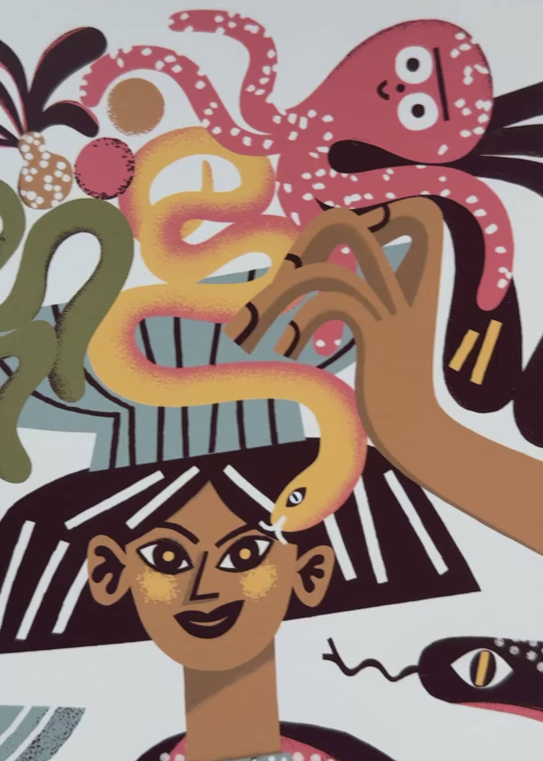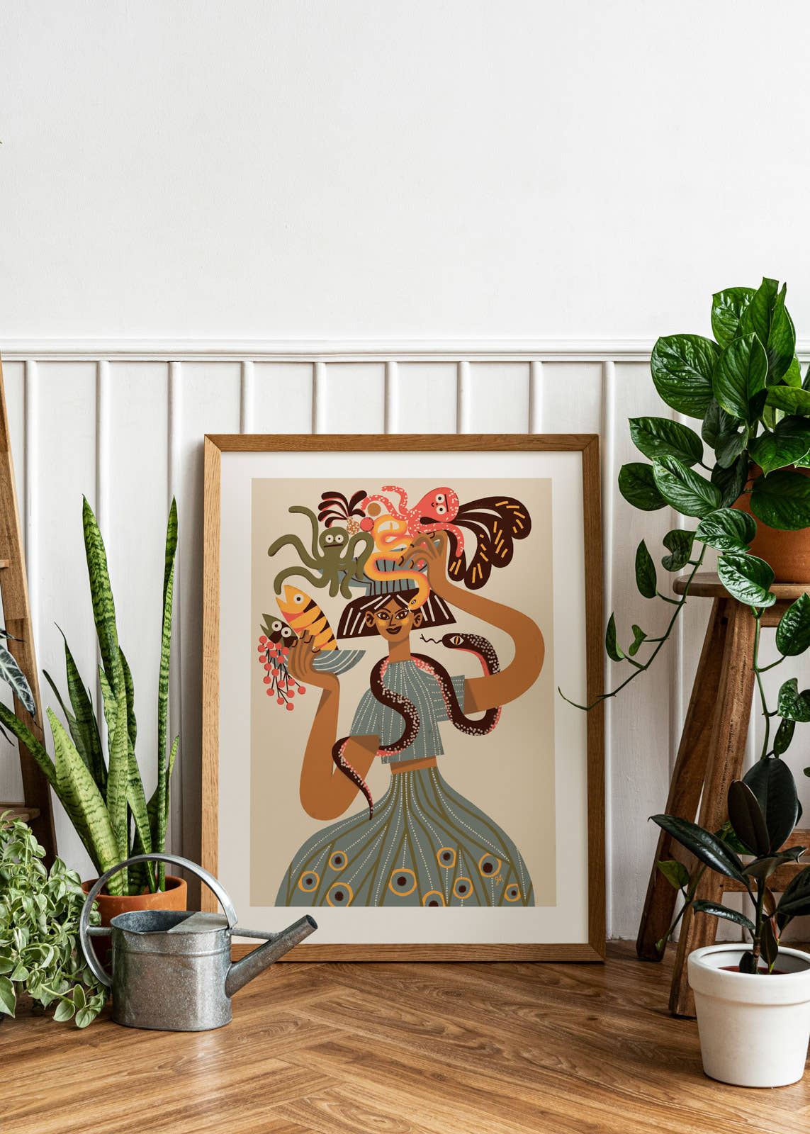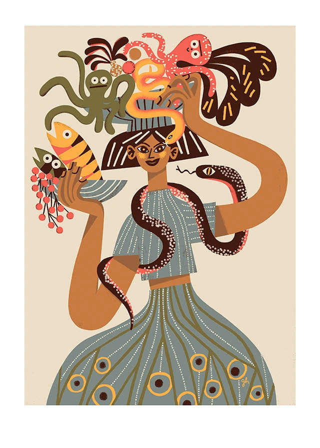 Sea market. A cheerful girl returns from the fish market, arms full of fresh catch and herbs. Still life, figure study and marine motifs converge in one lively print. A beige version of the illustration.