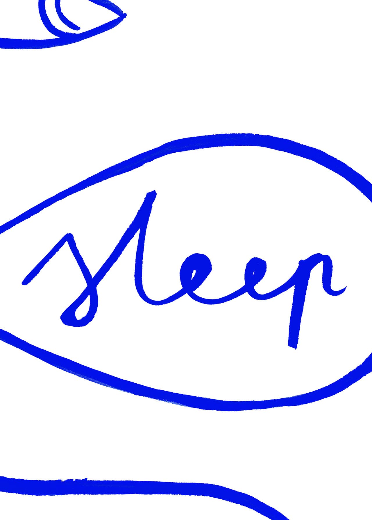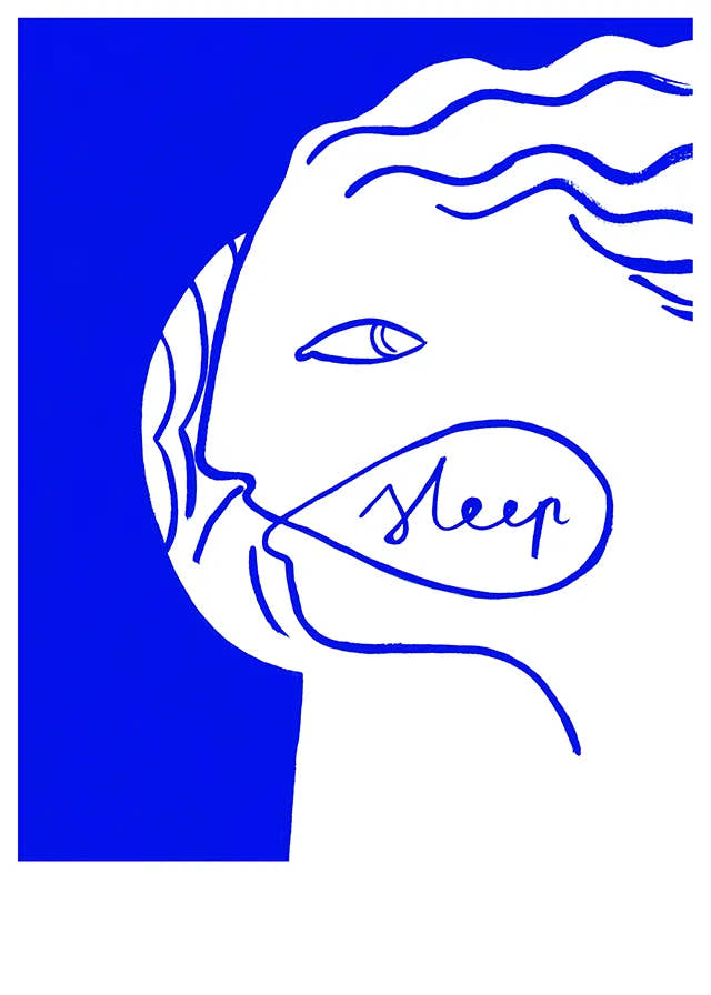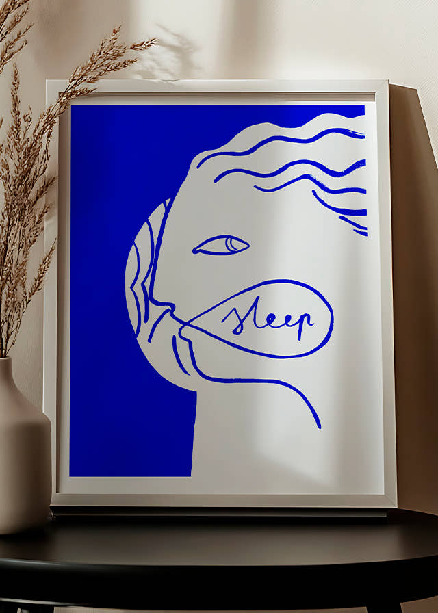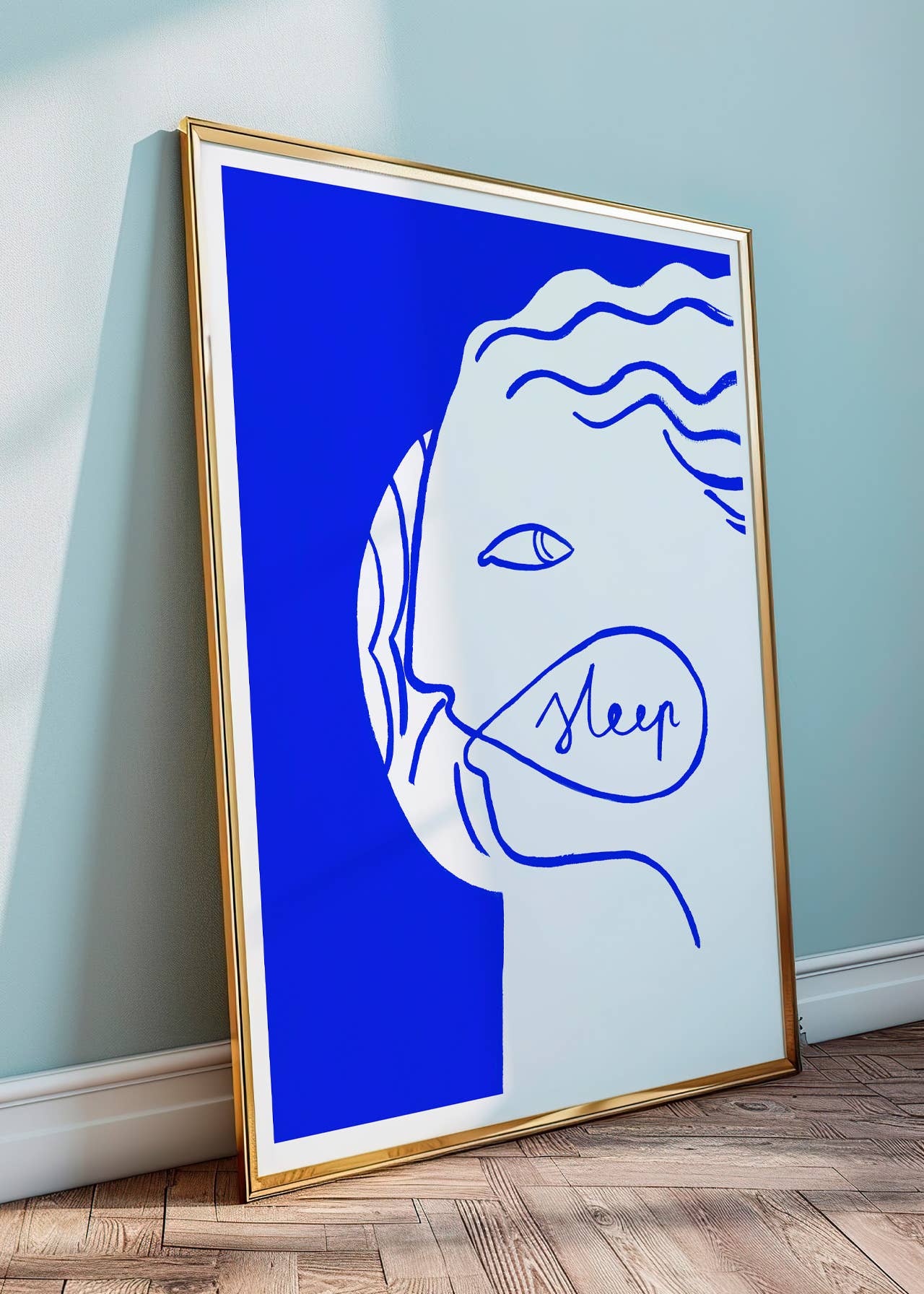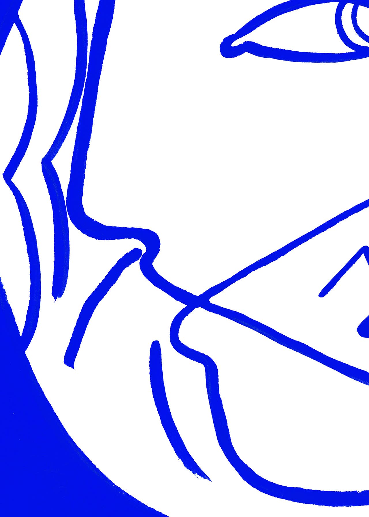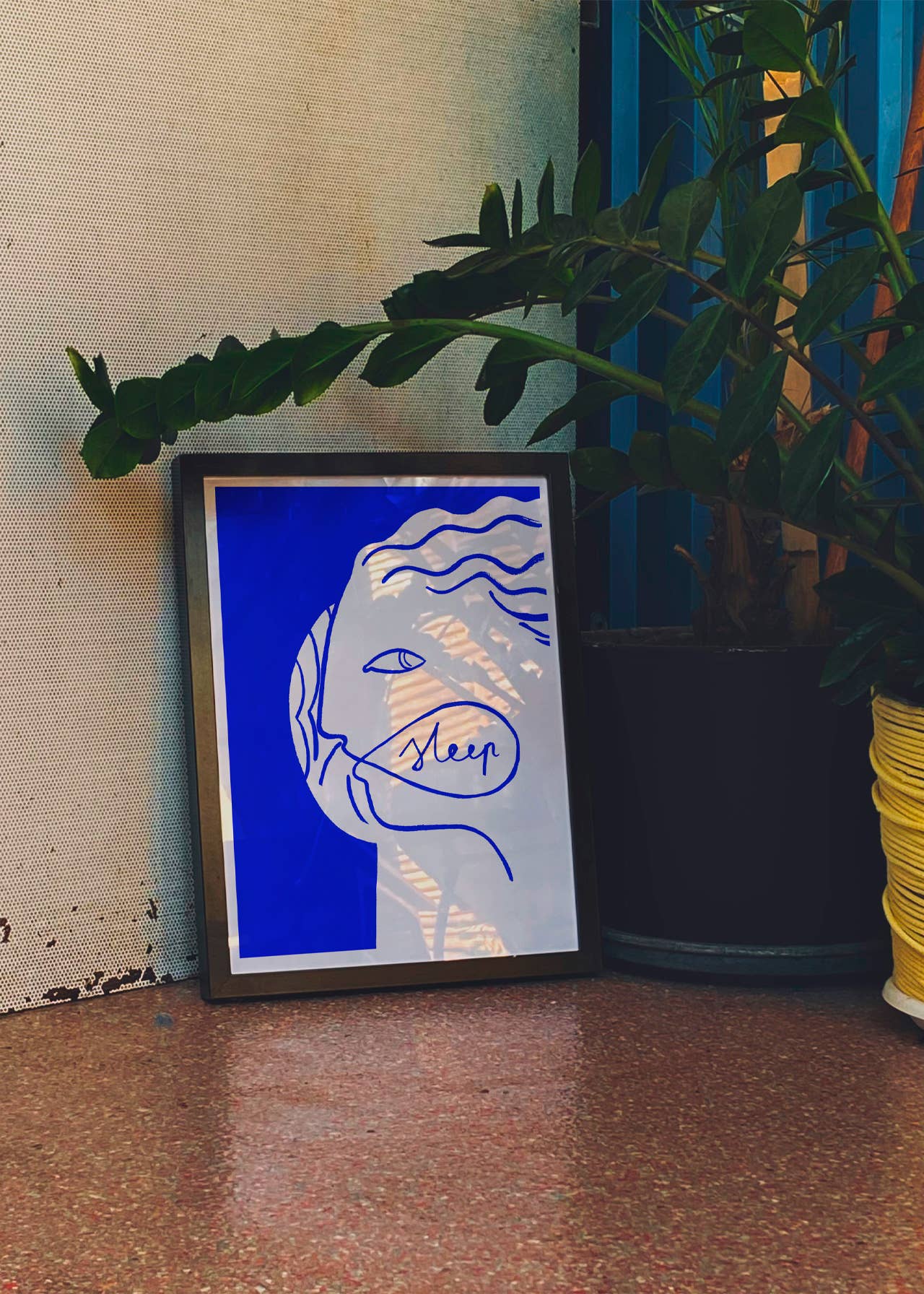 Print of my original gouache painting Sleeping in blue, which merges a single blue profile with a motif borrowed from ancient Greek vases and modern poster design.