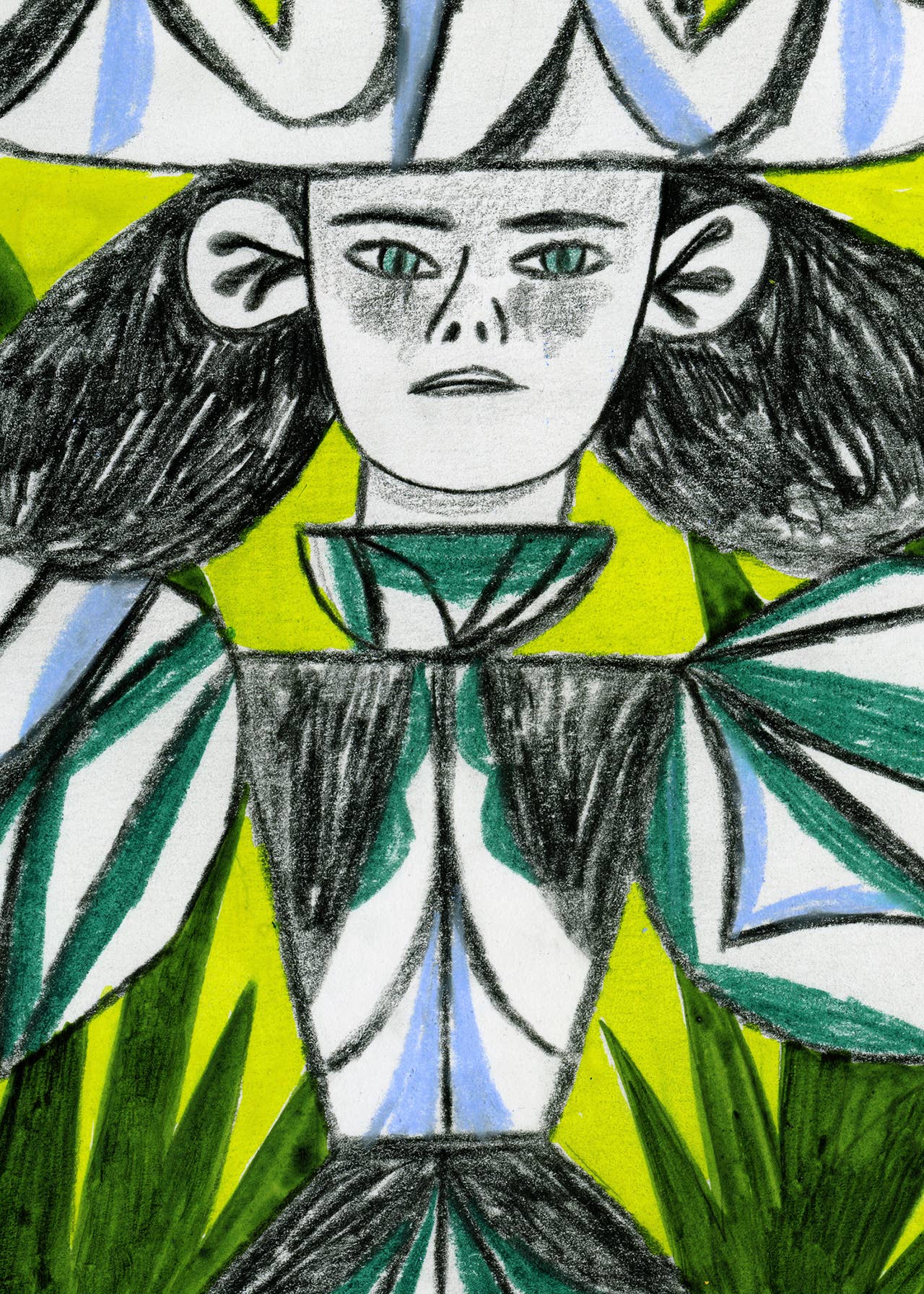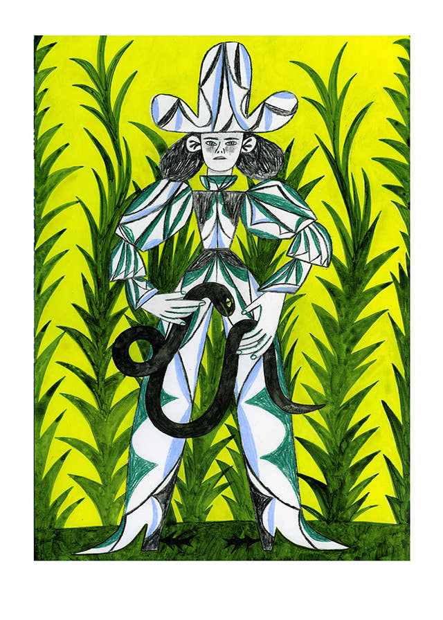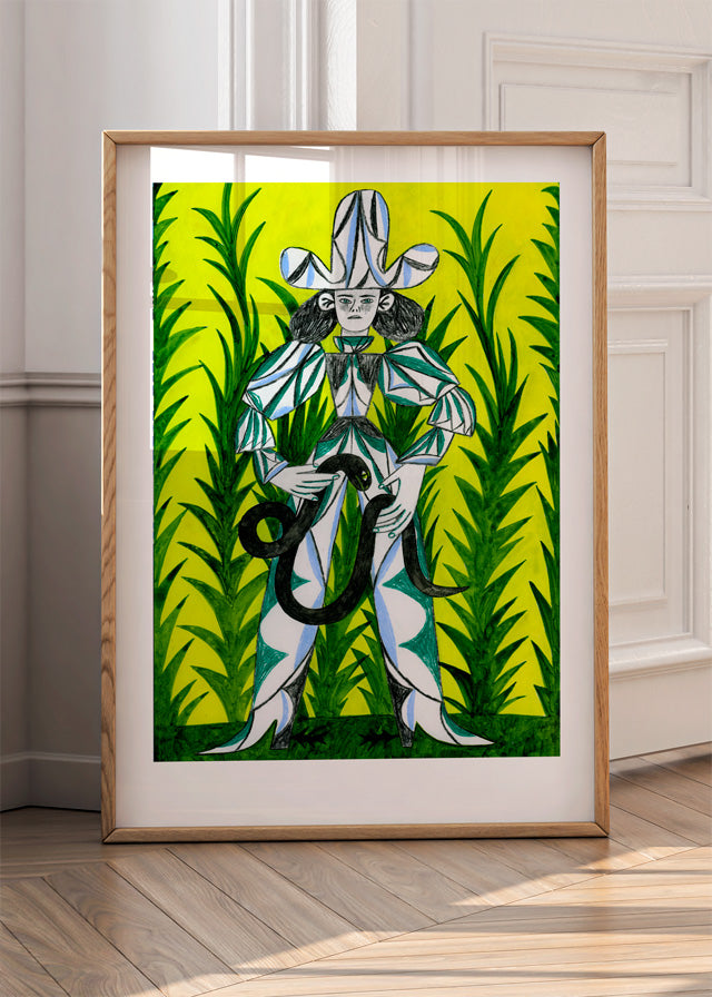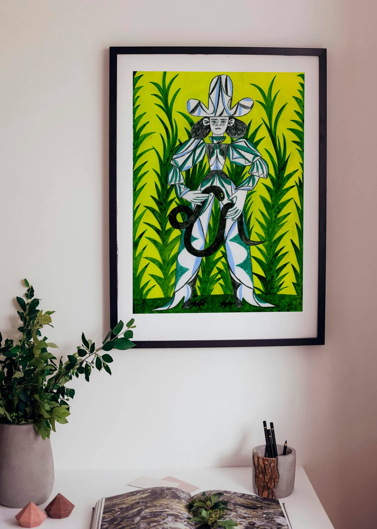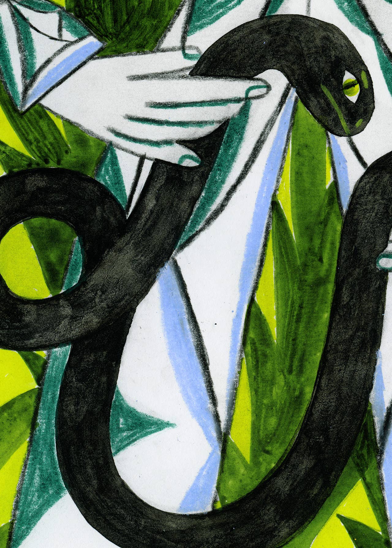 The original Snake hunter was painted with watercolour, gouache, and colored pencil on paper. I imagined a fearless woman who has caught a black mamba and is posing proudly with it.