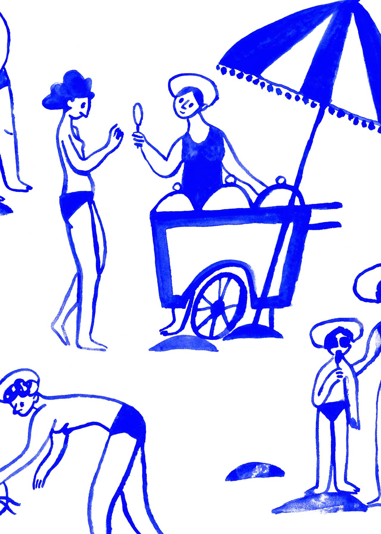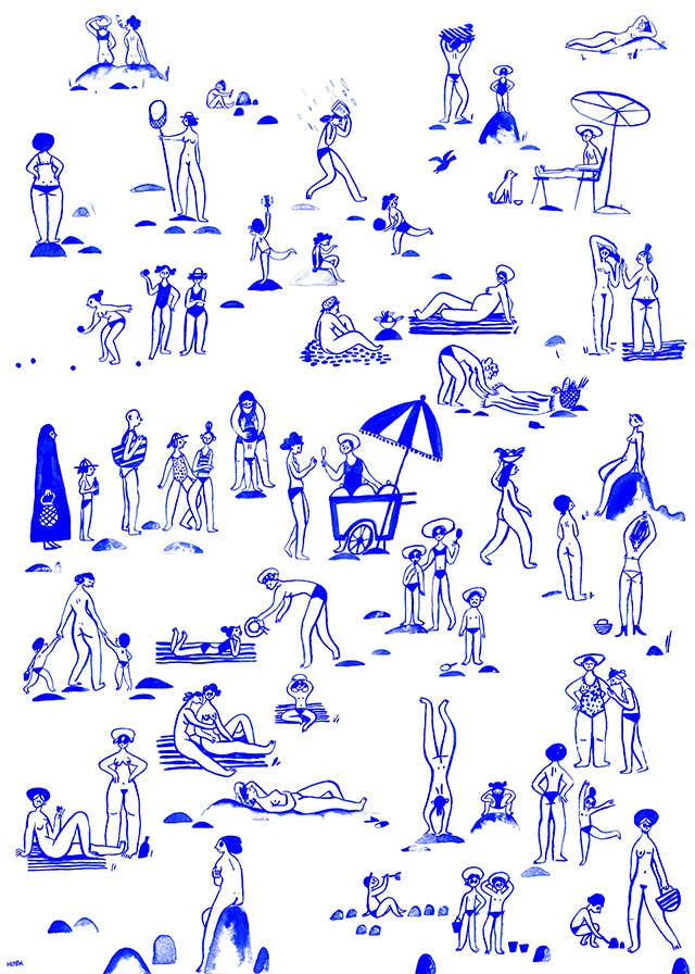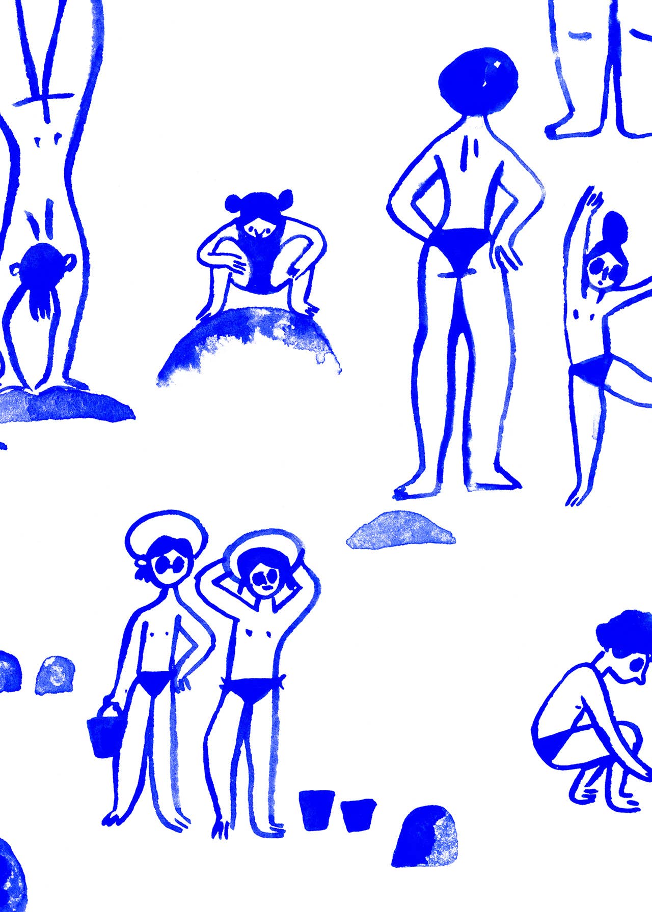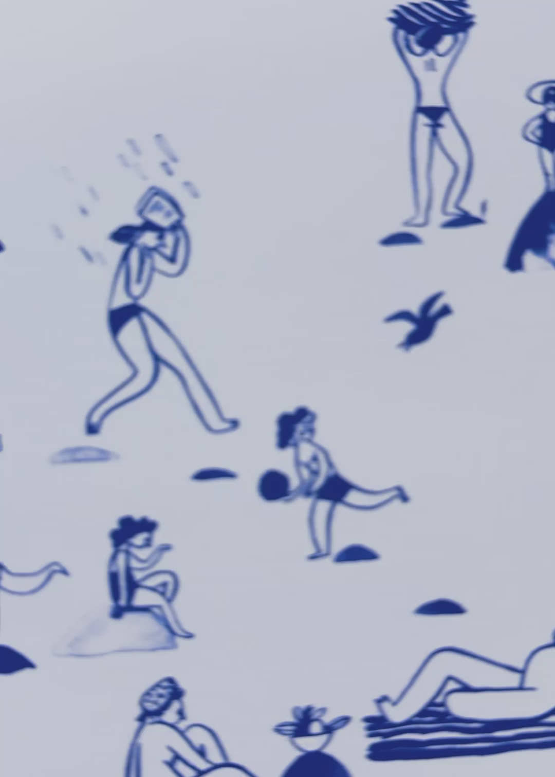 Summer of women is a peaceful collection of beach scenes, only women and children. A digital collage from small watercolour vignettes I painted in my sketchbook over several months. The blue-and-white palette comes from my love of Delphic ceramics.