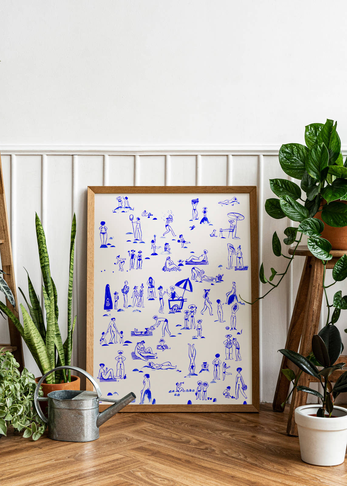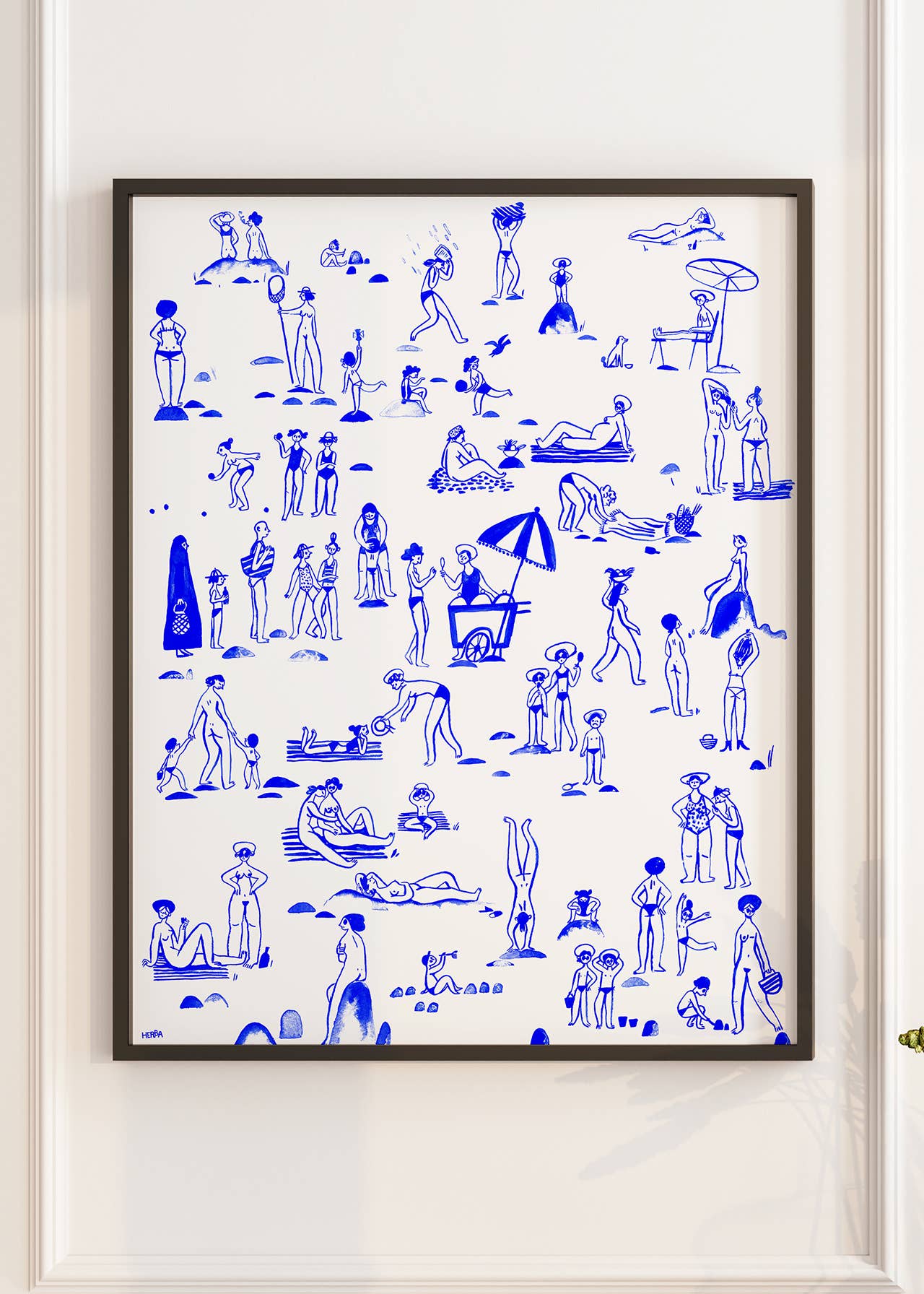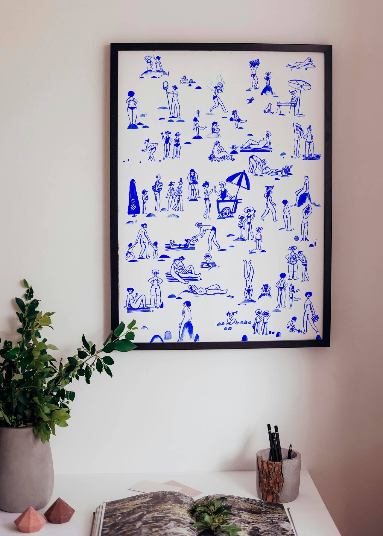 Summer of women is a peaceful collection of beach scenes, only women and children. A digital collage from small watercolour vignettes I painted in my sketchbook over several months. The blue-and-white palette comes from my love of Delphic ceramics.