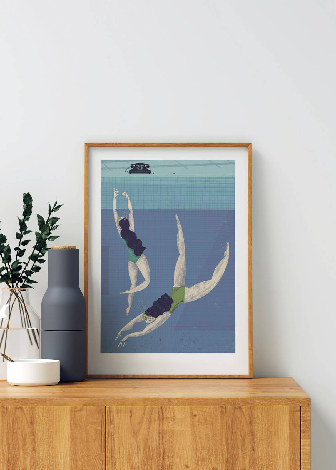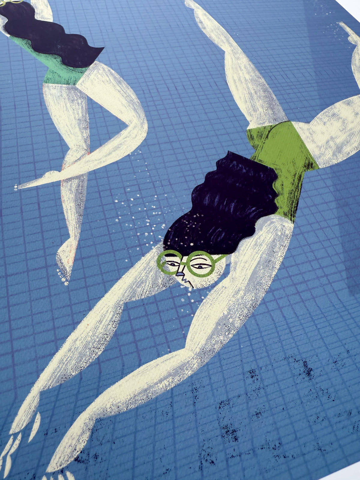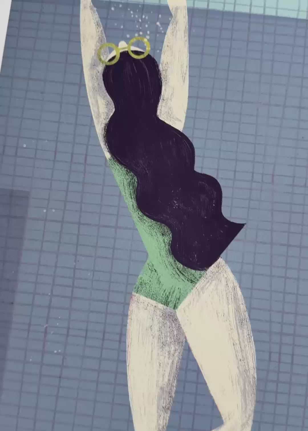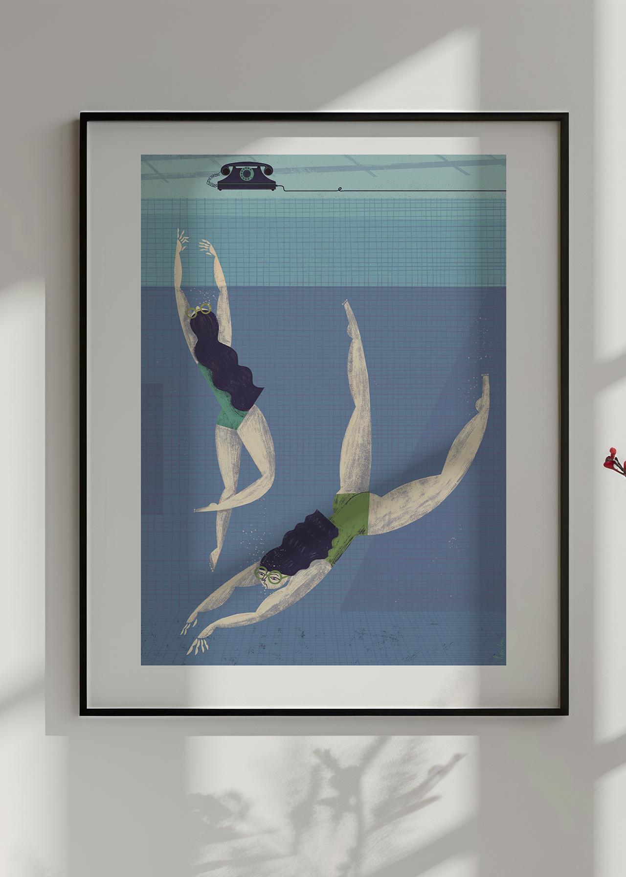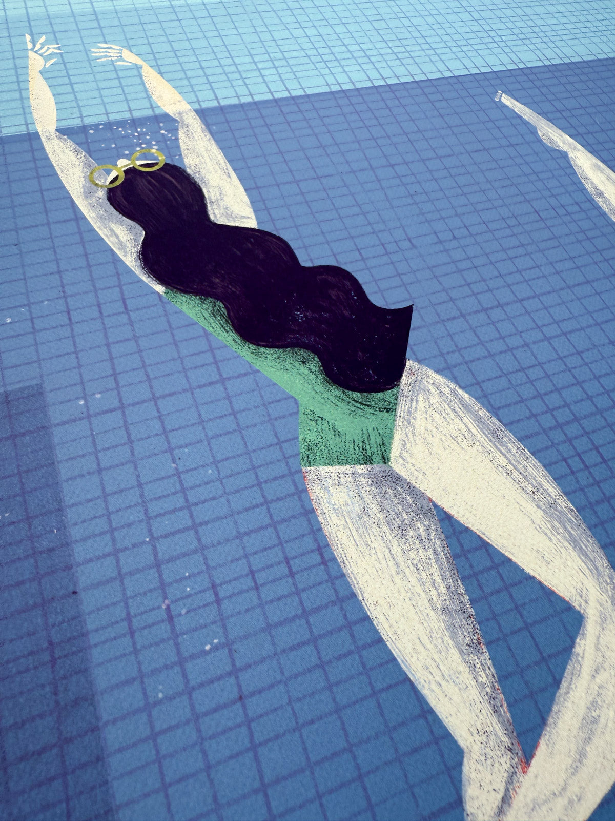 I learned to swim only as an adult. Swimming pool, my early digital illustration captures the calm and quiet of two women diving gracefully into a still pool, a scene that always makes me think of the deep, steady calm you only find in water.