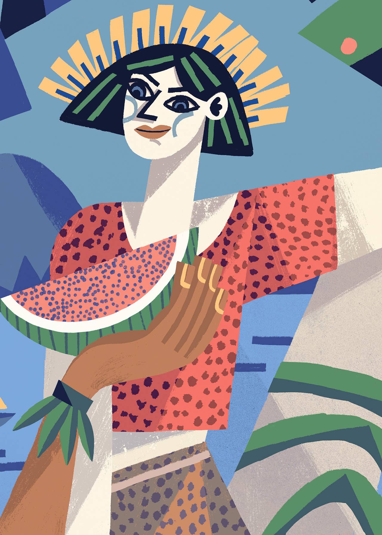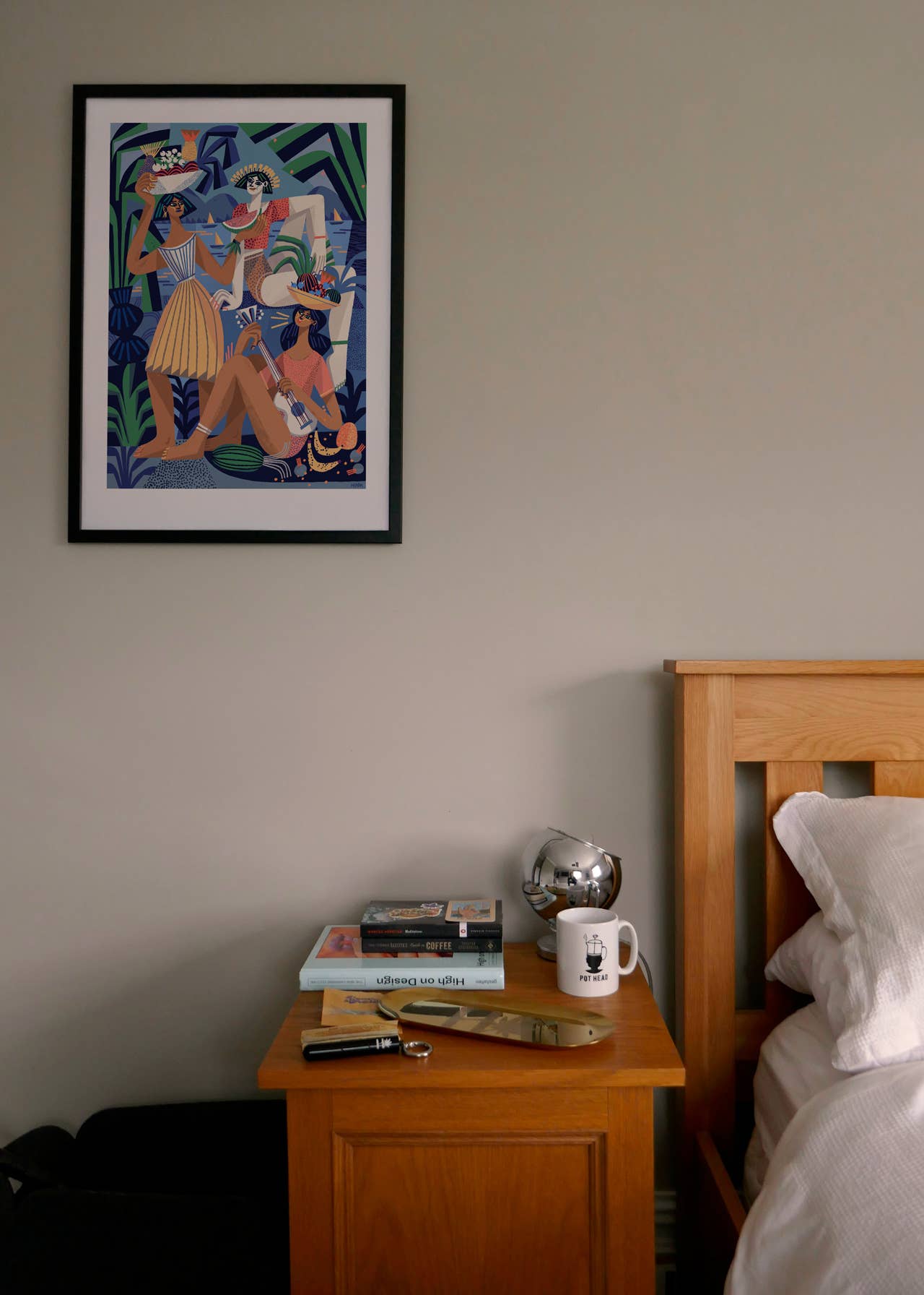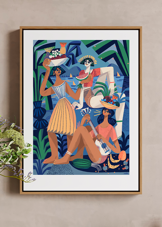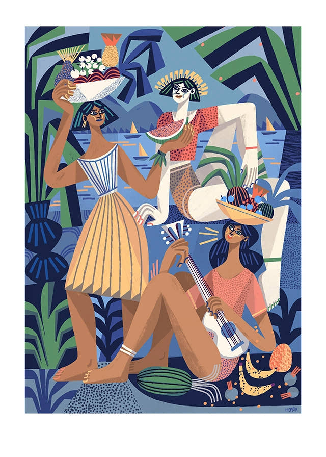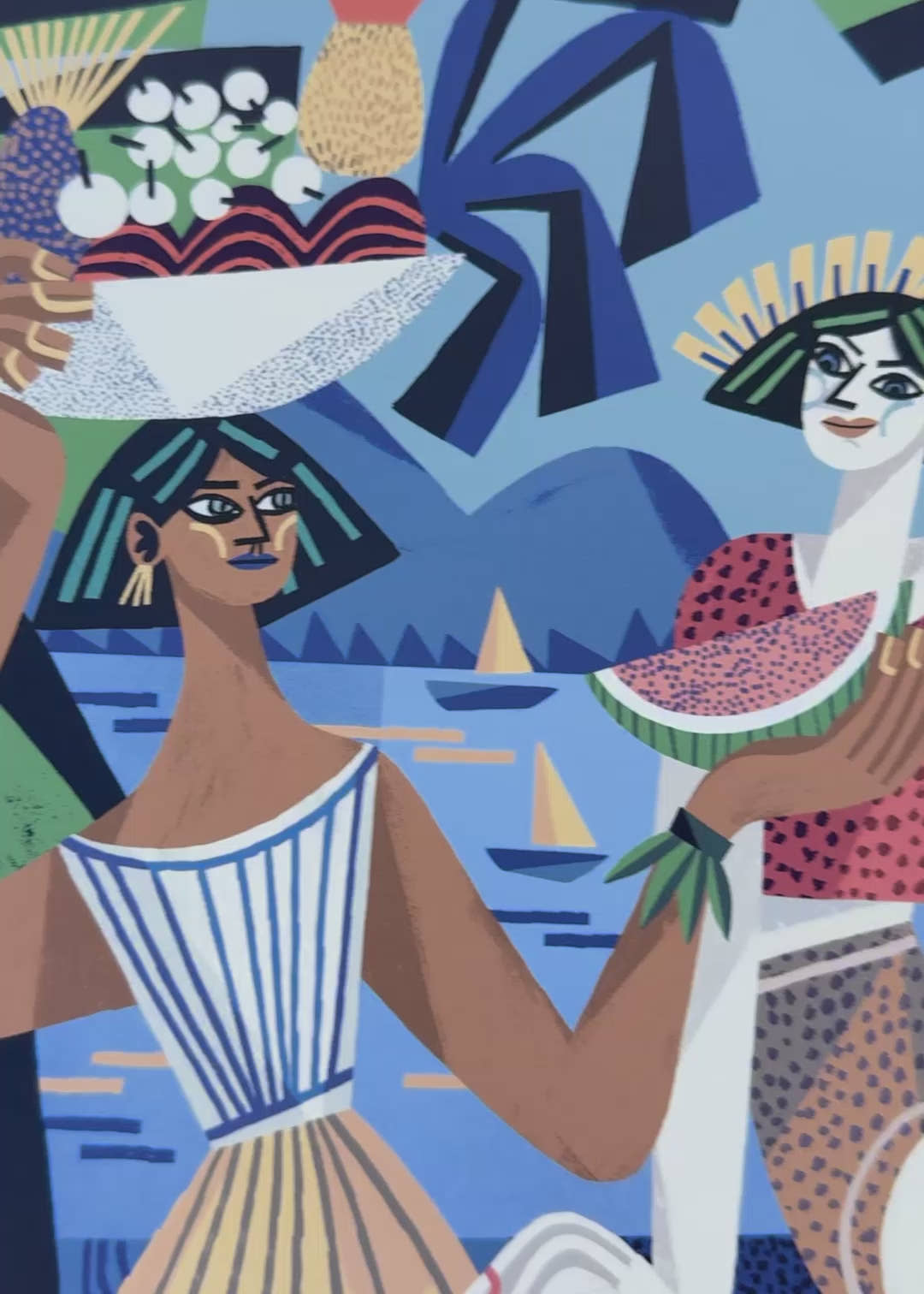 Tourist, a colourful genre scene, giclée-printed from my original gouache artwork, shows three women relaxing together, one of them gently playing the guitar.