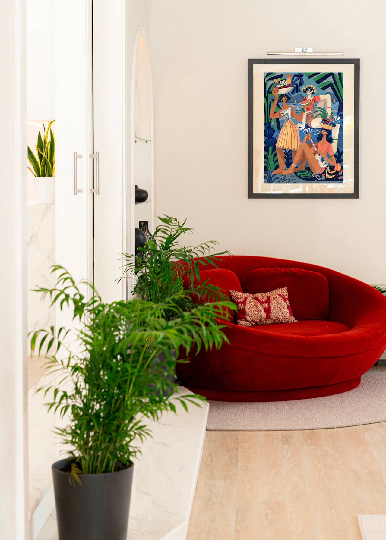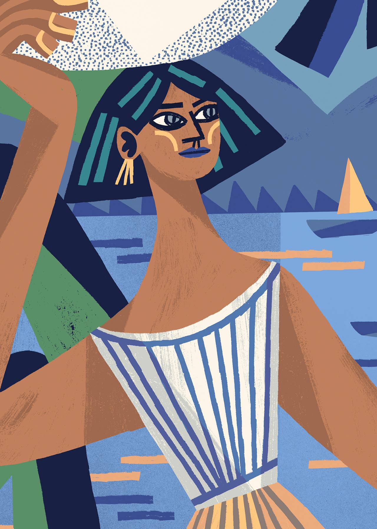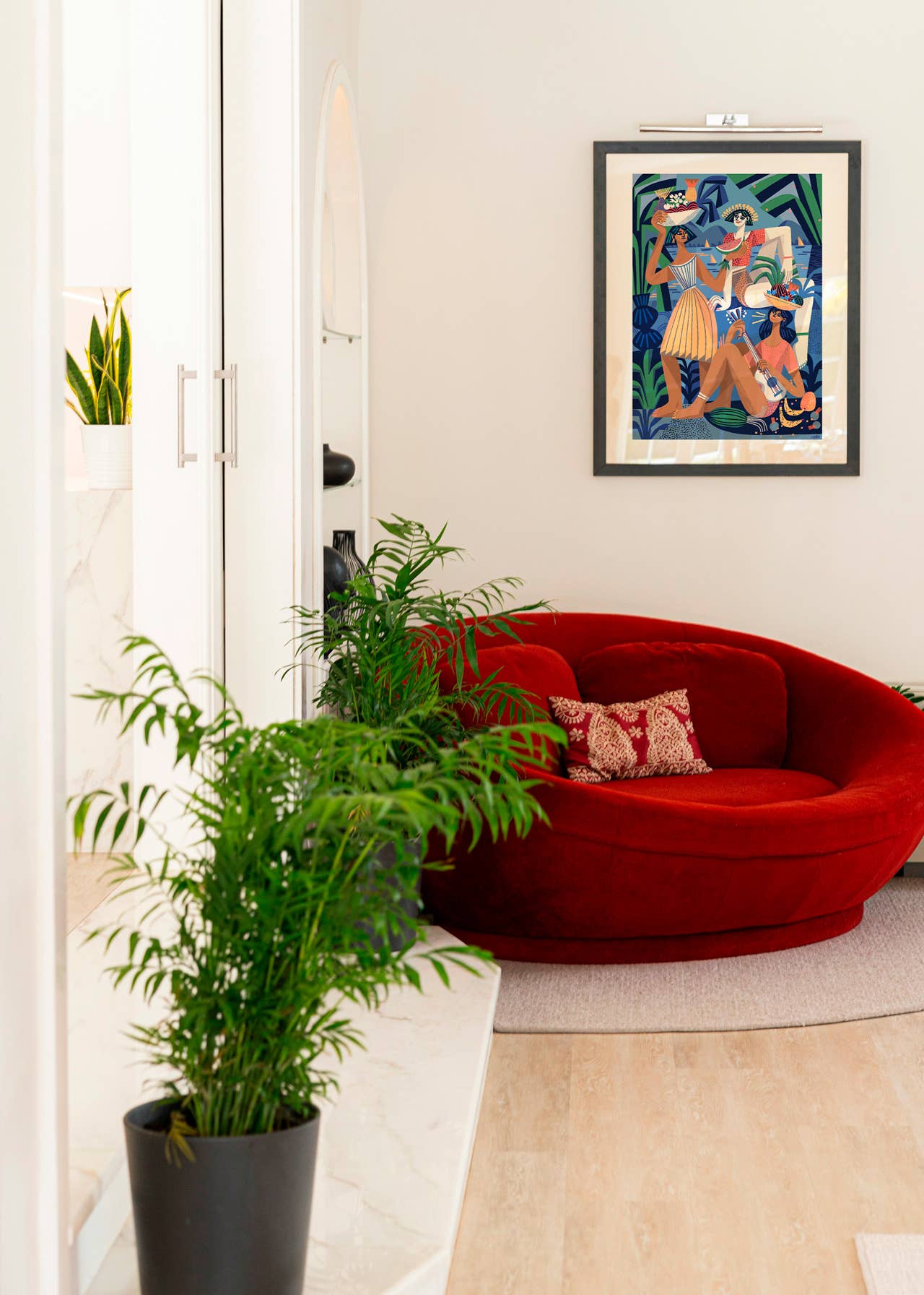 Tourist, a colourful genre scene, giclée-printed from my original gouache artwork, shows three women relaxing together, one of them gently playing the guitar.