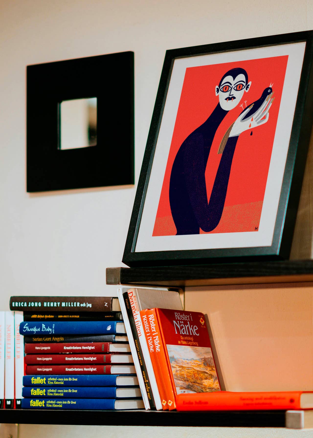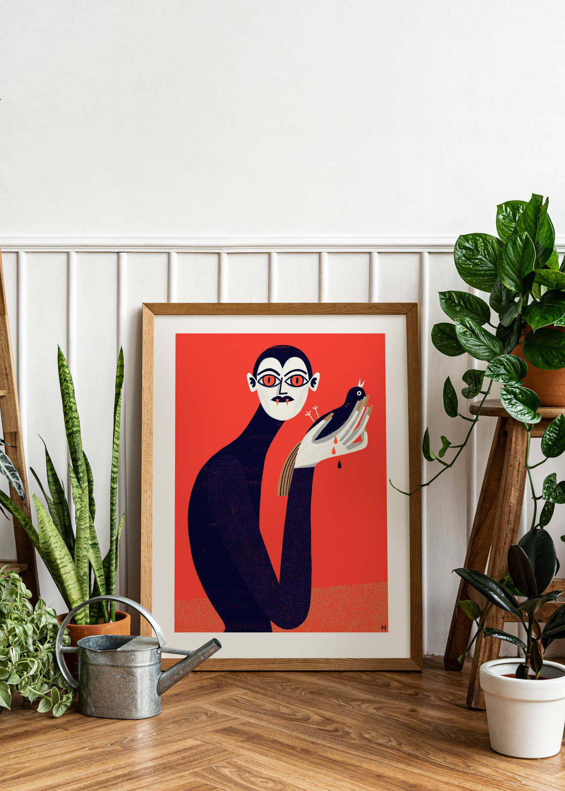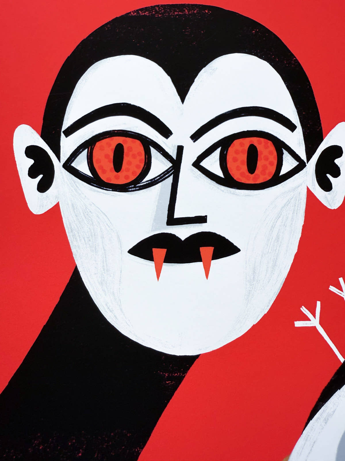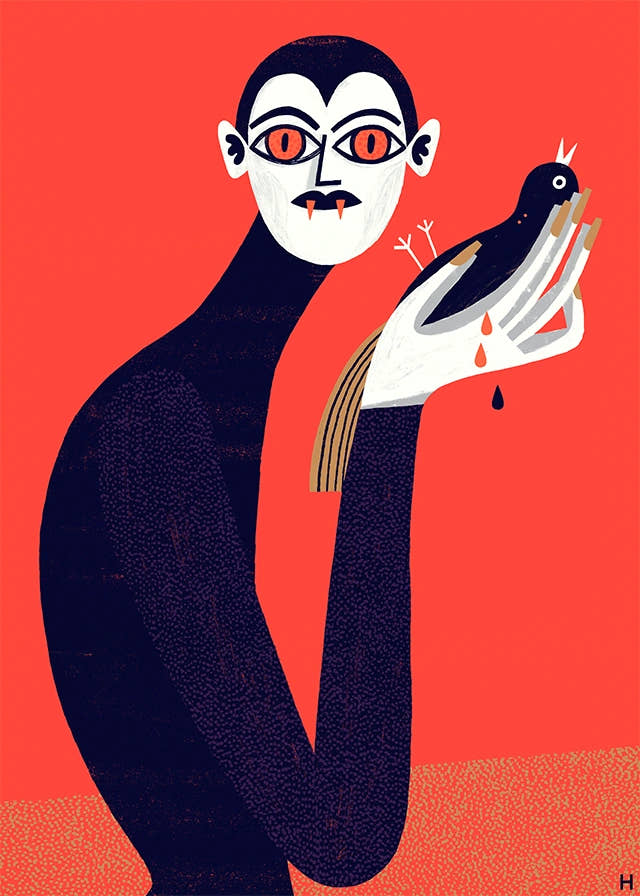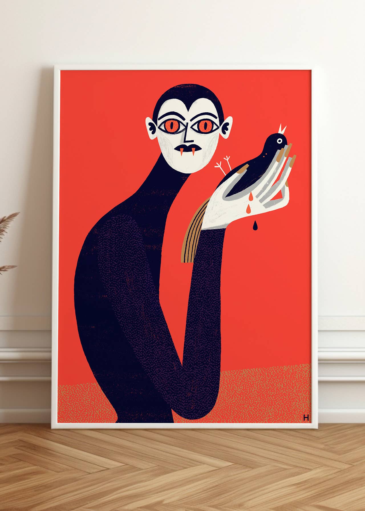 One of my most popular works: a vampire on a diet who couldn't resist temptation. The character design nods to the silent-era film Les Vampires.